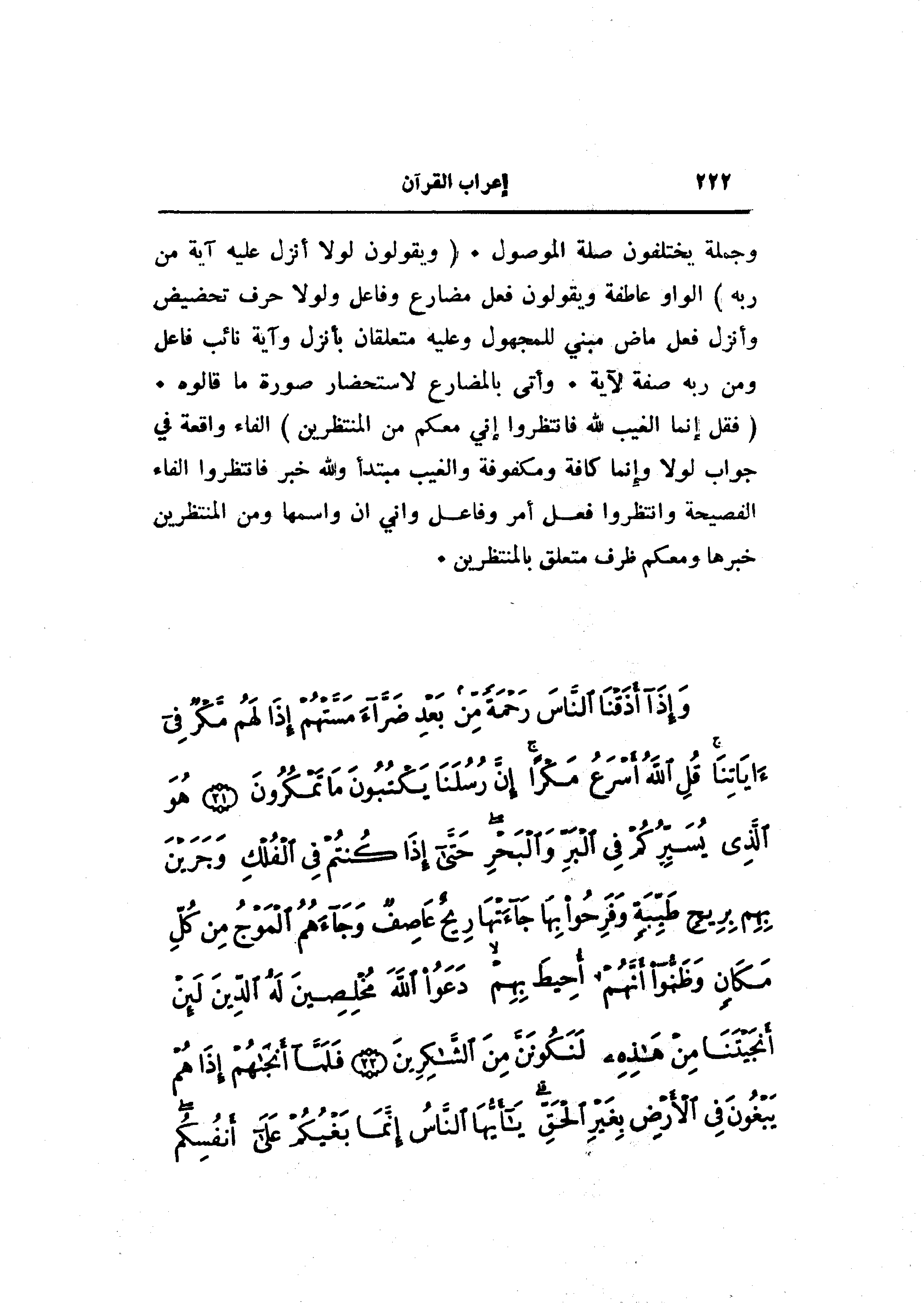 وَإِذا أَذَقْنَا النَّاسَ رَحْمَةً مِنْ بَعْدِ ضَرَّاءَ مَسَّتْهُمْ إِذا لَهُمْ مَكْرٌ فِي آياتِنا قُلِ اللَّهُ أَسْرَعُ مَكْراً إِنَّ رُسُلَنا يَكْتُبُونَ ما تَمْكُرُونَ (21) هُوَ الَّذِي يُسَيِّرُكُمْ فِي الْبَرِّ وَالْبَحْرِ حَتَّى إِذا كُنْتُمْ فِي الْفُلْكِ وَجَرَيْنَ بِهِمْ بِرِيحٍ طَيِّبَةٍ وَفَرِحُوا بِها جاءَتْها رِيحٌ عاصِفٌ وَجاءَهُمُ الْمَوْجُ مِنْ كُلِّ مَكانٍ وَظَنُّوا أَنَّهُمْ أُحِيطَ بِهِمْ دَعَوُا اللَّهَ مُخْلِصِينَ لَهُ الدِّينَ لَئِنْ أَنْجَيْتَنا مِنْ هذِهِ لَنَكُونَنَّ مِنَ الشَّاكِرِينَ (22) فَلَمَّا أَنْجاهُمْ إِذا هُمْ يَبْغُونَ فِي الْأَرْضِ بِغَيْرِ الْحَقِّ يا أَيُّهَا النَّاسُ إِنَّما بَغْيُكُمْ عَلى أَنْفُسِكُمْ مَتاعَ الْحَياةِ الدُّنْيا ثُمَّ إِلَيْنا مَرْجِعُكُمْ فَنُنَبِّئُكُمْ بِما كُنْتُمْ تَعْمَلُونَ (23)