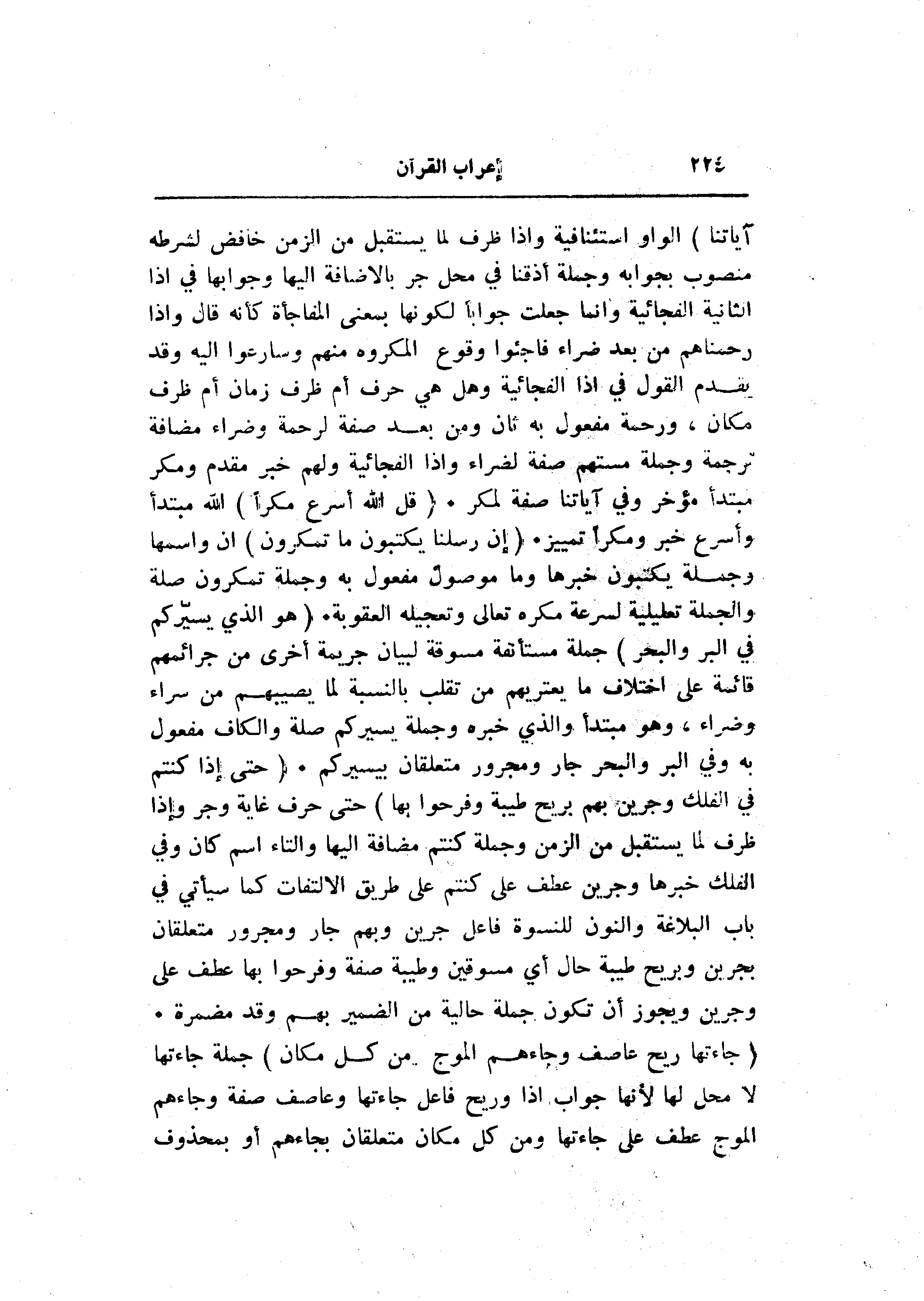الواو استئنافية وإذا ظرف لما يستقبل من الزمن خافض لشرطه منصوب بجوابه وجملة أذقنا في محل جر بالاضافة إليها وجوابها في إذا الثانية الفجائية وانما جعلت جوابا لكونها بمعنى المفاجأة كأنه قال وإذا رحمناهم من بعد ضراء فاجئوا وقوع المكروه منهم وسارعوا اليه وقد يقدم القول في إذا الفجائية وهل هي حرف أم ظرف زمان أم ظرف مكان، ورحمة مفعول به ثان ومن بعد صفة لرحمة وضراء مضافة ترجمة وجملة مستهم صفة لضراء وإذا الفجائية ولهم خبر مقدم ومكر مبتدأ مؤخر وفي آياتنا صفة لمكر. (قُلِ اللَّهُ أَسْرَعُ مَكْراً) الله مبتدأ وأسرع خبر ومكرا تمييز. (إِنَّ رُسُلَنا يَكْتُبُونَ ما تَمْكُرُونَ) ان واسمها وجملة يكتبون خبرها وما موصول مفعول به وجملة تمكرون صلة والجملة تعليلية لسرعة مكره تعالى وتعجيله العقوبة. (هُوَ الَّذِي يُسَيِّرُكُمْ فِي الْبَرِّ وَالْبَحْرِ) جملة مستأنفة مسوقة لبيان جريمة أخرى من جرائمهم قائمة على اختلاف ما يعتريهم من تقلب بالنسبة لما يصيبهم من سراء وضراء، وهو مبتدأ والذي خبره وجملة يسيركم صلة والكاف مفعول به وفي البر والبحر جار ومجرور متعلقان بيسيركم. (حَتَّى إِذا كُنْتُمْ فِي الْفُلْكِ وَجَرَيْنَ بِهِمْ بِرِيحٍ طَيِّبَةٍ وَفَرِحُوا بِها) حتى حرف غاية وجر وإذا ظرف لما يستقبل من الزمن وجملة كنتم مضافة إليها والتاء اسم كان وفي الفلك خبرها وجرين عطف على كنتم على طريق الالتفات كما سيأتي في باب البلاغة والنون للنسوة فاعل جرين وبهم جار ومجرور متعلقان بجرين وبريح طيبة حال أي مسوقين وطيبة صفة وفرحوا بها عطف على وجرين ويجوز أن تكون جملة حالية من الضمير بهم وقد مضمرة.