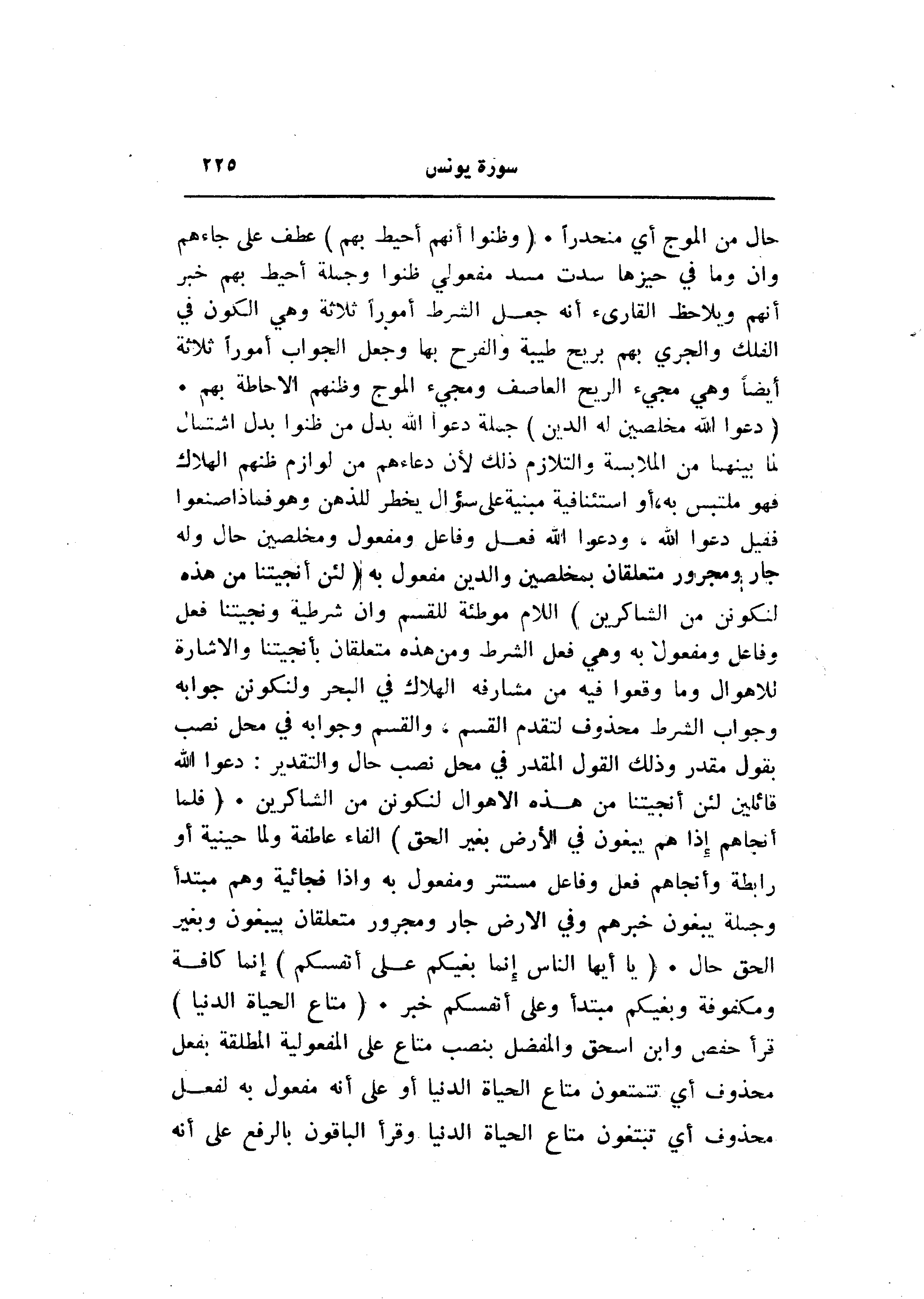 (دَعَوُا اللَّهَ مُخْلِصِينَ لَهُ الدِّينَ) جملة دعوا الله بدل من ظنوا بدل اشتمال لما بينهما من الملابسة والتلازم ذلك لأن دعاءهم من لوازم ظنهم الهلاك فهو ملتبس به، أو استئنافية مبنية على سؤال يخطر للذهن وهو فماذا صنعوا فقيل دعوا الله، ودعوا الله فعل وفاعل ومفعول ومخلصين حال وله جار ومجرور متعلقان بمخلصين والدين مفعول به (لَئِنْ أَنْجَيْتَنا مِنْ هذِهِ لَنَكُونَنَّ مِنَ الشَّاكِرِينَ) اللام موطئة للقسم وان شرطية ونجيتنا فعل وفاعل ومفعول به وهي فعل الشرط ومن هذه متعلقان بأنجيتنا والاشارة للاهوال وما وقعوا فيه من مشارفه الهلاك في البحر ولنكونن جوابه وجواب الشرط محذوف لتقدم القسم، والقسم وجوابه في محل نصب بقول مقدر وذلك القول المقدر في محل نصب حال والتقدير: دعوا الله قائلين لئن أنجيتنا من هذه الأهوال لنكونن من الشاكرين. (فَلَمَّا أَنْجاهُمْ إِذا هُمْ يَبْغُونَ فِي الْأَرْضِ بِغَيْرِ الْحَقِّ) الفاء عاطفة ولما حينية أو رابطة وأنجاهم فعل وفاعل مستتر ومفعول به وإذا فجائية وهم مبتدأ وجملة يبغون خبرهم وفي الأرض جار ومجرور متعلقان بيبغون وبغير الحق حال. (يا أَيُّهَا النَّاسُ إِنَّما بَغْيُكُمْ عَلى أَنْفُسِكُمْ) إنما كافة ومكفوفة وبغيكم مبتدأ وعلى أنفسكم خبر. (مَتاعَ الْحَياةِ الدُّنْيا) قرأ حفص وابن اسحق والمفضل بنصب متاع على المفعولية المطلقة بفعل محذوف أي تتمتعون متاع الحياة الدنيا أو على أنه مفعول به لفعل محذوف أي تبتغون متاع الحياة الدنيا وقرأ الباقون بالرفع على أنه