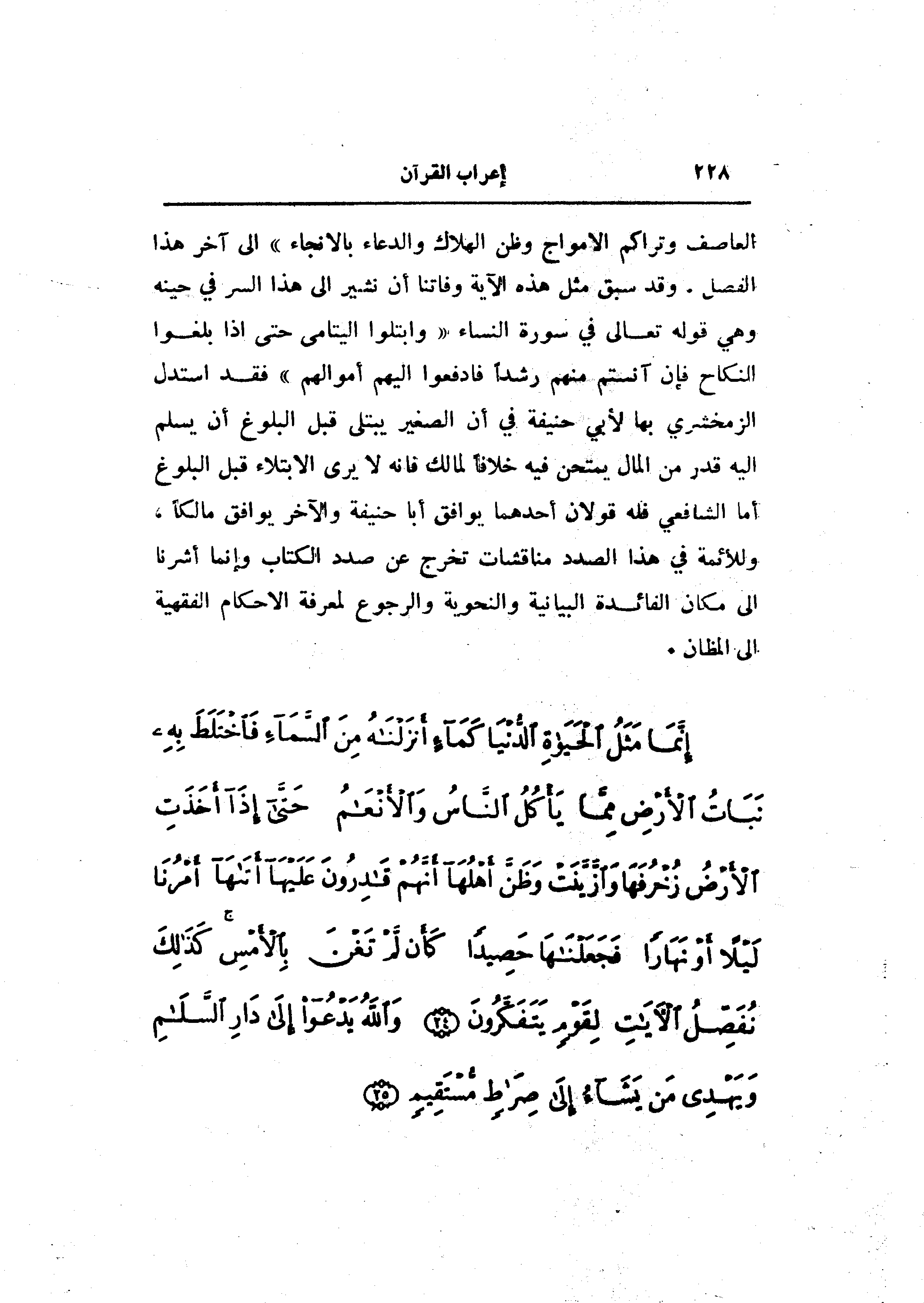 العاصف وتراكم الأمواج وظن الهلاك والدعاء بالانجاء» الى آخر هذا الفصل. وقد سبق مثل هذه الآية وفاتنا أن نشير الى هذا السر في حينه وهي قوله تعالى في سورة النساء «وابتلوا اليتامى حتى إذا بلغوا النكاح فإن آنستم منهم رشدا فادفعوا إليهم أموالهم» فقد استدل الزمخشري بها لأبي حنيفة في أن الصغير يبتلى قبل البلوغ أن يسلم اليه قدر من المال يمتحن فيه خلافا لما لك فانه لا يرى الابتلاء قبل البلوغ أما الشافعي فله قولان أحدهما يوافق أبا حنيفة والآخر يوافق مالكا، وللأئمة في هذا الصدد مناقشات تخرج عن صدد الكتاب وإنما أشرنا الى مكان الفائدة البيانية والنحوية والرجوع لمعرفة الاحكام الفقهية الى المظان.