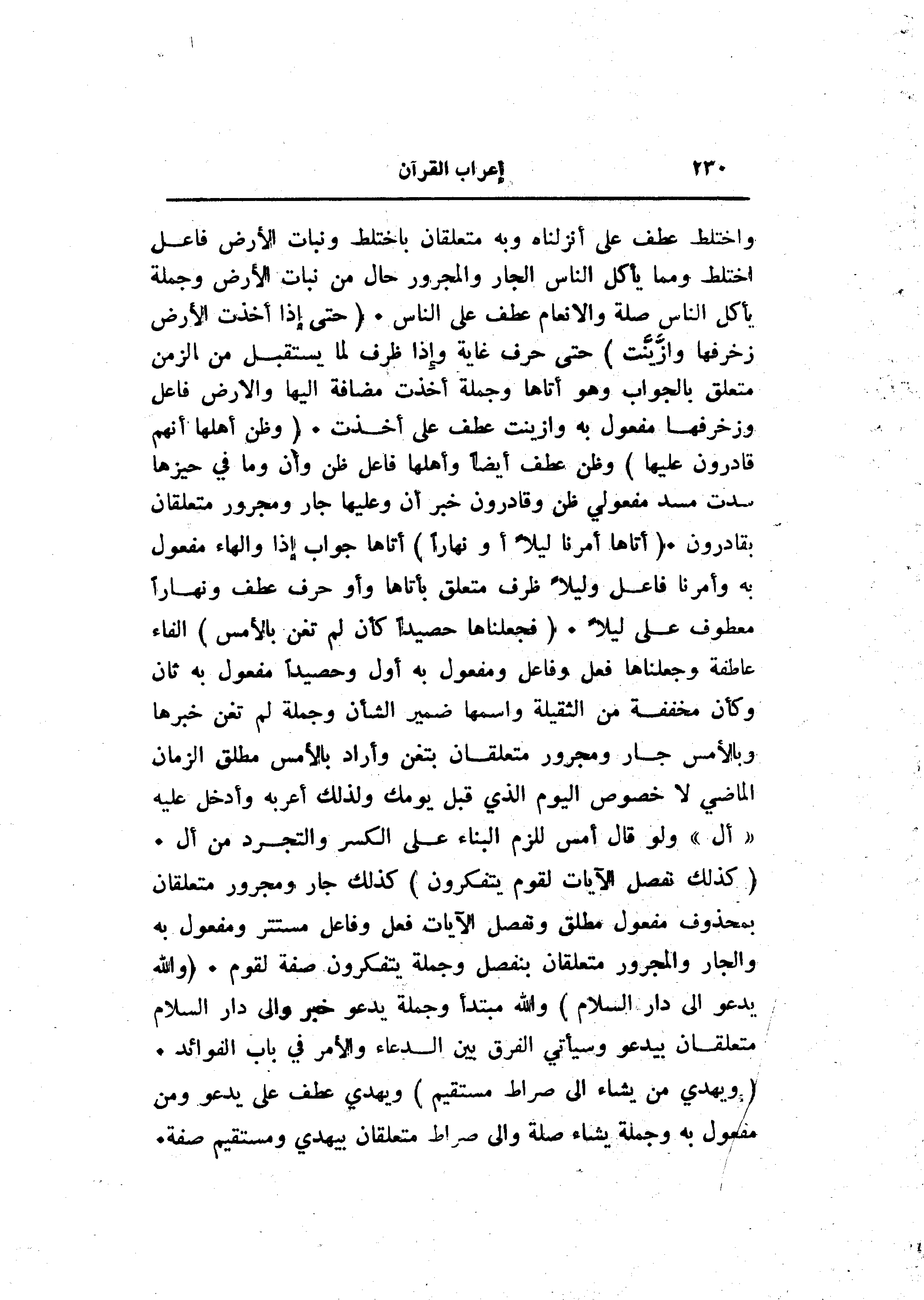 واختلط عطف على أنزلناه وبه متعلقان باختلط ونبات الأرض فاعل اختلط ومما يأكل الناس الجار والمجرور حال من نبات الأرض وجملة يأكل الناس صلة والانعام عطف على الناس. (حَتَّى إِذا أَخَذَتِ الْأَرْضُ زُخْرُفَها وَازَّيَّنَتْ) حتى حرف غاية وإذا ظرف لما يستقبل من الزمن متعلق بالجواب وهو أتاها وجملة أخذت مضافة إليها والأرض فاعل وزخرفها مفعول به وازينت عطف على أخذت. (وَظَنَّ أَهْلُها أَنَّهُمْ قادِرُونَ عَلَيْها) وظن عطف أيضا وأهلها فاعل ظن وأن وما في حيزها سدت مسد مفعولي ظن وقادرون خبر أن وعليها جار ومجرور متعلقان بقادرون. (أَتاها أَمْرُنا لَيْلًا أَوْ نَهاراً) أتاها جواب إذا والهاء مفعول به وأمرنا فاعل وليلا ظرف متعلق بأتاها وأو حرف عطف ونهارا معطوف على ليلا. (فَجَعَلْناها حَصِيداً كَأَنْ لَمْ تَغْنَ بِالْأَمْسِ) الفاء عاطفة وجعلناها فعل وفاعل ومفعول به أول وحصيدا مفعول به ثان وكأن مخففة من الثقيلة واسمها ضمير الشأن وجملة لم تغن خبرها وبالأمس جار ومجرور متعلقان بتغن وأراد بالأمس مطلق الزمان الماضي لا خصوص اليوم الذي قبل يومك ولذلك أعربه وأدخل عليه «أل» ولو قال أمس للزم البناء على الكسر والتجرد من أل.