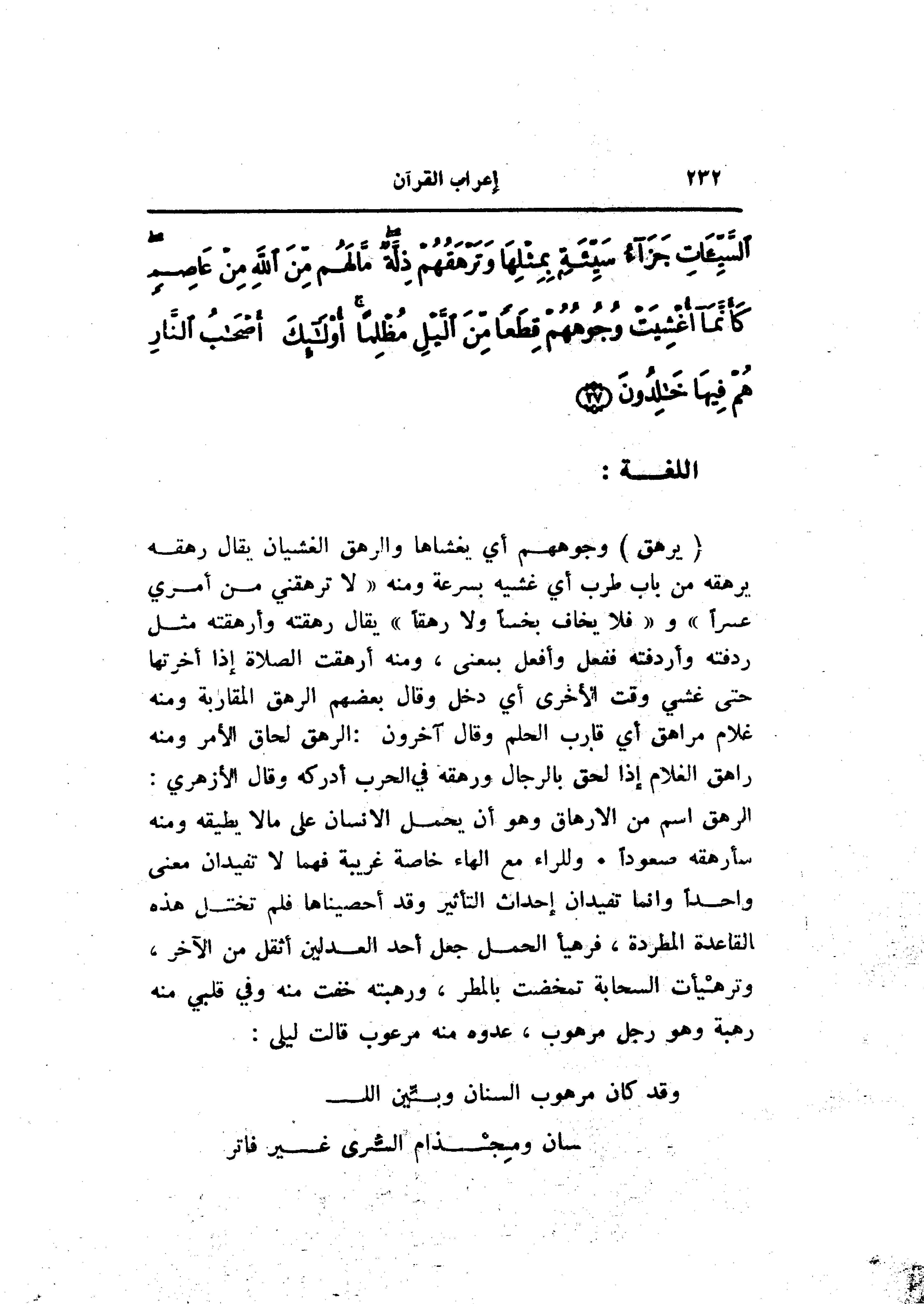 الرهق اسم من الارهاق وهو أن يحمل الإنسان على ما لا يطيقه ومنه سأرهقه صعودا. وللراء مع الهاء خاصة غريبة فهما لا تفيدان معنى واحدا وانما تفيدان إحداث التأثير وقد أحصيناها فلم تختل هذه القاعدة المطردة، فرهيأ الحمل جعل أحد العدلين أثقل من الآخر، وترهيأت السحابة تمخضت بالمطر، ورهبته خفت منه وفي قلبي منه رهبة وهو رجل مرهوب، عدوه منه مرعوب قالت ليلى: