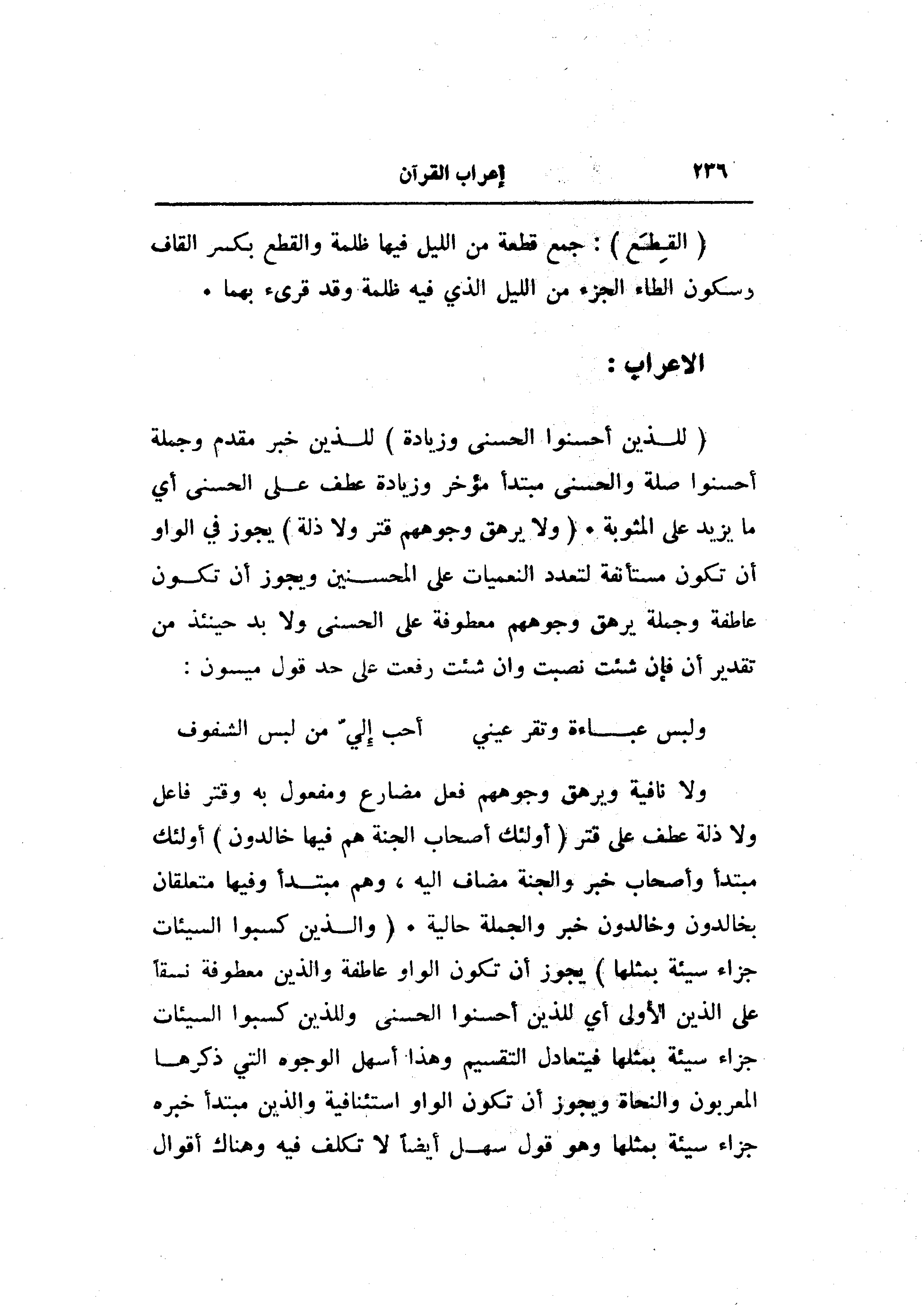 ولا نافية ويرهق وجوههم فعل مضارع ومفعول به وقتر فاعل ولا ذلة عطف على قتر (أُولئِكَ أَصْحابُ الْجَنَّةِ هُمْ فِيها خالِدُونَ) أولئك مبتدأ وأصحاب خبر والجنة مضاف اليه، وهم مبتدأ وفيها متعلقان بخالدون وخالدون خبر والجملة حالية. (وَالَّذِينَ كَسَبُوا السَّيِّئاتِ جَزاءُ سَيِّئَةٍ بِمِثْلِها) يجوز أن تكون الواو عاطفة والذين معطوفة نسقا على الذين الأولى أي للذين أحسنوا الحسنى وللذين كسبوا السيئات جزاء سيئة بمثلها فيتعادل التقسيم وهذا أسهل الوجوه التي ذكرها المعربون والنحاة ويجوز أن تكون الواو استئنافية والذين مبتدأ خبره جزاء سيئة بمثلها وهو قول سهل أيضا لا تكلف فيه وهناك أقوال
