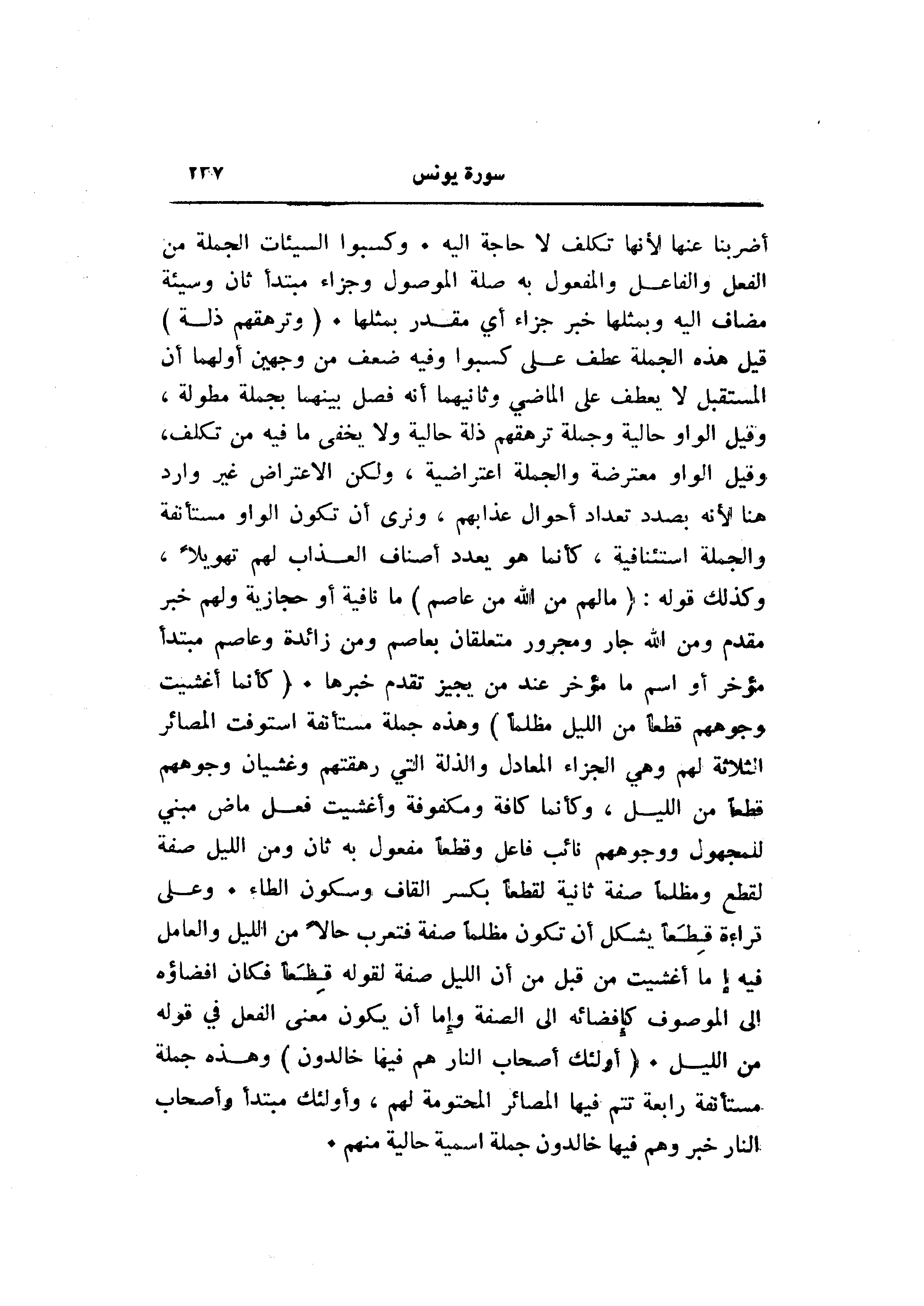 أضربنا عنها لأنها تكلف لا حاجة اليه. وكسبوا السيئات الجملة من الفعل والفاعل والمفعول به صلة الموصول وجزاء مبتدأ ثان وسيئة مضاف اليه وبمثلها خبر جزاء أي مقدر بمثلها. (وَتَرْهَقُهُمْ ذِلَّةٌ) قيل هذه الجملة عطف على كسبوا وفيه ضعف من وجهين أولهما أن المستقبل لا يعطف على الماضي وثانيهما أنه فصل بينهما بجملة مطولة، وقيل الواو حالية وجملة ترهقهم ذلة حالية ولا يخفى ما فيه من تكلف، وقيل الواو معترضة والجملة اعتراضية، ولكن الاعتراض غير وارد هنا لأنه بصدد تعداد أحوال عذابهم، ونرى أن تكون الواو مستأنفة والجملة استئنافية، كأنما هو يعدد أصناف العذاب لهم تهويلا، وكذلك قوله: (ما لَهُمْ مِنَ اللَّهِ مِنْ عاصِمٍ) ما نافية أو حجازية ولهم خبر مقدم ومن الله جار ومجرور متعلقان بعاصم ومن زائدة وعاصم مبتدأ مؤخر أو اسم ما مؤخر عند من يجيز تقدم خبرها. (كَأَنَّما أُغْشِيَتْ وُجُوهُهُمْ قِطَعاً مِنَ اللَّيْلِ مُظْلِماً) وهذه جملة مستأنفة استوفت المصائر الثلاثة لهم وهي الجزاء المعادل والذلة التي رهقتهم وغشيان وجوههم قطعا من الليل، وكأنما كافة ومكفوفة وأغشيت فعل ماض مبني للمجهول ووجوههم نائب فاعل وقطعا مفعول به ثان ومن الليل صفة لقطع ومظلما صفة ثانية لقطعا بكسر القاف وسكون الطاء. وعلى قراءة قطعا يشكل أن تكون مظلما صفة فتعرب حالا من الليل والعامل فيه إما أغشيت من قبل من أن الليل صفة لقوله قطعا فكان افضاؤه الى الموصوف كإفضائه الى الصفة وإما أن يكون معنى الفعل في قوله من الليل. (أُولئِكَ أَصْحابُ النَّارِ هُمْ فِيها خالِدُونَ) وهذه جملة مستأنفة رابعة تتم فيها المصائر المحتومة لهم، وأولئك مبتدأ وأصحاب النار خبر وهم فيها خالدون جملة اسمية حالية منهم.