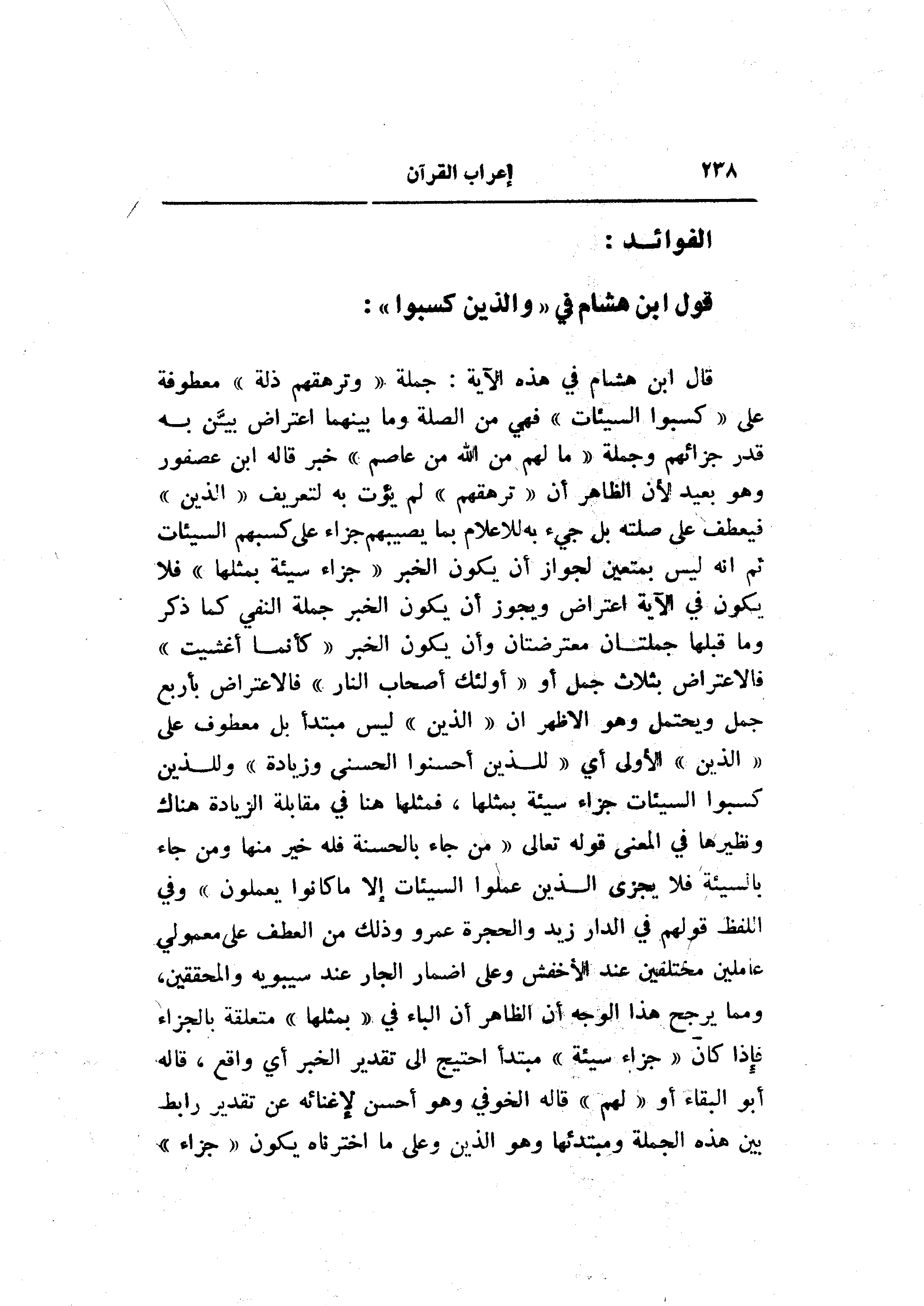 قال ابن هشام في هذه الآية: جملة «وترهقهم ذلة» معطوفة على «كسبوا السيئات» فهي من الصلة وما بينهما اعتراض بيّن به قدر جزائهم وجملة «ما لهم من الله من عاصم» خبر قاله ابن عصفور وهو بعيد لأن الظاهر أن «ترهقهم» لم يؤت به لتعريف «الذين» فيعطف على صلته بل جيء به للاعلام بما يصيبهم جزاء على كسبهم السيئات ثم انه ليس بمتعين لجواز أن يكون الخبر «جزاء سيئة بمثلها» فلا يكون في الآية اعتراض ويجوز أن يكون الخبر جملة النفي كما ذكر وما قبلها جملتان معترضتان وأن يكون الخبر «كأنما أغشيت» فالاعتراض بثلاث جمل أو «أولئك أصحاب النار» فالاعتراض بأربع جمل ويحتمل وهو الأظهر ان «الذين» ليس مبتدأ بل معطوف على «الذين» الأولى أي «للذين أحسنوا الحسنى وزيادة» وللذين كسبوا السيئات جزاء سيئة بمثلها، فمثلها هنا في مقابلة الزيادة هناك ونظيرها في المعنى قوله تعالى «من جاء بالحسنة فله خير منها ومن جاء بالسيئة فلا يجزى الذين عملوا السيئات إلا ما كانوا يعملون» وفي اللفظ قولهم في الدار زيد والحجرة عمرو وذلك من العطف على معمولي عاملين مختلفين عند الأخفش وعلى إضمار الجار عند سيبويه والمحققين، ومما يرجح هذا الوجه أن الظاهر أن الباء في «بمثلها» متعلقة بالجزاء فإذا كان «جزاء سيئة» مبتدأ احتيج الى تقدير الخبر أي واقع، قاله أبو البقاء أو «لهم» قاله الخوفي وهو أحسن لإغنائه عن تقدير رابط بين هذه الجملة ومبتدئها وهو الذين وعلى ما اخترناه يكون «جزاء»