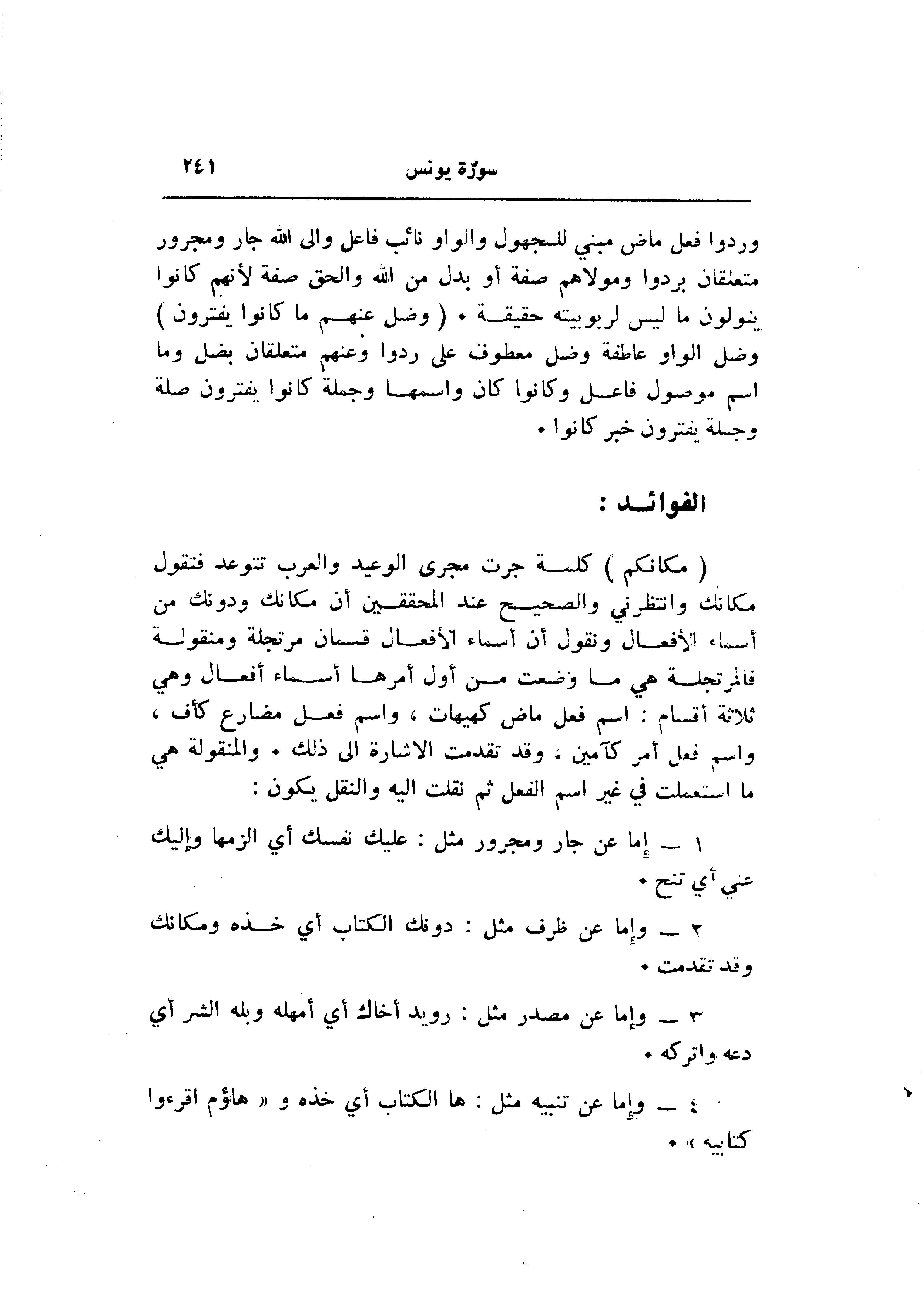 (مَكانَكُمْ) كلمة جرت مجرى الوعيد والعرب تتوعد فتقول مكانك وانتظرني والصحيح عند المحققين أن مكانك ودونك من أسماء الأفعال ونقول أن أسماء الأفعال قسمان مرتجلة ومنقولة فالمرتجلة هي ما وضعت من أول أمرها أسماء أفعال وهي ثلاثة أقسام: اسم فعل ماض كهيهات، واسم فعل مضارع كأف، واسم فعل أمر كآمين، وقد تقدمت الاشارة الى ذلك. والمنقولة هي ما استعملت في غير اسم الفعل ثم نقلت اليه والنقل يكون: