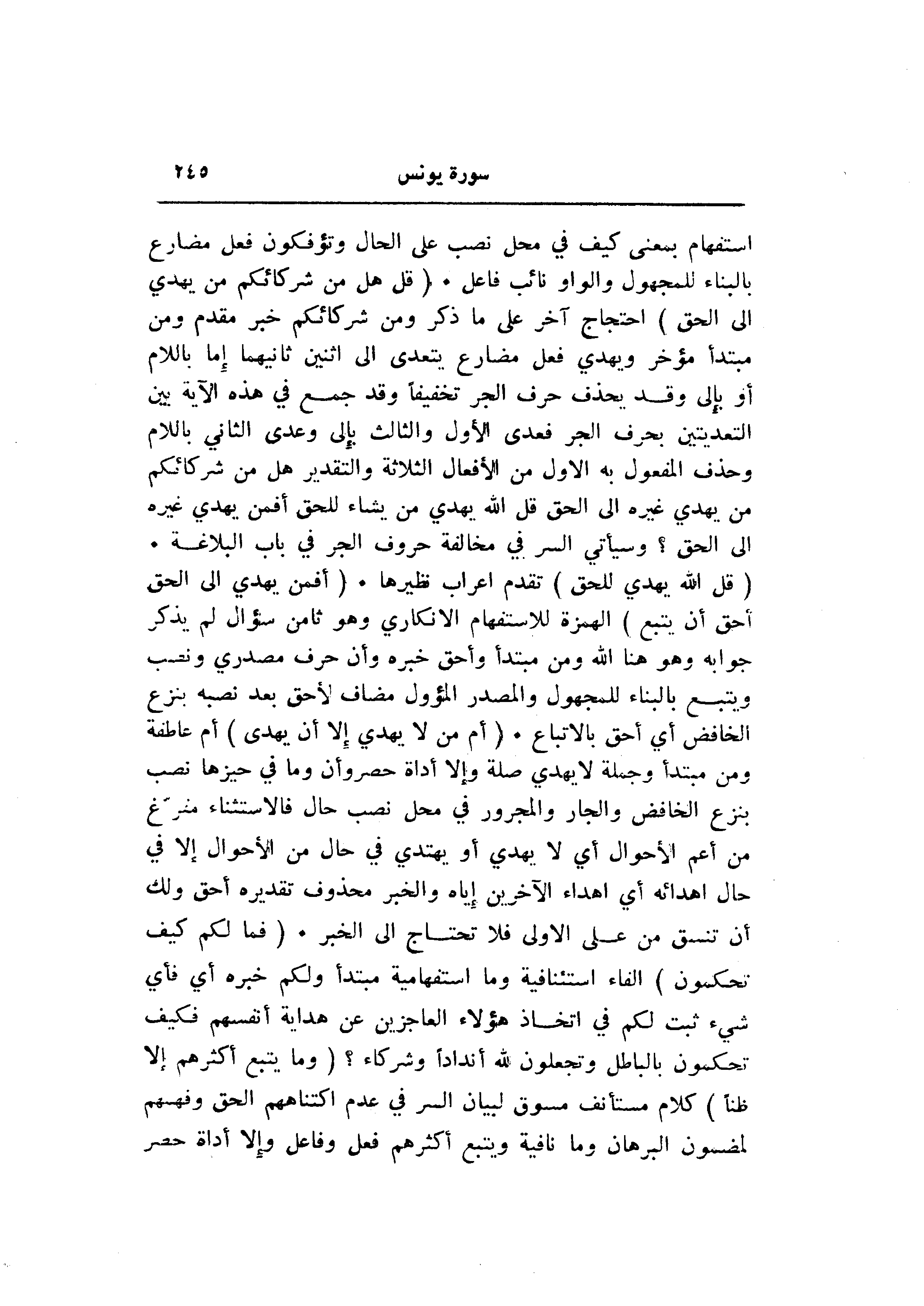 (قُلِ اللَّهُ يَهْدِي لِلْحَقِّ) تقدم اعراب نظيرها. (أَفَمَنْ يَهْدِي إِلَى الْحَقِّ أَحَقُّ أَنْ يُتَّبَعَ) الهمزة للاستفهام الانكاري وهو ثامن سؤال لم يذكر جوابه وهو هنا الله ومن مبتدأ وأحق خبره وأن حرف مصدري ونصب ويتبع بالبناء للمجهول والمصدر المؤول مضاف لأحق بعد نصبه بنزع الخافض أي أحق بالاتباع. (أَمَّنْ لا يَهِدِّي إِلَّا أَنْ يُهْدى) أم عاطفة ومن مبتدأ وجملة لا يهدي صلة وإلا أداة حصر وأن وما في حيزها نصب بنزع الخافض والجار والمجرور في محل نصب حال فالاستثناء مفرّغ من أعم الأحوال أي لا يهدي أو يهتدي في حال من الأحوال إلا في حال اهدائه أي إهداء الآخرين إياه والخبر محذوف تقديره أحق ولك أن تنسق من على الاولى فلا تحتاج الى الخبر. (فَما لَكُمْ كَيْفَ تَحْكُمُونَ) الفاء استئنافية وما استفهامية مبتدأ ولكم خبره أي فأي شيء ثبت لكم في اتخاذ هؤلاء العاجزين عن هداية أنفسهم فكيف تحكمون بالباطل وتجعلون لله أندادا وشركاء؟ (وَما يَتَّبِعُ أَكْثَرُهُمْ إِلَّا ظَنًّا) كلام مستأنف مسوق لبيان السر في عدم اكتناههم الحق وفهمهم لمضمون البرهان وما نافية ويتبع أكثرهم فعل وفاعل وإلا أداة حصر