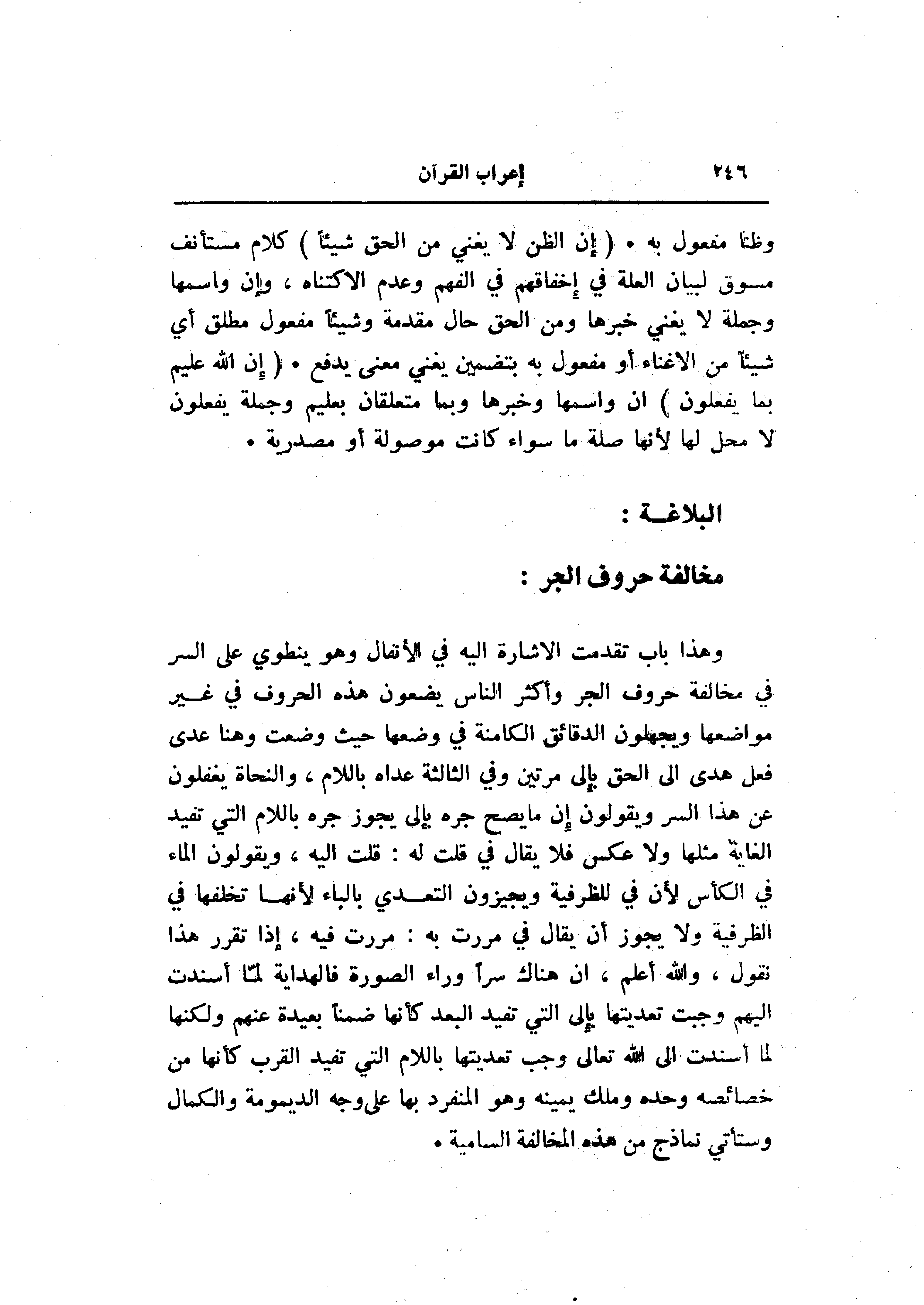 وهذا باب تقدمت الاشارة اليه في الأنفال وهو ينطوي على السر في مخالفة حروف الجر وأكثر الناس يضعون هذه الحروف في غير مواضعها ويجهلون الدقائق الكامنة في وضعها حيث وضعت وهنا عدى فعل هدى الى الحق بإلى مرتين وفي الثلاثة عداه باللام، والنحاة يغفلون عن هذا السر ويقولون إن ما يصح جره بإلى يجوز جره باللام التي تفيد الغاية مثلها ولا عكس فلا يقال في قلت له: قلت اليه، ويقولون الماء في الكأس لأن في للظرفية ويجيزون التعدي بالباء لأنها تخلفها في الظرفية ولا يجوز أن يقال في مررت به: مررت فيه، إذا تقرر هذا نقول، والله أعلم، ان هناك سرا وراء الصورة فالهداية لمّا أسندت إليهم وجبت تعديتها بإلى التي تفيد البعد كأنها ضمنا بعيدة عنهم ولكنها لما أسندت الى الله تعالى وجب تعديتها باللام التي تفيد القرب كأنها من خصائصه وحده وملك يمينه وهو المنفرد بها على وجه الديمومة والكمال وستأتي نماذج من هذه المخالفة السامية.