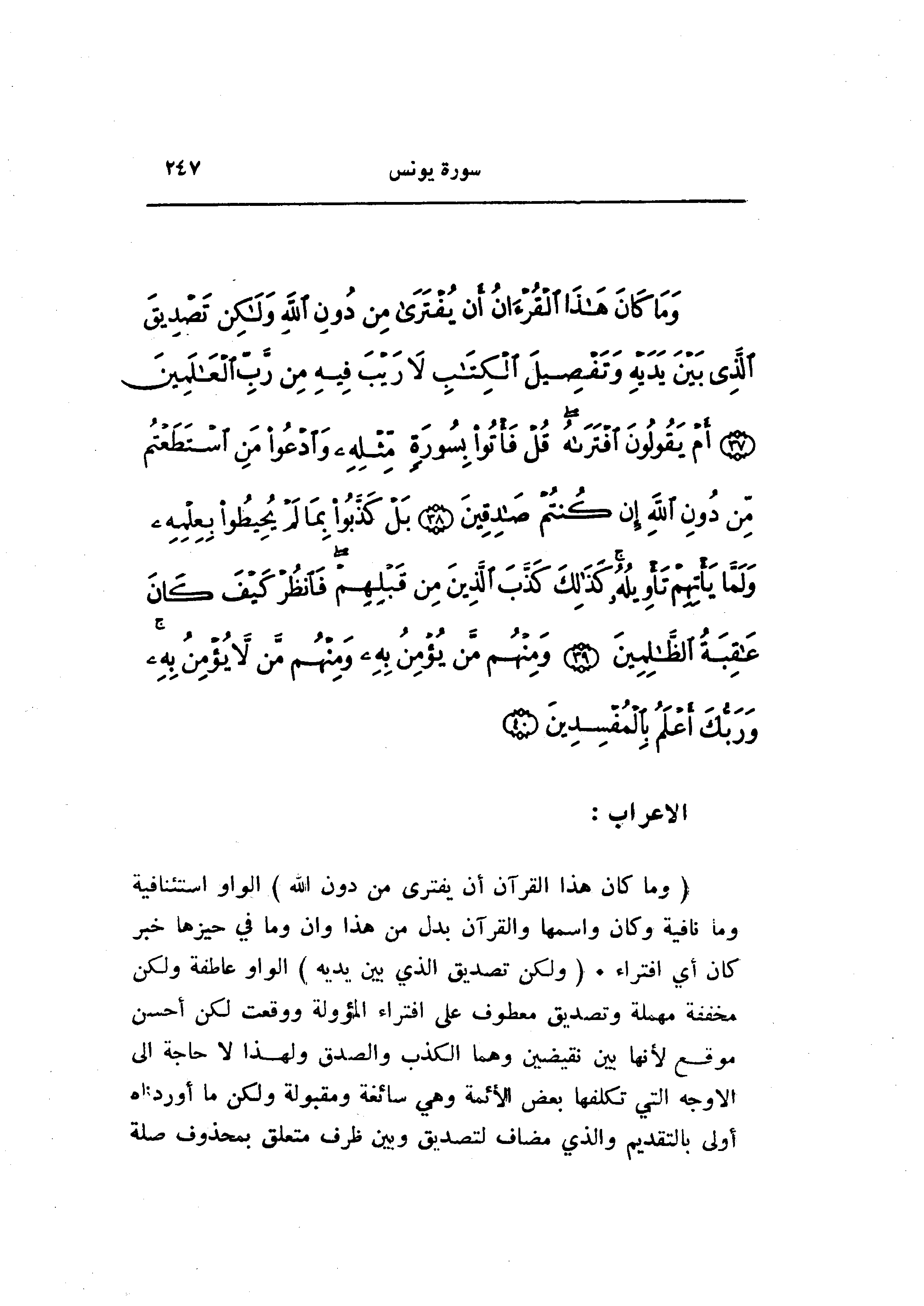 (وَما كانَ هذَا الْقُرْآنُ أَنْ يُفْتَرى مِنْ دُونِ اللَّهِ) الواو استئنافية وما نافية وكان واسمها والقرآن بدل من هذا وان وما في حيزها خبر كان أي افتراء. (وَلكِنْ تَصْدِيقَ الَّذِي بَيْنَ يَدَيْهِ) الواو عاطفة ولكن مخففة مهملة وتصديق معطوف على افتراء المؤولة ووقعت لكن أحسن موقع لأنها بين نقيضين وهما الكذب والصدق ولهذا لا حاجة الى الاوجه التي تكلفها بعض الأئمة وهي سائغة ومقبولة ولكن ما أوردناه أولى بالتقديم والذي مضاف لتصديق وبين ظرف متعلق بمحذوف صلة