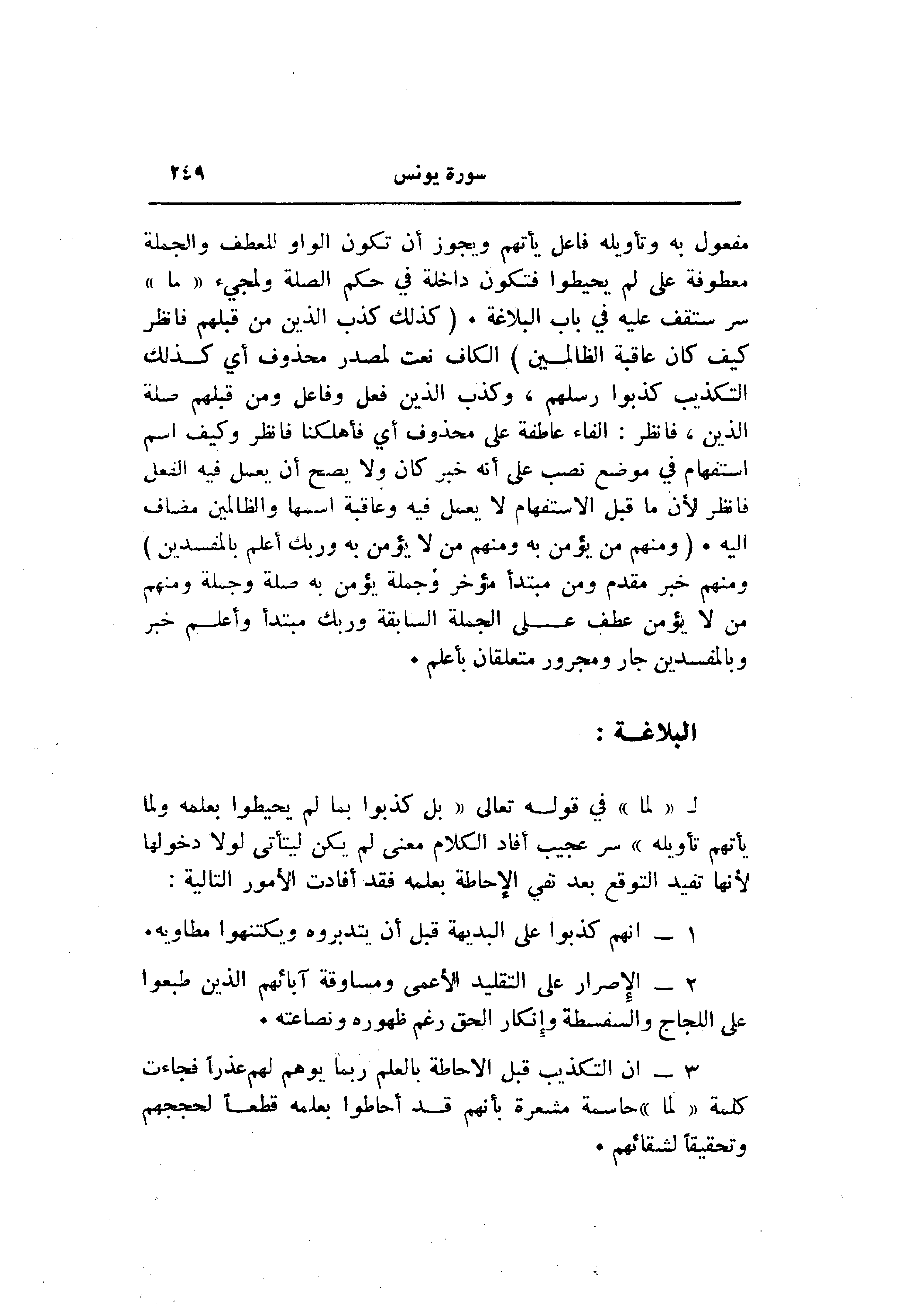 3- ان التكذيب قبل الإحاطة بالعلم ربما يوهم لهم عذرا فجاءت كلمة «لما» حاسمة مشعرة بأنهم قد أحاطوا بعلمه قطعا لحججهم وتحقيقا لشقائهم.