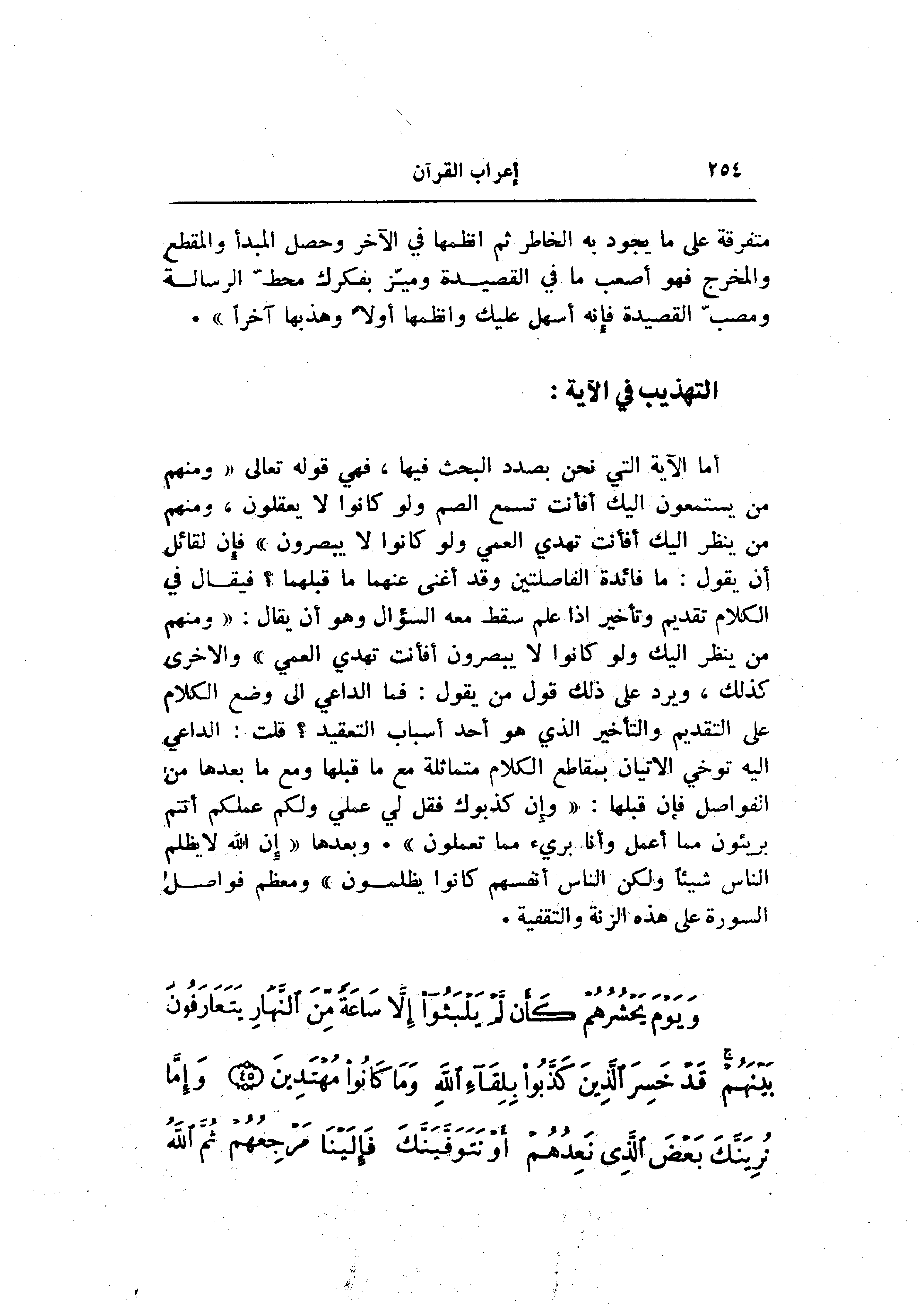 أما الآية التي نحن بصدد البحث فيها، فهي قوله تعالى «ومنهم من يستمعون إليك أفأنت تسمع الصم ولو كانوا لا يعقلون، ومنهم من ينظر إليك أفأنت تهدي العمي ولو كانوا لا يبصرون» فإن لقائل أن يقول: ما فائدة الفاصلتين وقد أغنى عنهما ما قبلهما؟ فيقال في الكلام تقديم وتأخير إذا علم سقط معه السؤال وهو أن يقال: «ومنهم من ينظر إليك ولو كانوا لا يبصرون أفأنت تهدي العمي» والاخرى كذلك، ويرد على ذلك قول من يقول: فما الداعي الى وضع الكلام على التقديم والتأخير الذي هو أحد أسباب التعقيد؟ قلت: الداعي اليه توخي الإتيان بمقاطع الكلام متماثلة مع ما قبلها ومع ما بعدها من الفواصل فإن قبلها: «وإن كذبوك فقل لي عملي ولكم عملكم أنتم بريئون مما أعمل وأنا بريء مما تعملون» . وبعدها «إن الله لا يظلم الناس شيئا ولكن الناس أنفسهم كانوا يظلمون» ومعظم فواصل السورة على هذه الزنة والتقفية.