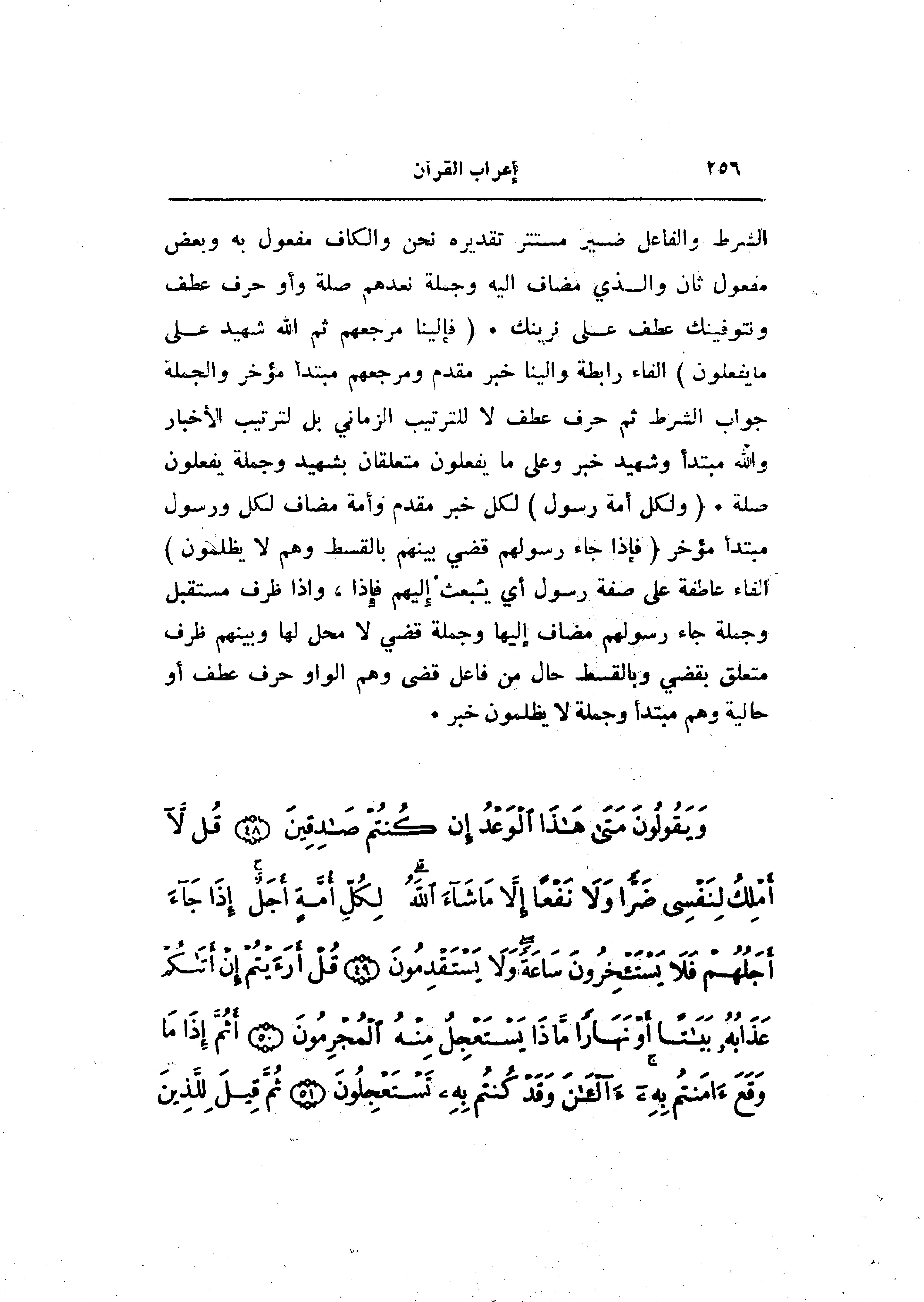 الشرط والفاعل ضمير مستتر تقديره نحن والكاف مفعول به وبعض مفعول ثان والذي مضاف اليه وجملة نعدهم صلة وأو حرف عطف ونتوفينك عطف على نرينك. (فَإِلَيْنا مَرْجِعُهُمْ ثُمَّ اللَّهُ شَهِيدٌ عَلى ما يَفْعَلُونَ) الفاء رابطة وإلينا خبر مقدم ومرجعهم مبتدأ مؤخر والجملة جواب الشرط ثم حرف عطف لا للترتيب الزماني بل لترتيب الأخبار والله مبتدأ وشهيد خبر وعلى ما يفعلون متعلقان بشهيد وجملة يفعلون صلة. (وَلِكُلِّ أُمَّةٍ رَسُولٌ) لكل خبر مقدم وأمة مضاف لكل ورسول مبتدأ مؤخر (فَإِذا جاءَ رَسُولُهُمْ قُضِيَ بَيْنَهُمْ بِالْقِسْطِ وَهُمْ لا يُظْلَمُونَ) الفاء عاطفة على صفة رسول أي يبعث إليهم فإذا، وإذا ظرف مستقبل وجملة جاء رسولهم مضاف إليها وجملة قضي لا محل لها وبينهم ظرف متعلق بقضي وبالقسط حال من فاعل قضى وهم الواو حرف عطف أو حالية وهم مبتدأ وجملة لا يظلمون خبر.