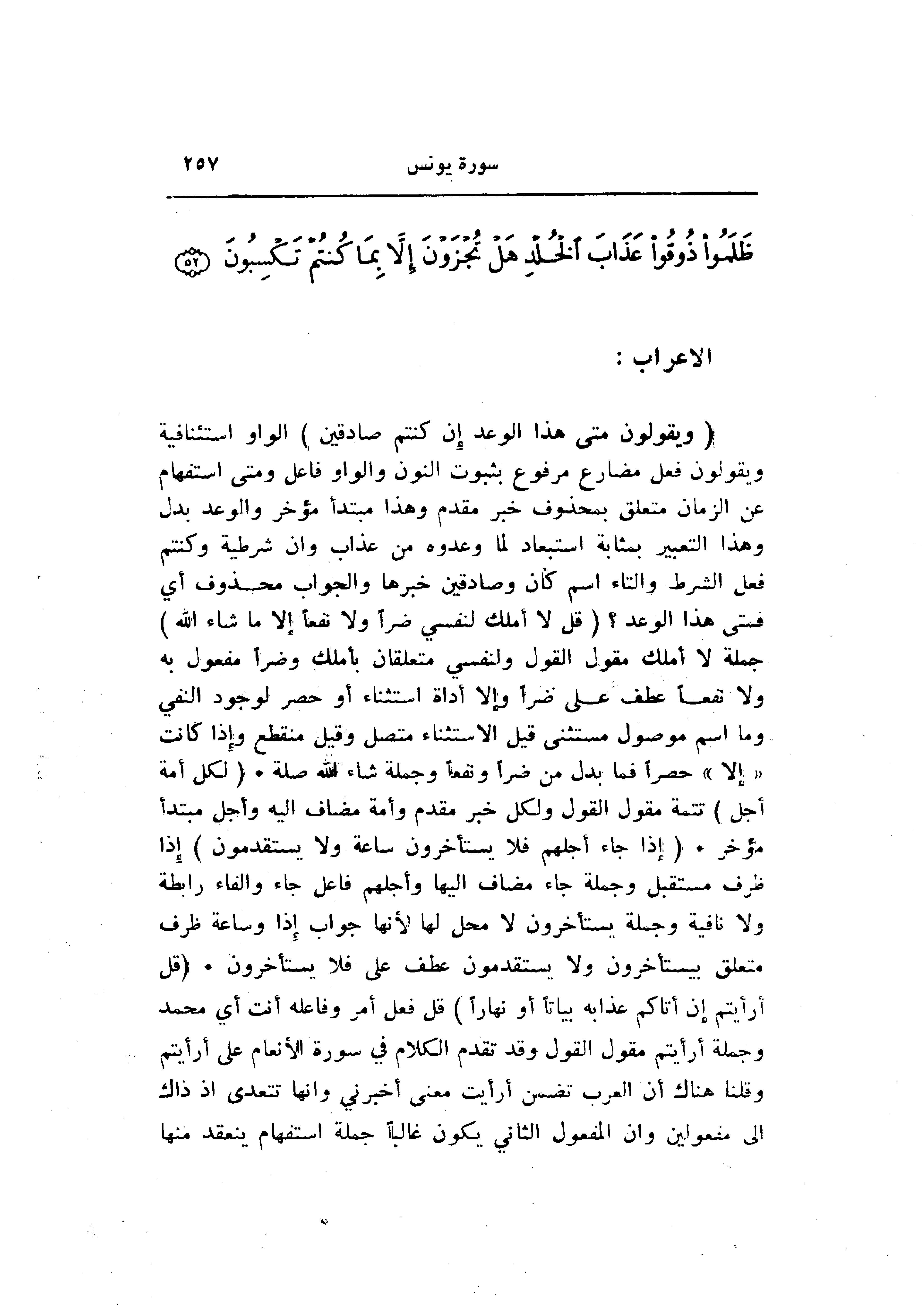 (وَيَقُولُونَ مَتى هذَا الْوَعْدُ إِنْ كُنْتُمْ صادِقِينَ) الواو استئنافية ويقولون فعل مضارع مرفوع بثبوت النون والواو فاعل ومتى استفهام عن الزمان متعلق بمحذوف خبر مقدم وهذا مبتدأ مؤخر والوعد بدل وهذا التعبير بمثابة استبعاد لما وعدوه من عذاب وان شرطية وكنتم فعل الشرط والتاء اسم كان وصادقين خبرها والجواب محذوف أي فمتى هذا الوعد؟ (قُلْ لا أَمْلِكُ لِنَفْسِي ضَرًّا وَلا نَفْعاً إِلَّا ما شاءَ اللَّهُ) جملة لا أملك مقول القول ولنفسي متعلقان بأملك وضرا مفعول به ولا نفعا عطف على ضرا وإلا أداة استثناء أو حصر لوجود النفي وما اسم موصول مستثنى قيل الاستثناء متصل وقيل منقطع وإذا كانت «إلا» حصرا فما بدل من ضرا ونفعا وجملة شاء الله صلة. (لِكُلِّ أُمَّةٍ أَجَلٌ) تتمة مقول القول ولكل خبر مقدم وأمة مضاف اليه وأجل مبتدأ مؤخر. (إِذا جاءَ أَجَلُهُمْ فَلا يَسْتَأْخِرُونَ ساعَةً وَلا يَسْتَقْدِمُونَ) إذا ظرف مستقبل وجملة جاء مضاف إليها وأجلهم فاعل جاء والفاء رابطة ولا نافية وجملة يستأخرون لا محل لها لأنها جواب إذا وساعة ظرف متعلق بيستأخرون ولا يستقدمون عطف على فلا يستأخرون. (قُلْ أَرَأَيْتُمْ إِنْ أَتاكُمْ عَذابُهُ بَياتاً أَوْ نَهاراً) قل فعل أمر وفاعله أنت أي محمد وجملة أرأيتم مقول القول وقد تقدم الكلام في سورة الأنعام على أرأيتم وقلنا هناك أن العرب تضمن أرأيت معنى أخبرني وانها تتعدى إذ ذاك الى مفعولين وان المفعول الثاني يكون غالبا جملة استفهام ينعقد منها