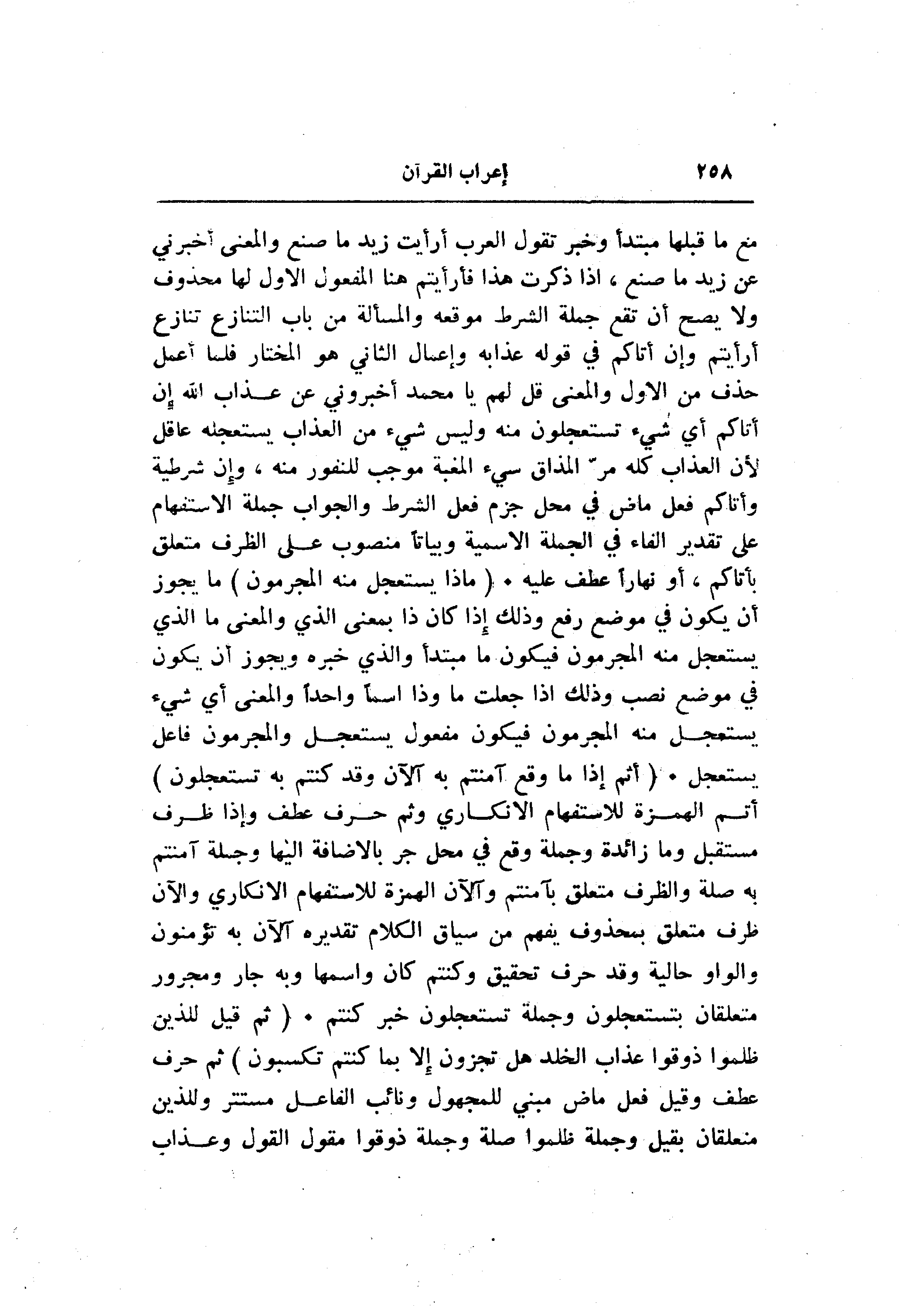 مع ما قبلها مبتدأ وخبر تقول العرب أرأيت زيد ما صنع والمعنى أخبرني عن زيد ما صنع، إذا ذكرت هذا فأرأيتم هنا المفعول الاول لها محذوف ولا يصح أن تقع جملة الشرط موقعه والمسألة من باب التنازع تنازع أرأيتم وإن أتاكم في قوله عذابه وإعمال الثاني هو المختار فلما أعمل حذف من الاول والمعنى قل لهم يا محمد أخبروني عن عذاب الله إن أتاكم أي شيء تستعجلون منه وليس شيء من العذاب يستعجله عاقل لأن العذاب كله مرّ المذاق سيء المغبة موجب للنفور منه، وإن شرطية وأتاكم فعل ماض في محل جزم فعل الشرط والجواب جملة الاستفهام على تقدير الفاء في الجملة الاسمية وبياتا منصوب على الظرف متعلق بأتاكم، أو نهارا عطف عليه. (ماذا يَسْتَعْجِلُ مِنْهُ الْمُجْرِمُونَ) ما يجوز أن يكون في موضع رفع وذلك إذا كان ذا بمعنى الذي والمعنى ما الذي يستعجل منه المجرمون فيكون ما مبتدأ والذي خبره ويجوز أن يكون في موضع نصب وذلك إذا جعلت ما وذا اسما واحدا والمعنى أي شيء يستعجل منه المجرمون فيكون مفعول يستعجل والمجرمون فاعل يستعجل. (أَثُمَّ إِذا ما وَقَعَ آمَنْتُمْ بِهِ آلْآنَ وَقَدْ كُنْتُمْ بِهِ تَسْتَعْجِلُونَ) أتم الهمزة للاستفهام الانكاري وثم حرف عطف وإذا ظرف مستقبل وما زائدة وجملة وقع في محل جر بالاضافة إليها وجملة آمنتم به صلة والظرف متعلق بآمنتم وآلآن الهمزة للاستفهام الانكاري والآن ظرف متعلق بمحذوف يفهم من سياق الكلام تقديره آلآن به تؤمنون والواو حالية وقد حرف تحقيق وكنتم كان واسمها وبه جار ومجرور متعلقان بتستعجلون وجملة تستعجلون خبر كنتم. (ثُمَّ قِيلَ لِلَّذِينَ ظَلَمُوا ذُوقُوا عَذابَ الْخُلْدِ هَلْ تُجْزَوْنَ إِلَّا بِما كُنْتُمْ تَكْسِبُونَ) ثم حرف عطف وقيل فعل ماض مبني للمجهول ونائب الفاعل مستتر وللذين متعلقان بقيل وجملة ظلموا صلة وجملة ذوقوا مقول القول وعذاب