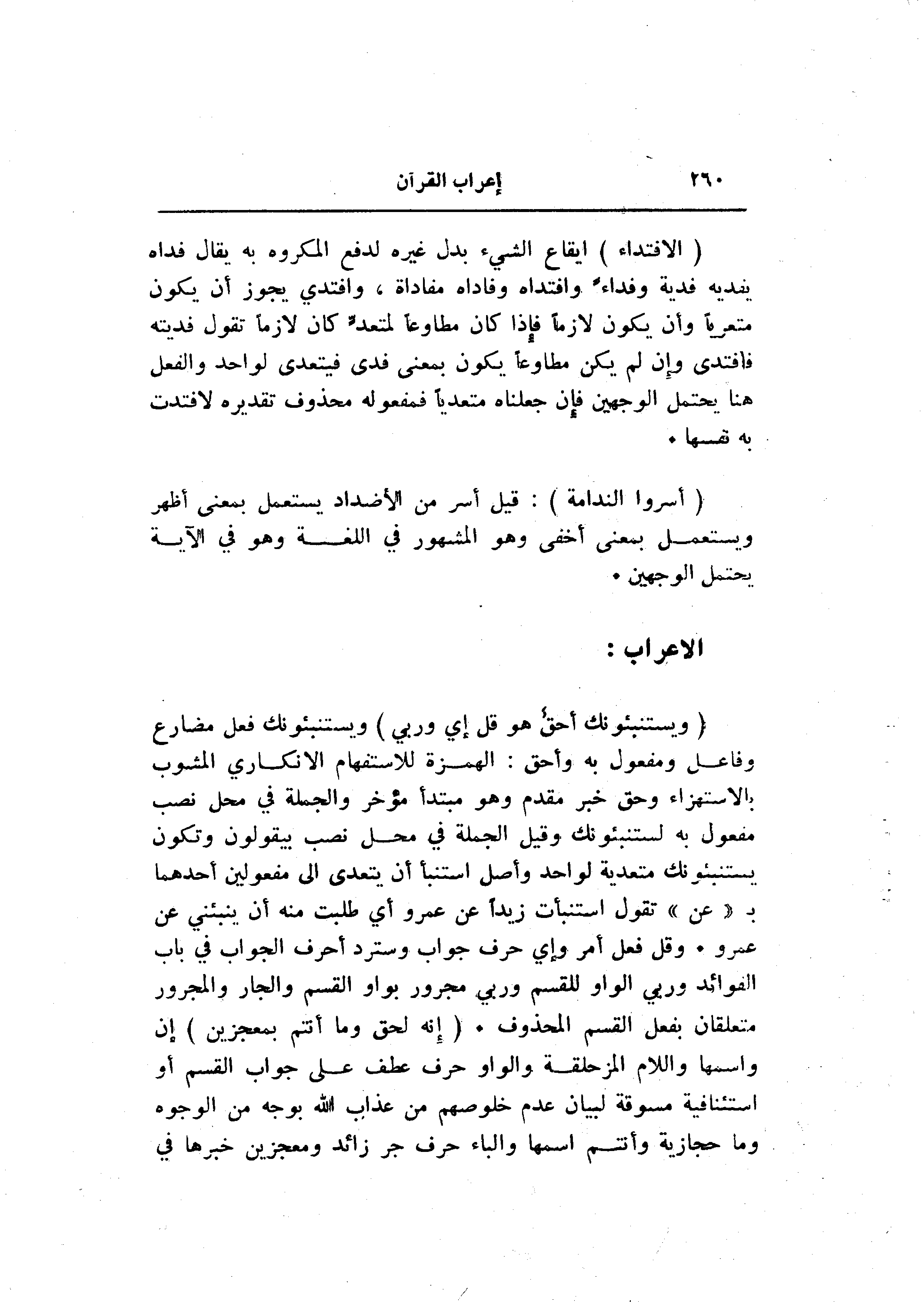 (وَيَسْتَنْبِئُونَكَ أَحَقٌّ هُوَ قُلْ إِي وَرَبِّي) ويستنبئونك فعل مضارع وفاعل ومفعول به وأحق: الهمزة للاستفهام الانكاري المشوب بالاستهزاء وحق خبر مقدم وهو مبتدأ مؤخر والجملة في محل نصب مفعول به لستنبئونك وقيل الجملة في محل نصب بيقولون وتكون يستنبئونك متعدية لواحد وأصل استنبأ أن يتعدى الى مفعولين أحدهما ب «عن» تقول استنبأت زيدا عن عمرو أي طلبت منه أن ينبئني عن عمرو. وقل فعل أمر وإي حرف جواب وسترد أحرف الجواب في باب الفوائد وربي الواو للقسم وربي مجرور بواو القسم والجار والمجرور متعلقان بفعل القسم المحذوف. (إِنَّهُ لَحَقٌّ وَما أَنْتُمْ بِمُعْجِزِينَ) إن واسمها واللام المزحلقة والواو حرف عطف على جواب القسم أو استئنافية مسوقة لبيان عدم خلوصهم من عذاب الله بوجه من الوجوه وما حجازية وأنتم اسمها والباء حرف جر زائد ومعجزين خبرها في
