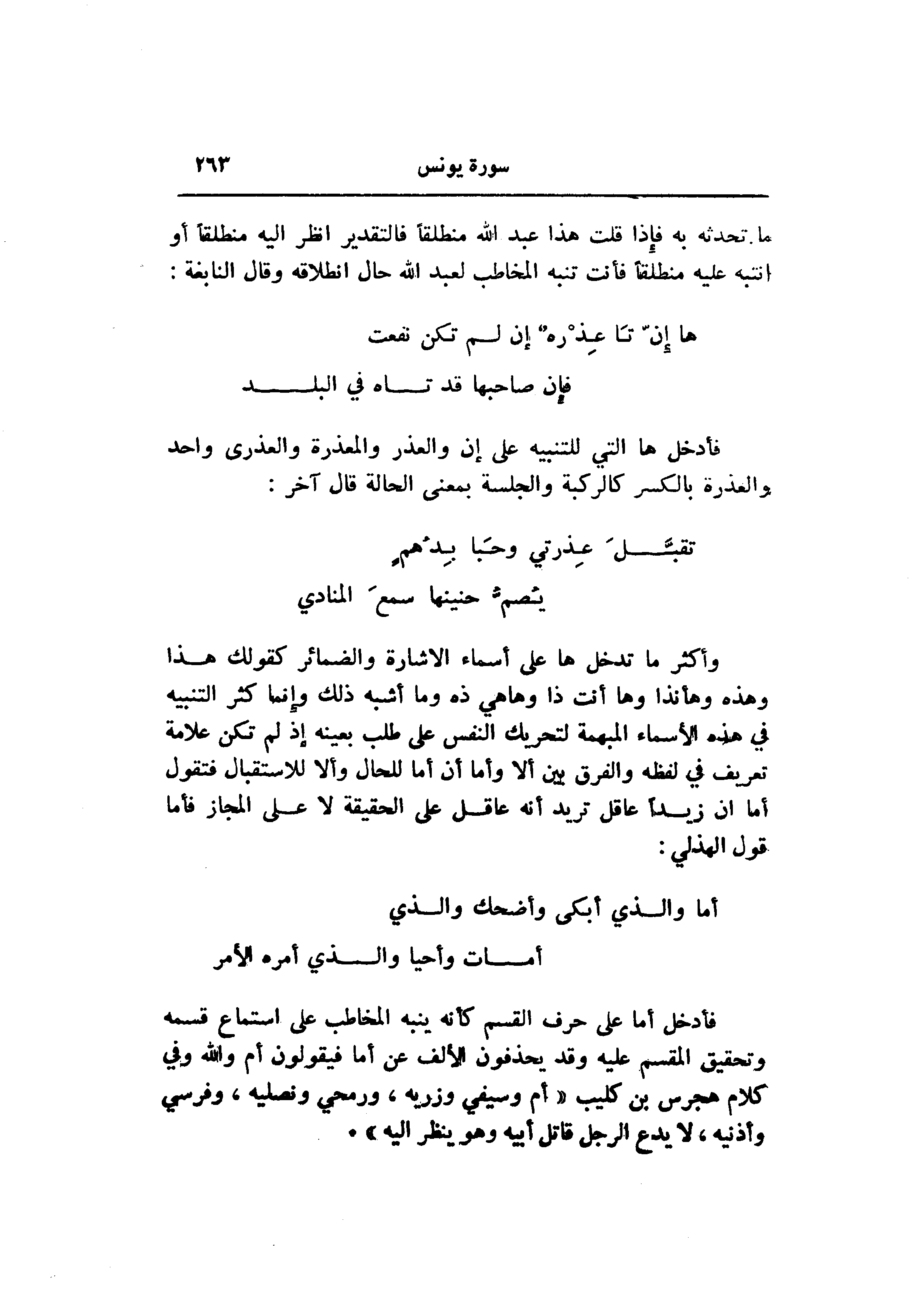 وأكثر ما تدخل ها على أسماء الاشارة والضمائر كقولك هذا وهذه وهأنذا وها أنت ذا وها هي ذه وما أشبه ذلك وإنما كثر التنبيه في هذه الأسماء المبهمة لتحريك النفس على طلب بعينه إذ لم تكن علامة تعريف في لفظه والفرق بين ألا وأما أن أما للحال وألا للاستقبال فتقول أما ان زيدا عاقل تريد أنه عاقل على الحقيقة لا على المجاز فأما قول الهذلي: