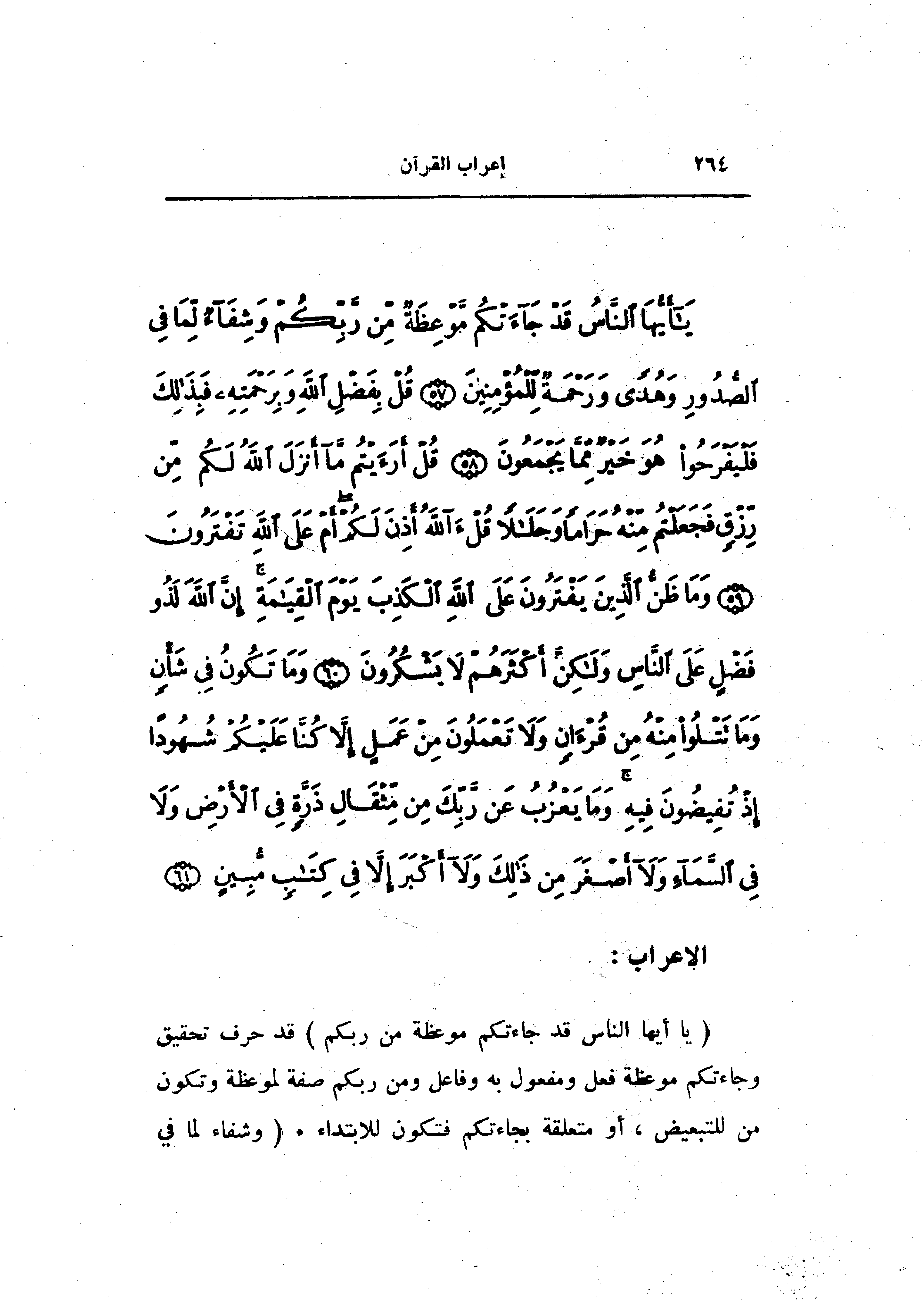 يا أَيُّهَا النَّاسُ قَدْ جاءَتْكُمْ مَوْعِظَةٌ مِنْ رَبِّكُمْ وَشِفاءٌ لِما فِي الصُّدُورِ وَهُدىً وَرَحْمَةٌ لِلْمُؤْمِنِينَ (57) قُلْ بِفَضْلِ اللَّهِ وَبِرَحْمَتِهِ فَبِذلِكَ فَلْيَفْرَحُوا هُوَ خَيْرٌ مِمَّا يَجْمَعُونَ (58) قُلْ أَرَأَيْتُمْ ما أَنْزَلَ اللَّهُ لَكُمْ مِنْ رِزْقٍ فَجَعَلْتُمْ مِنْهُ حَراماً وَحَلالاً قُلْ آللَّهُ أَذِنَ لَكُمْ أَمْ عَلَى اللَّهِ تَفْتَرُونَ (59) وَما ظَنُّ الَّذِينَ يَفْتَرُونَ عَلَى اللَّهِ الْكَذِبَ يَوْمَ الْقِيامَةِ إِنَّ اللَّهَ لَذُو فَضْلٍ عَلَى النَّاسِ وَلكِنَّ أَكْثَرَهُمْ لا يَشْكُرُونَ (60) وَما تَكُونُ فِي شَأْنٍ وَما تَتْلُوا مِنْهُ مِنْ قُرْآنٍ وَلا تَعْمَلُونَ مِنْ عَمَلٍ إِلاَّ كُنَّا عَلَيْكُمْ شُهُوداً إِذْ تُفِيضُونَ فِيهِ وَما يَعْزُبُ عَنْ رَبِّكَ مِنْ مِثْقالِ ذَرَّةٍ فِي الْأَرْضِ وَلا فِي السَّماءِ وَلا أَصْغَرَ مِنْ ذلِكَ وَلا أَكْبَرَ إِلاَّ فِي كِتابٍ مُبِينٍ (61)