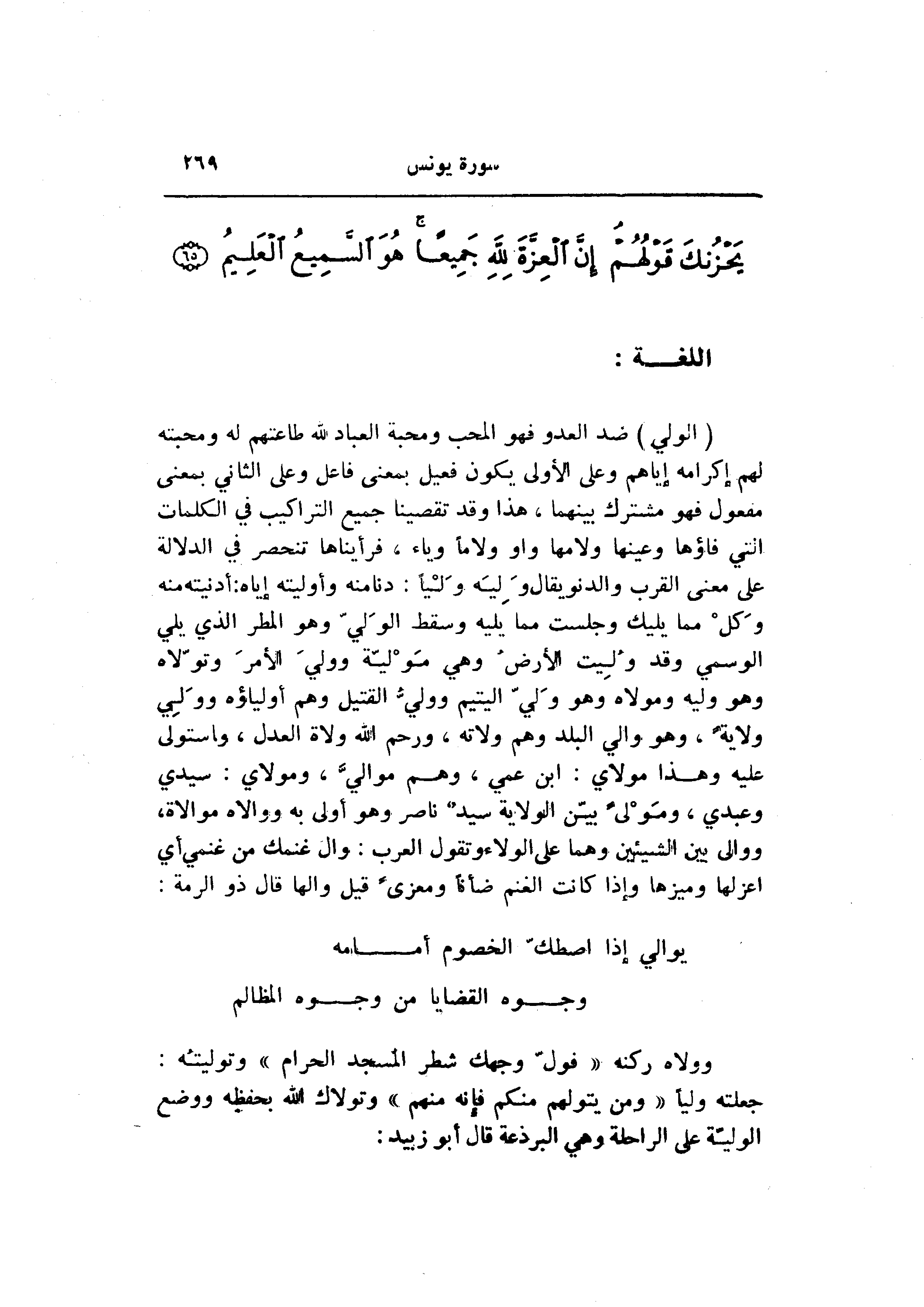 (الولي) ضد العدو فهو المحب ومحبة العباد لله طاعتهم له ومحبته لهم إكرامه إياهم وعلى الأولى يكون فعيل بمعنى فاعل وعلى الثاني بمعنى مفعول فهو مشترك بينهما، هذا وقد تقصينا جميع التراكيب في الكلمات التي فاؤها وعينها ولامها واو ولاما وياء، فرأيناها تنحصر في الدلالة على معنى القرب والدنو يقال وليه وليا: دنامنه وأوليته إياه: أدنيته منه وكل مما يليك وجلست مما يليه وسقط الوليّ وهو المطر الذي يلي الوسمي وقد وليت الأرض وهي موليّة وولي الأمر وتوّلاه وهو وليه ومولاه وهو وليّ اليتيم ووليّ القتيل وهم أولياؤه وولي ولاية، وهو والي البلد وهم ولاته، ورحم الله ولاة العدل، واستولى عليه وهذا مولاي: ابن عمي، وهم مواليّ، ومولاي: سيدي وعبدي، ومولى بيّن الولاية سيد ناصر وهو أولى به ووالاه موالاة، ووالى بين الشيئين وهما على الولاء وتقول العرب: وال غنمك من غنمي أي اعزالها وميزها وإذا كانت الغنم ضأنا ومعزى قيل والها قال ذو الرمة: