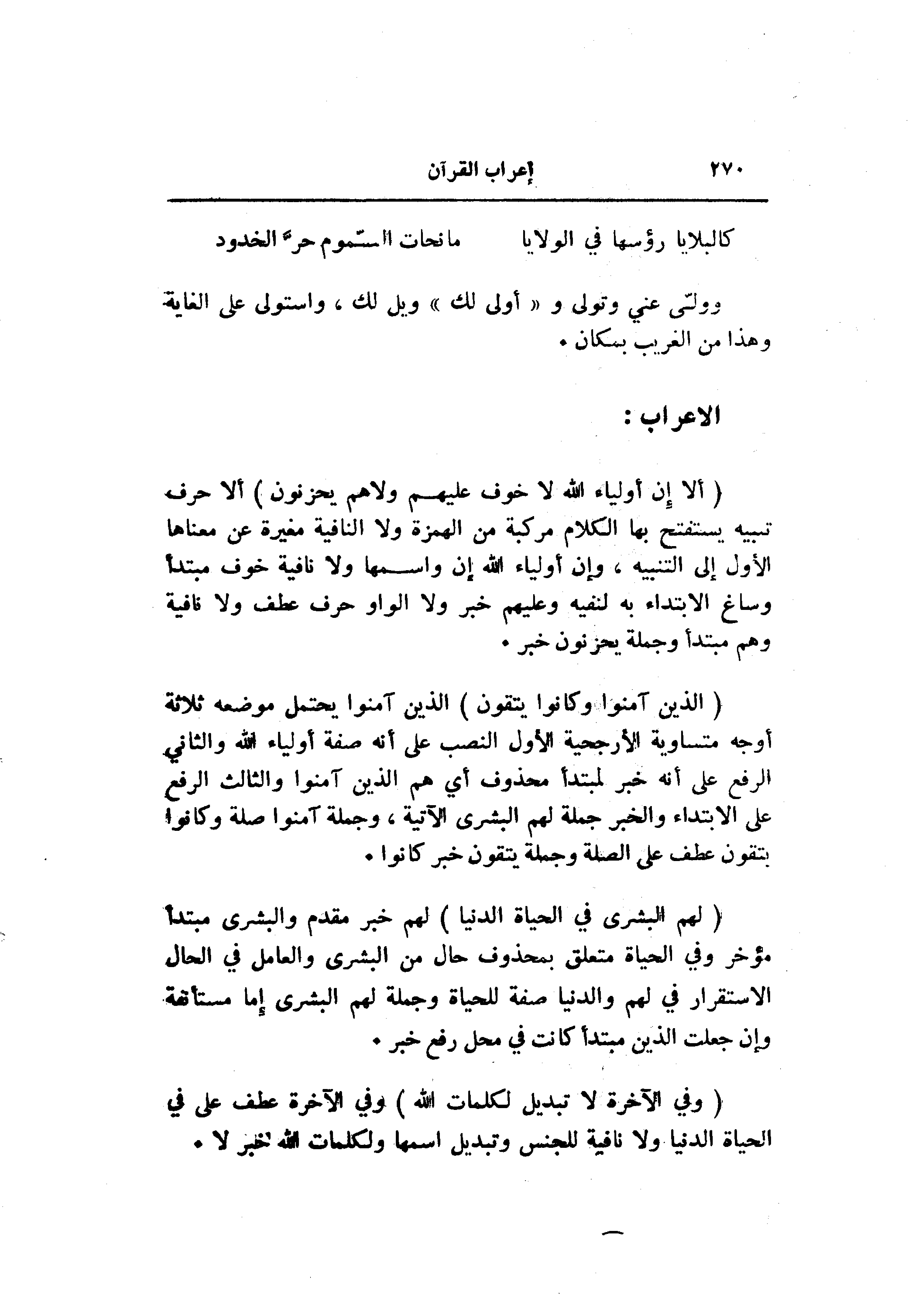 (أَلا إِنَّ أَوْلِياءَ اللَّهِ لا خَوْفٌ عَلَيْهِمْ وَلا هُمْ يَحْزَنُونَ) ألا حرف تنبيه يستفتح بها الكلام مركبة من الهمزة ولا النافية مغيرة عن معناها الأول إلى التنبيه، وإن أولياء الله إن واسمها ولا نافية خوف مبتدأ وساغ الابتداء به لنفيه وعليهم خبر ولا الواو حرف عطف ولا نافية وهم مبتدأ وجملة يحزنون خبر.