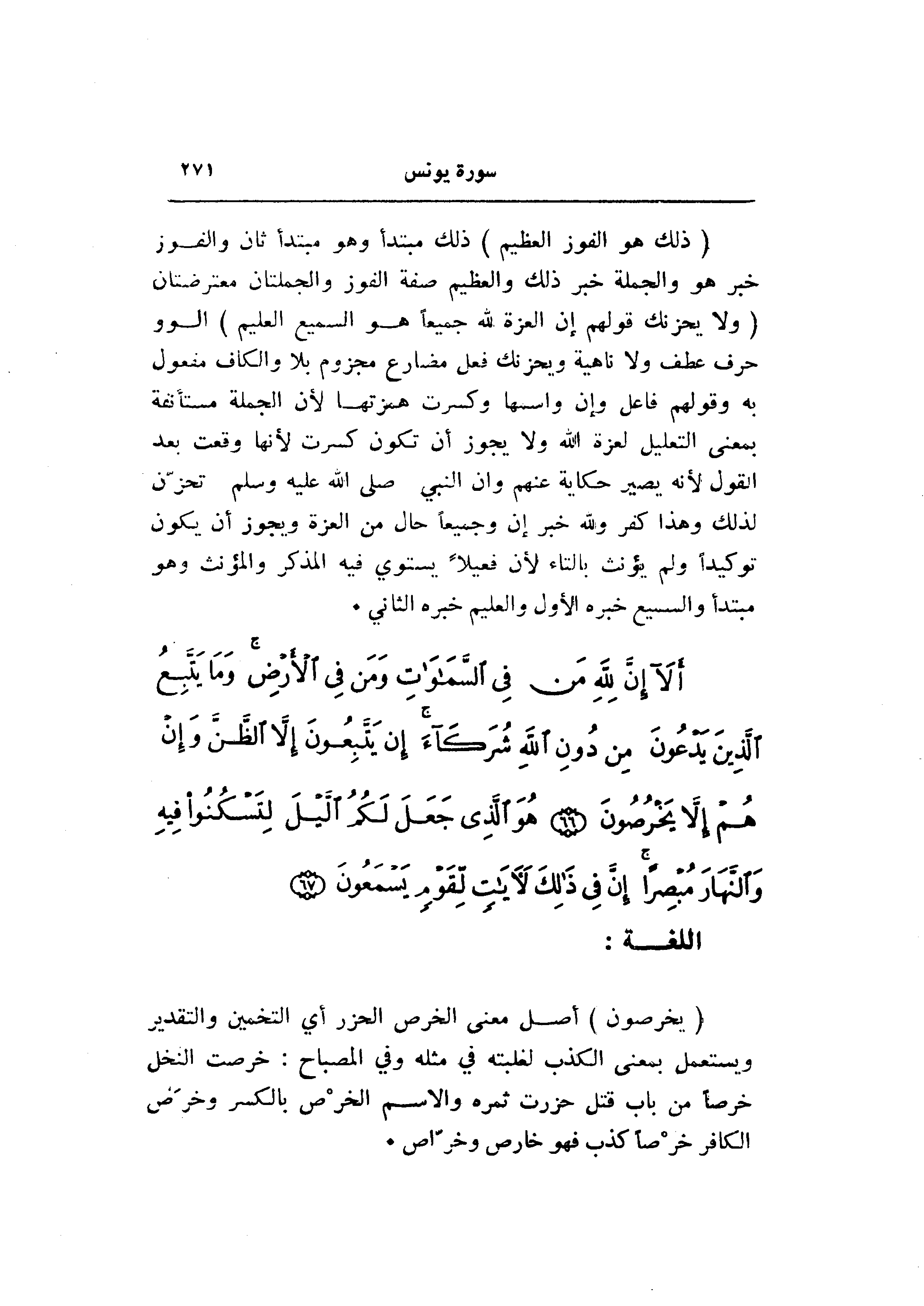 ذلك مبتدأ وهو مبتدأ ثان والفوز خبر هو والجملة خبر ذلك والعظيم صفة الفوز والجملتان معترضتان (وَلا يَحْزُنْكَ قَوْلُهُمْ إِنَّ الْعِزَّةَ لِلَّهِ جَمِيعاً هُوَ السَّمِيعُ الْعَلِيمُ) الواو حرف عطف ولا ناهية ويحزنك فعل مضارع مجزوم بلا والكاف مفعول به وقولهم فاعل وإن واسمها وكسرت همزتها لأن الجملة مستأنفة بمعنى التعليل لعزة الله ولا يجوز أن تكون كسرت لأنها وقعت بعد القول لأنه يصير حكاية عنهم وان النبي صلى الله عليه وسلم تحزّن لذلك وهذا كفر ولله خبر إن وجميعا حال من العزة ويجوز أن يكون توكيدا ولم يؤنث بالتاء لأن فعيلا يستوي فيه المذكر والمؤنث وهو مبتدأ والسميع خبره الأول والعليم خبره الثاني.
