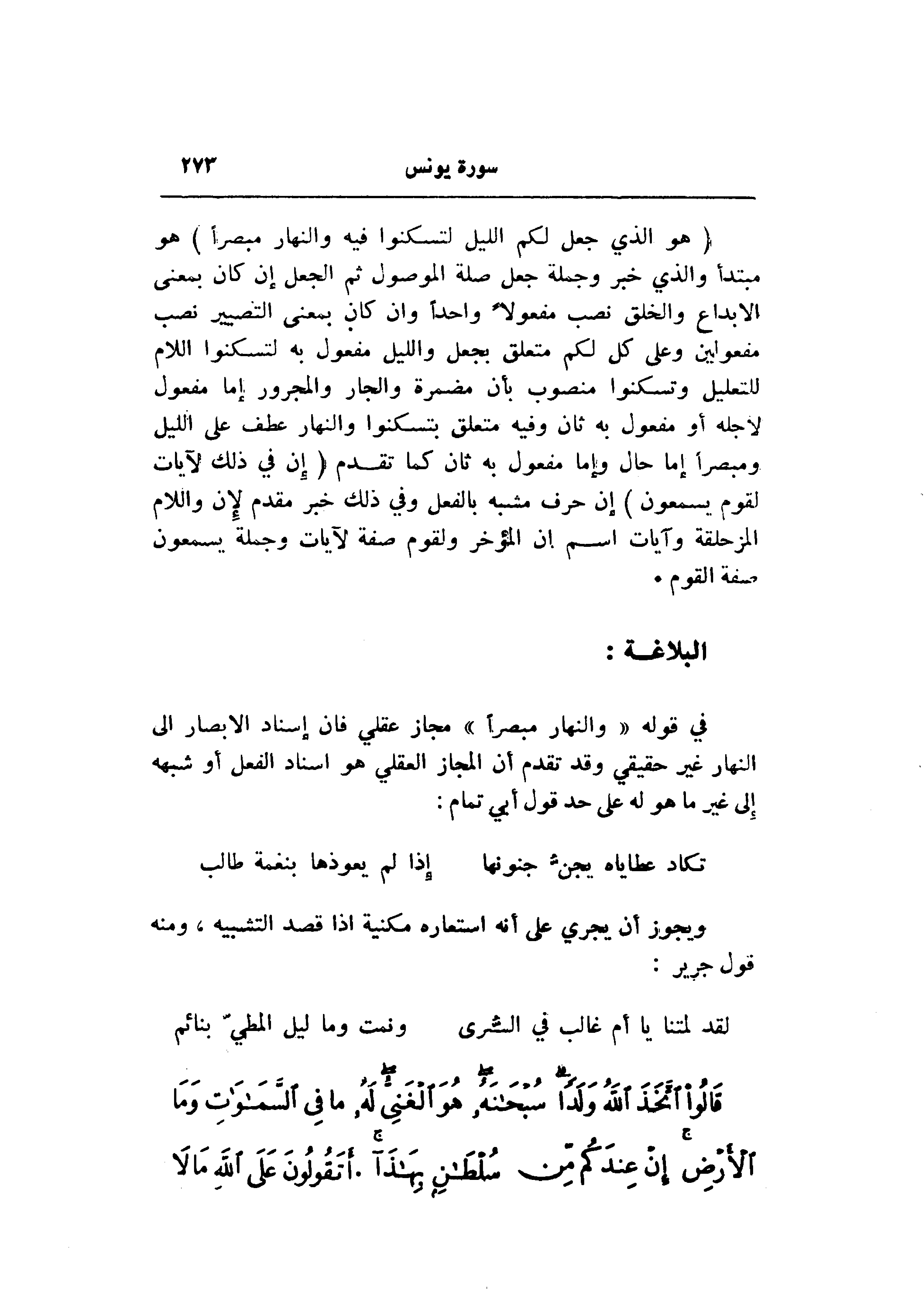 في قوله «والنهار مبصرا» مجاز عقلي فان إسناد الابصار الى النهار غير حقيقي وقد تقدم أن المجاز العقلي هو اسناد الفعل أو شبهه إلى غير ما هو له على حد قول أبي تمام: