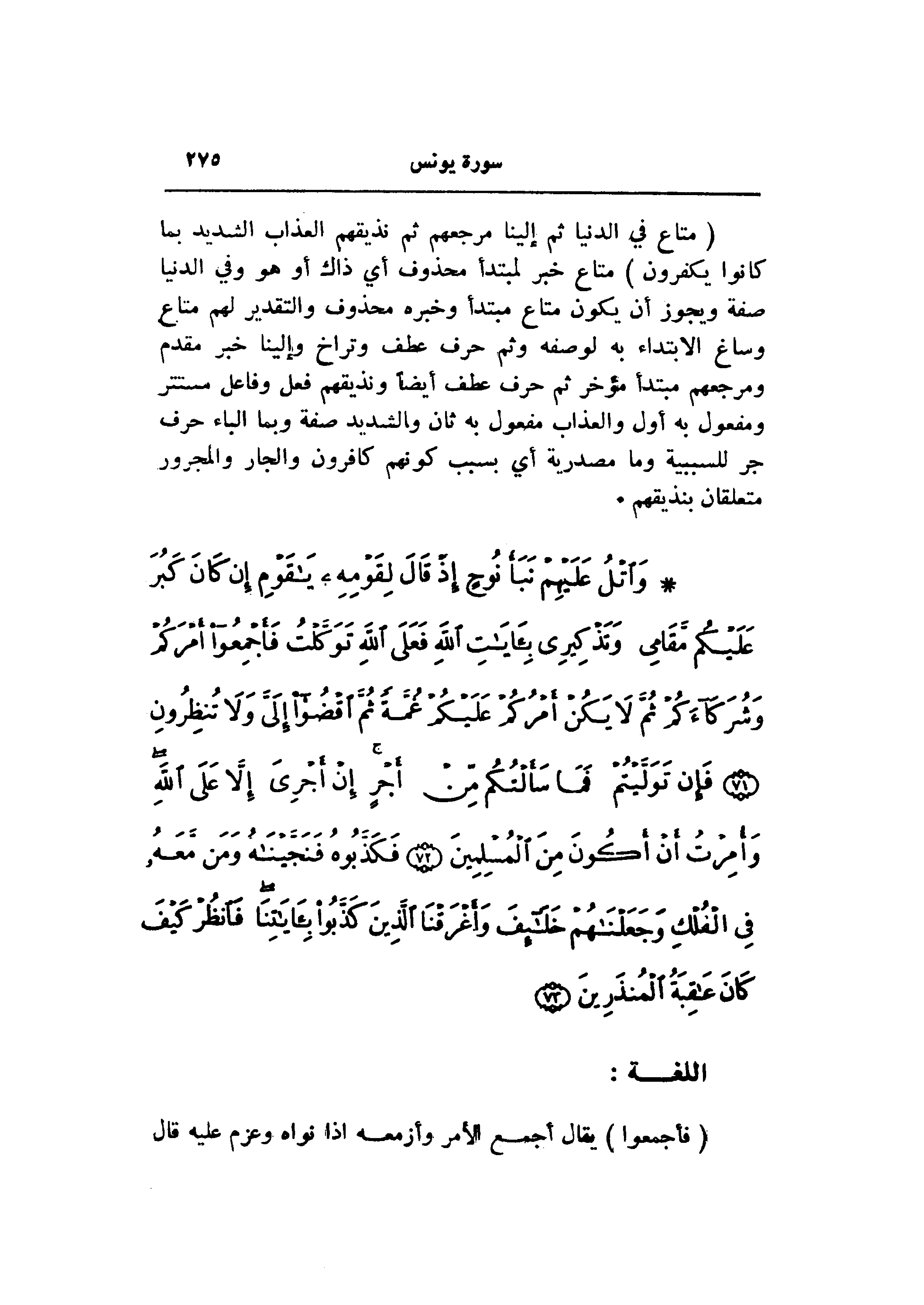 (مَتاعٌ فِي الدُّنْيا ثُمَّ إِلَيْنا مَرْجِعُهُمْ ثُمَّ نُذِيقُهُمُ الْعَذابَ الشَّدِيدَ بِما كانُوا يَكْفُرُونَ) متاع خبر لمبتدأ محذوف أي ذاك أو هو وفي الدنيا صفة ويجوز أن يكون متاع مبتدأ وخبره محذوف والتقدير لهم متاع وساغ الابتداء به لوصفه وثم حرف عطف وتراخ وإلينا خبر مقدم ومرجعهم مبتدأ مؤخر ثم حرف عطف أيضا ونذيقهم فعل وفاعل مستتر ومفعول به أول والعذاب مفعول به ثان والشديد صفة وبما الباء حرف جر للسببية وما مصدرية أي بسبب كونهم كافرون والجار والمجرور متعلقان بنذيقهم.