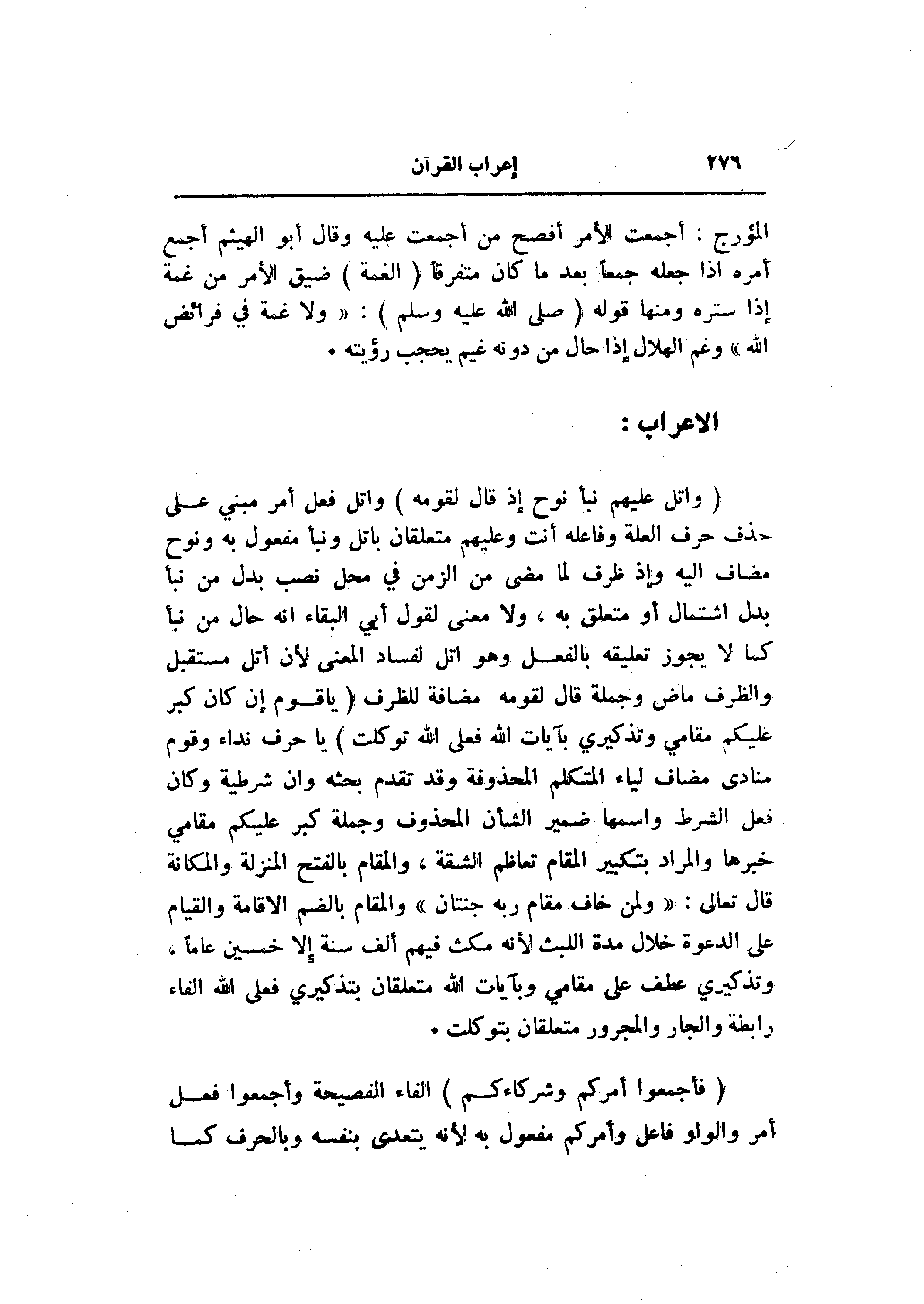 (وَاتْلُ عَلَيْهِمْ نَبَأَ نُوحٍ إِذْ قالَ لِقَوْمِهِ) واتل فعل أمر مبني على حذف حرف العلة وفاعله أنت وعليهم متعلقان باتل ونبأ مفعول به ونوح مضاف اليه وإذ ظرف لما مضى من الزمن في محل نصب بدل من نبأ بدل اشتمال أو متعلق به، ولا معنى لقول أبي البقاء انه حال من نبأ كما لا يجوز تعليقه بالفعل وهو اتل لفساد المعنى لأن أتل مستقبل والظرف ماض وجملة قال لقومه مضافة للظرف (يا قَوْمِ إِنْ كانَ كَبُرَ عَلَيْكُمْ مَقامِي وَتَذْكِيرِي بِآياتِ اللَّهِ فَعَلَى اللَّهِ تَوَكَّلْتُ) يا حرف نداء وقوم منادى مضاف لياء المتكلم المحذوفة وقد تقدم بحثه وان شرطية وكان فعل الشرط واسمها ضمير الشأن المحذوف وجملة كبر عليكم مقامي خبرها والمراد بتكبير المقام تعاظم الشقة، والمقام بالفتح المنزلة والمكانة قال تعالى: «ولمن خاف مقام ربه جنتان» والمقام بالضم الاقامة والقيام على الدعوة خلال مدة اللبث لأنه مكث فيهم ألف سنة إلا خمسين عاما، وتذكيري عطف على مقامي وبآيات الله متعلقان بتذكيري فعلى الله الفاء رابطة والجار والمجرور متعلقان بتوكلت.