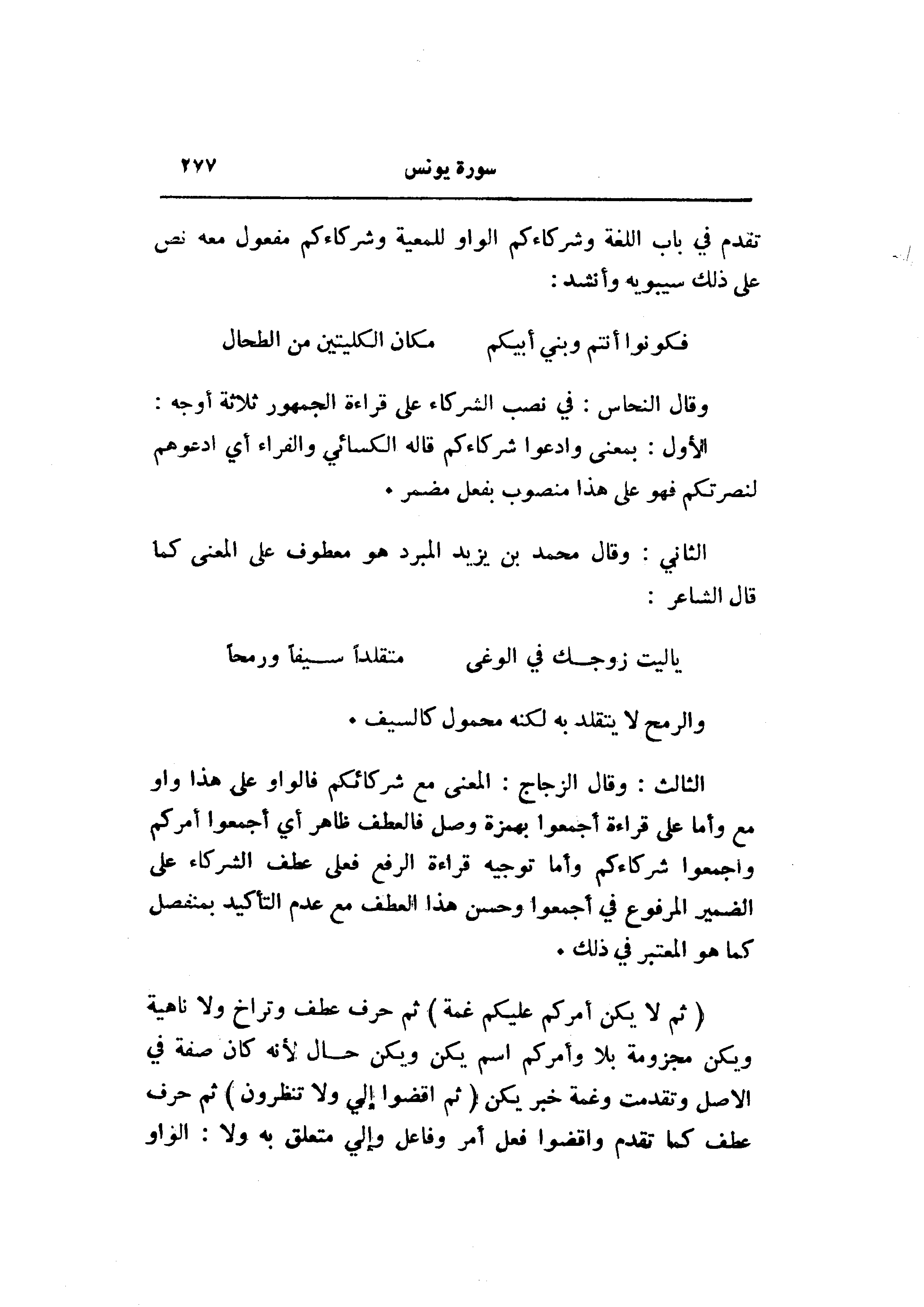 الثالث: وقال الزجاج: المعنى مع شركائكم فالواو على هذا واو مع وأما على قراءة أجمعوا بهمزة وصل فالعطف ظاهر أي أجمعوا أمركم واجمعوا شركاءكم وأما توجيه قراءة الرفع فعلى عطف الشركاء على الضمير المرفوع في أجمعوا وحسن هذا العطف مع عدم التأكيد بمنفصل كما هو المعتبر في ذلك.