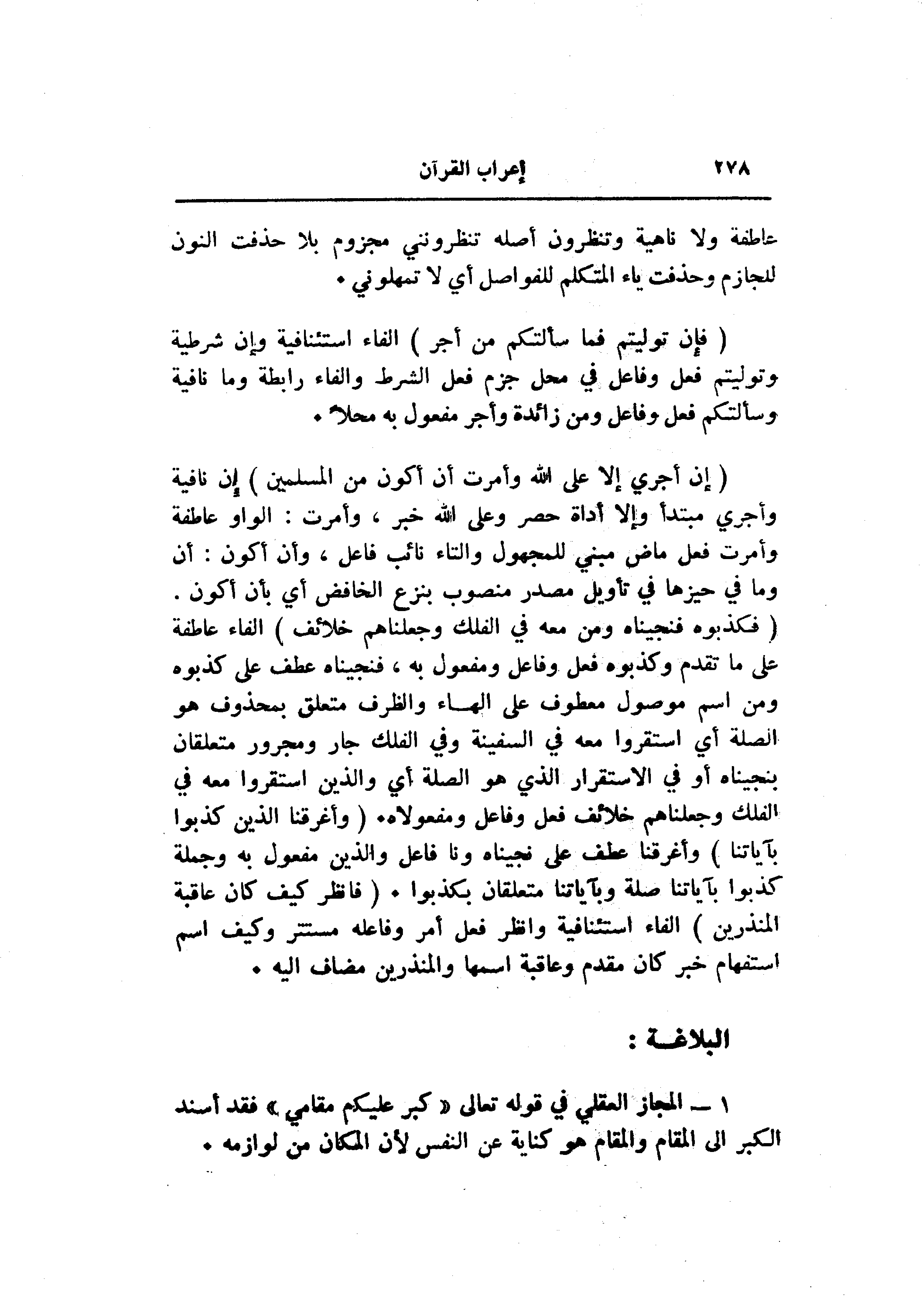 (فَكَذَّبُوهُ فَنَجَّيْناهُ وَمَنْ مَعَهُ فِي الْفُلْكِ وَجَعَلْناهُمْ خَلائِفَ) الفاء عاطفة على ما تقدم وكذبوه فعل وفاعل ومفعول به، فنجيناه عطف على كذبوه ومن اسم موصول معطوف على الهاء والظرف متعلق بمحذوف هو الصلة أي استقروا معه في السفينة وفي الفلك جار ومجرور متعلقان بنجيناه أو في الاستقرار الذي هو الصلة أي والذين استقروا معه في الفلك وجعلناهم خلائف فعل وفاعل ومفعولاه. (وَأَغْرَقْنَا الَّذِينَ كَذَّبُوا بِآياتِنا) وأغرقنا عطف على نجيناه ونا فاعل والذين مفعول به وجملة كذبوا بآياتنا صلة وبآياتنا متعلقان بكذبوا. (فَانْظُرْ كَيْفَ كانَ عاقِبَةُ الْمُنْذَرِينَ) الفاء استئنافية وانظر فعل أمر وفاعله مستتر وكيف اسم استفهام خبر كان مقدم وعاقبة اسمها والمنذرين مضاف اليه.