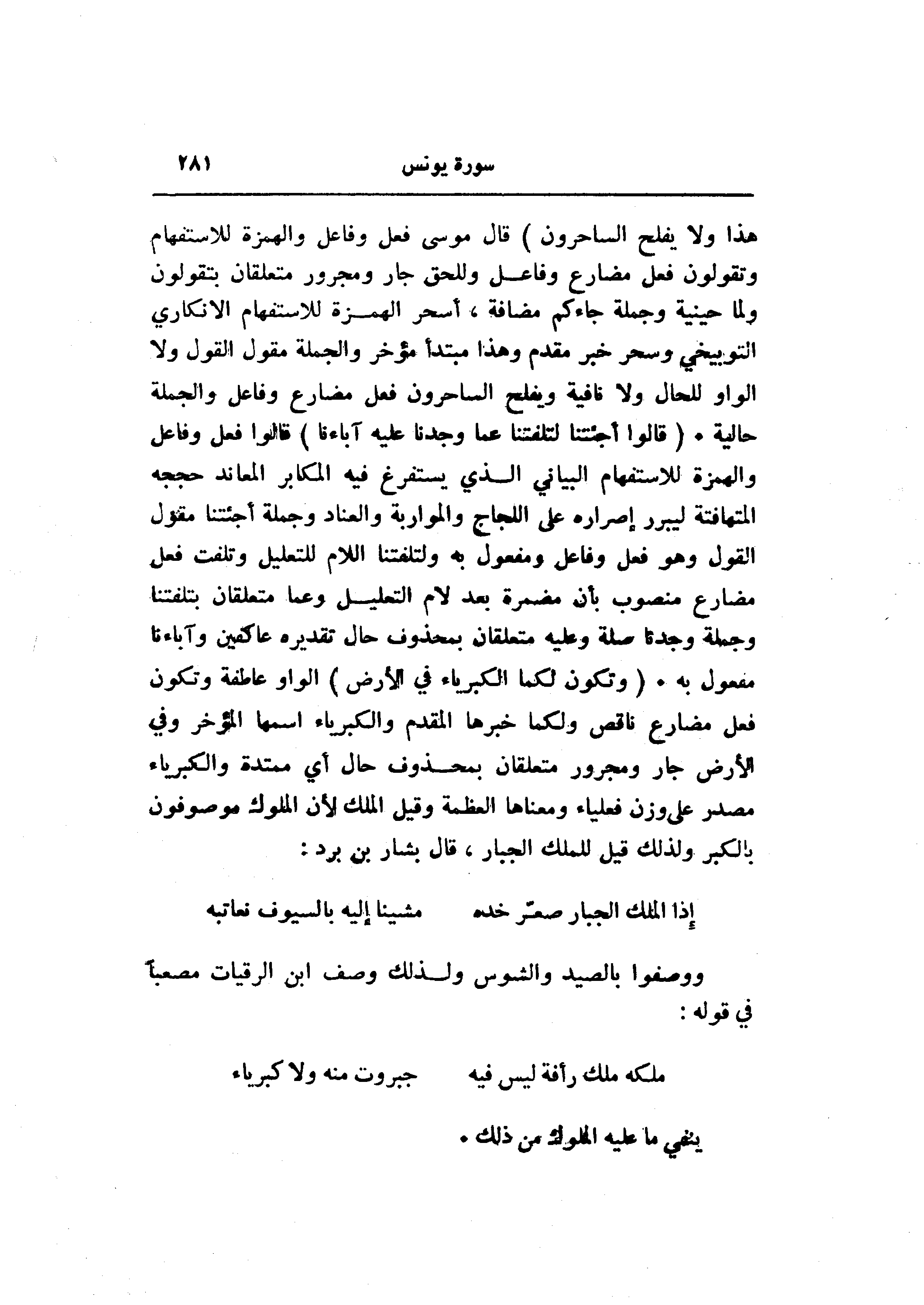 قال موسى فعل وفاعل والهمزة للاستفهام وتقولون فعل مضارع وفاعل وللحق جار ومجرور متعلقان بتقولون ولما حينية وجملة جاءكم مضافة، أسحر الهمزة للاستفهام الانكاري التوبيخي وسحر خبر مقدم وهذا مبتدأ مؤخر والجملة مقول القول ولا الواو للحال ولا نافية ويفلح الساحرون فعل مضارع وفاعل والجملة حالية. (قالُوا أَجِئْتَنا لِتَلْفِتَنا عَمَّا وَجَدْنا عَلَيْهِ آباءَنا) قالوا فعل وفاعل والهمزة للاستفهام البياني الذي يستفرغ فيه المكابر المعاند حججه المتهافتة ليبرر إصرار على اللجاج والمواربة والعناد وجملة أجئتنا مقول القول وهو فعل وفاعل ومفعول به ولتلفتنا اللام للتعليل وتلفت فعل مضارع منصوب بأن مضمرة بعد لام التعليل وعما متعلقان بتلفتنا وجملة وجدنا صلة وعليه متعلقان بمحذوف حال تقديره عاكفين وآباءنا مفعول به. (وَتَكُونَ لَكُمَا الْكِبْرِياءُ فِي الْأَرْضِ) الواو عاطفة وتكون فعل مضارع ناقص ولكما خبرها المقدم والكبرياء اسمها المؤخر وفي الأرض جار ومجرور متعلقان بمحذوف حال أي ممتدة والكبرياء مصدر على وزن فعلياء ومعناها العظمة وقيل الملك لأن الملوك موصوفون بالكبر ولذلك قيل للملك الجبار، قال بشار بن برد: