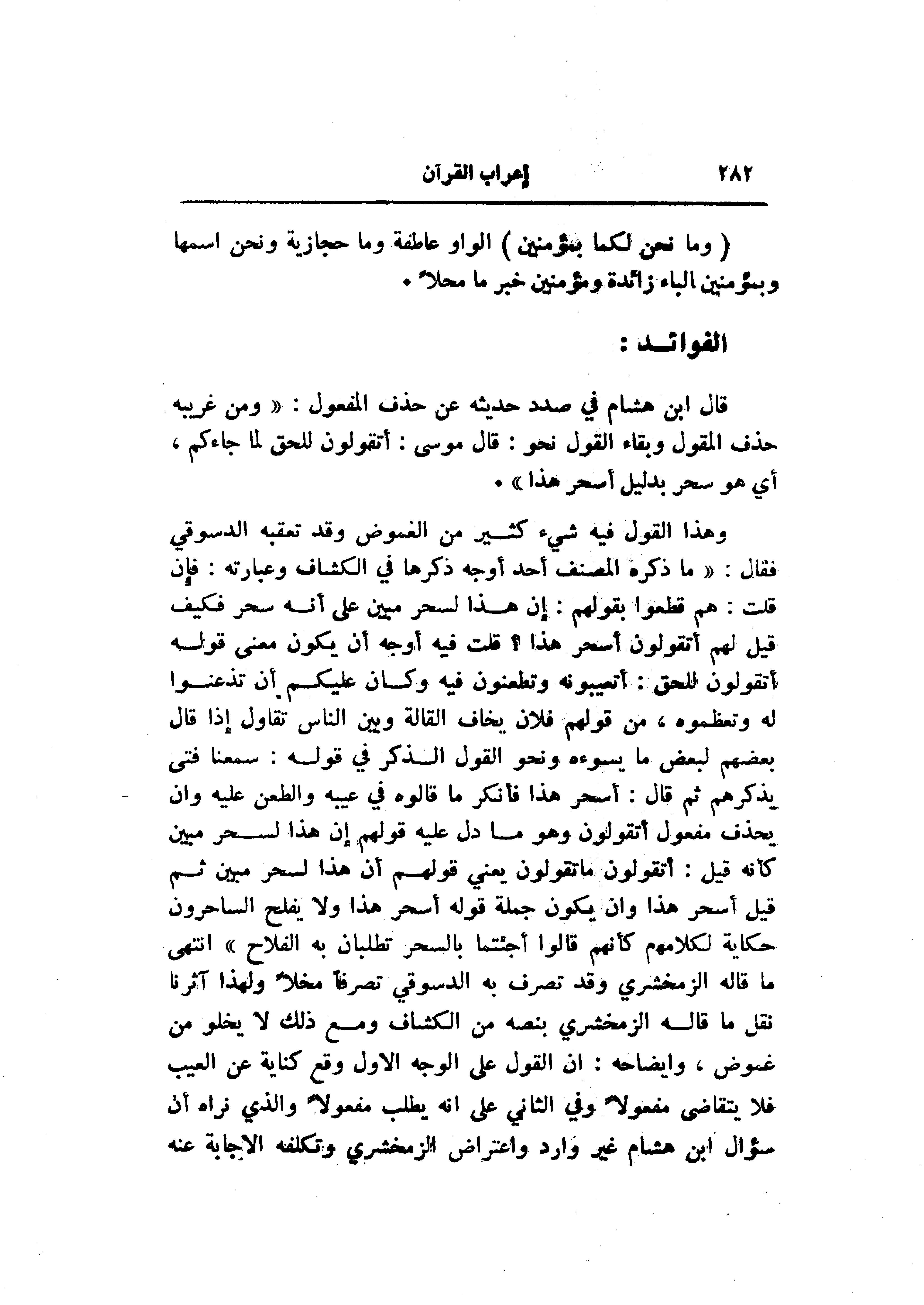 وهذا القول فيه شيء كثير من الغموض وقد تعقبه الدسوقي فقال: «ما ذكره المصنف أحد أوجه ذكرها في الكشاف وعبارته: فإن قلت: هم قطعوا بقولهم: إن هذا لسحر مبين على أنه سحر فكيف قيل لهم أتقولون أسحر هذا؟ قلت فيه أوجه أن يكون معنى قوله أتقولون للحق: أتعيبونه وتطعنون فيه وكان عليكم أن تذعنوا له وتعظموه، من قولهم فلان يخاف القالة وبين الناس تقاول إذا قال بعضهم لبعض ما يسوءه ونحو القول الذكر في قوله: سمعنا فتى يذكرهم ثم قال: أسحر هذا فأنكر ما قالوه في عيبه والطعن عليه وان يحذف مفعول أتقولون وهو ما دل عليه قولهم إن هذا لسحر مبين كأنه قيل: أتقولون ما تقولون يعني قولهم أن هذا لسحر مبين ثم قيل أسحر هذا وان يكون جملة قوله أسحر هذا ولا يفلح الساحرون حكاية لكلامهم كأنهم قالوا أجئتما بالسحر تطلبان به الفلاح» انتهى ما قاله الزمخشري وقد تصرف به الدسوقي تصرفا مخلا ولهذا آثرنا نقل ما قاله الزمخشري بنصه من الكشاف ومع ذلك لا يخلو من غموض، وإيضاحه: ان القول على الوجه الاول وقع كناية عن العيب فلا يتقاضى مفعولا وفي الثاني على انه يطلب مفعولا والذي نراه أن سؤال ابن هشام غير وارد واعتراض الزمخشري وتكلفه الاجابة عنه