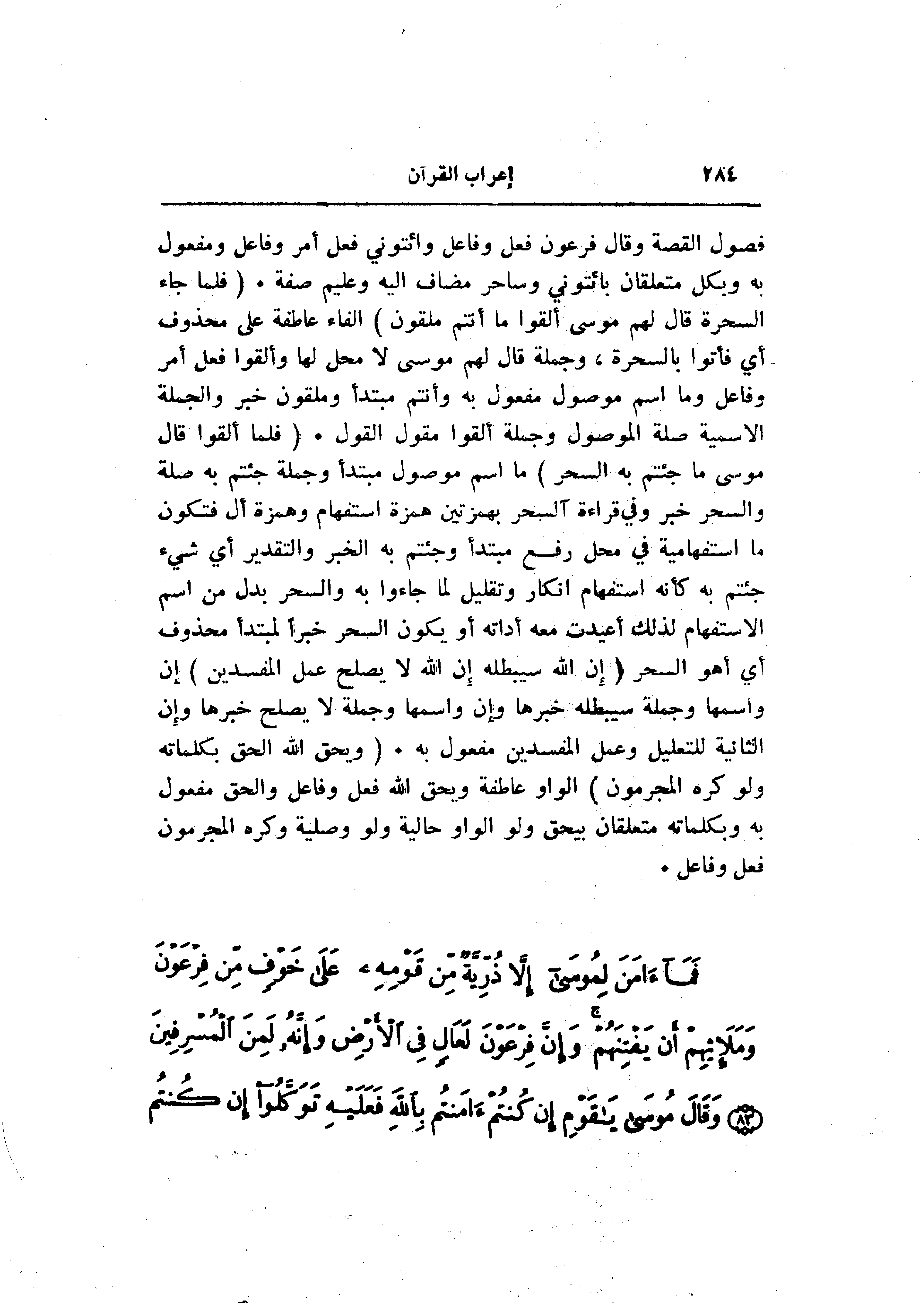 فصول القصة وقال فرعون فعل وفاعل وائتوني فعل أمر وفاعل ومفعول به وبكل متعلقان بائتوني وساحر مضاف اليه وعليم صفة. (فَلَمَّا جاءَ السَّحَرَةُ قالَ لَهُمْ مُوسى أَلْقُوا ما أَنْتُمْ مُلْقُونَ) الفاء عاطفة على محذوف أي فأتوا بالسحرة، وجملة قال لهم موسى لا محل لها وألقوا فعل أمر وفاعل وما اسم موصول مفعول به وأنتم مبتدأ وملقون خبر والجملة الاسمية صلة الموصول وجملة ألقوا مقول القول. (فَلَمَّا أَلْقَوْا قالَ مُوسى ما جِئْتُمْ بِهِ السِّحْرُ) ما اسم موصول مبتدأ وجملة جئتم به صلة والسحر خبر وفي قراءة آلسحر بهمزتين همزة استفهام وهمزة أل فتكون ما استفهامية في محل رفع مبتدأ وجئتم به الخبر والتقدير أي شيء جئتم به كأنه استفهام انكار وتقليل لما جاءوا به والسحر بدل من اسم الاستفهام لذلك أعيدت معه أداته أو يكون السحر خبرا لمبتدأ محذوف أي أهو السحر (إِنَّ اللَّهَ سَيُبْطِلُهُ إِنَّ اللَّهَ لا يُصْلِحُ عَمَلَ الْمُفْسِدِينَ) إن واسمها وجملة سيبطله خبرها وإن واسمها وجملة لا يصلح خبرها وإن الثانية للتعليل وعمل المفسدين مفعول به. (وَيُحِقُّ اللَّهُ الْحَقَّ بِكَلِماتِهِ وَلَوْ كَرِهَ الْمُجْرِمُونَ) الواو عاطفة ويحق الله فعل وفاعل والحق مفعول به وبكلماته متعلقان بيحق ولو الواو حالية ولو وصلية وكره المجرمون فعل وفاعل.