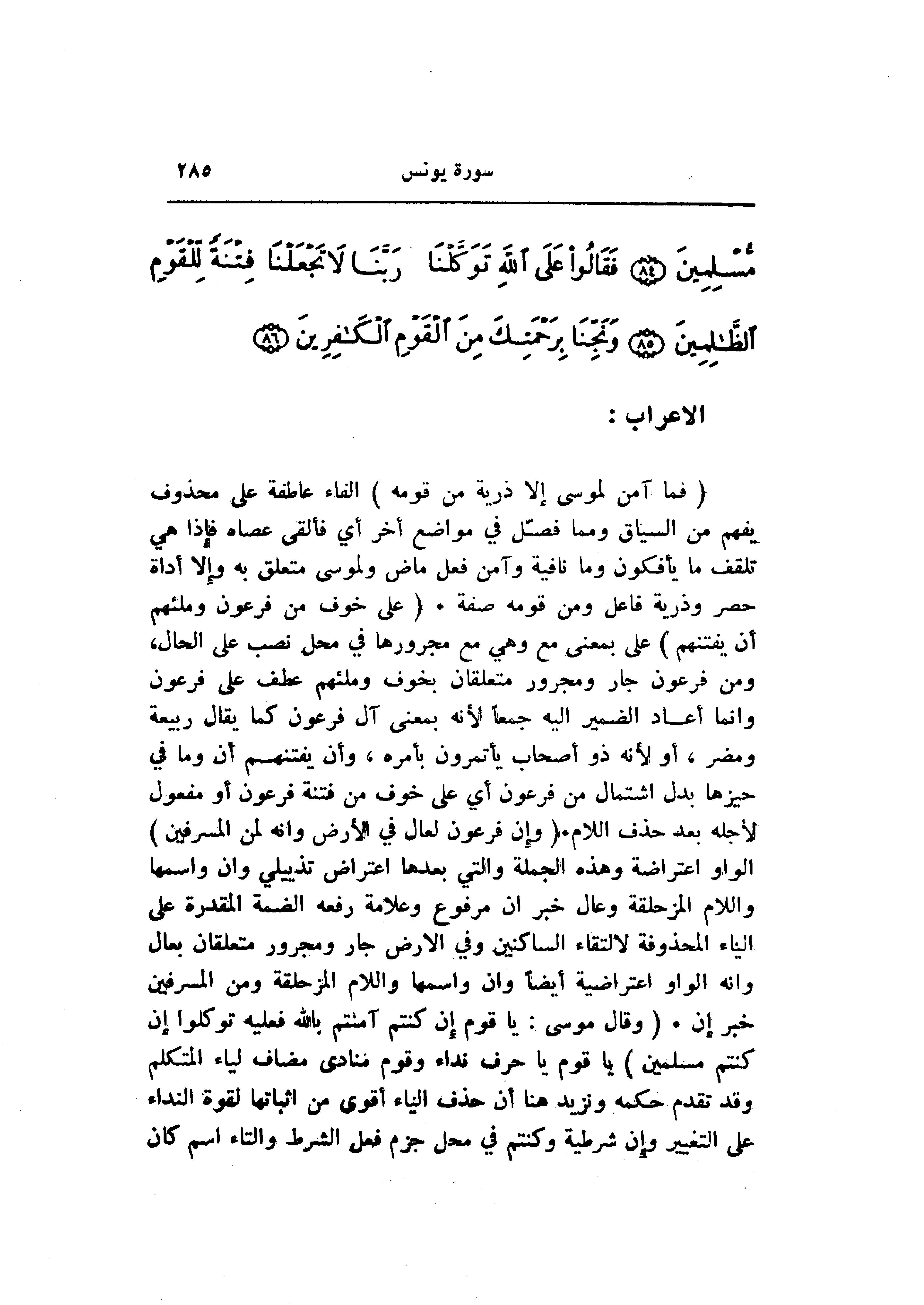 (فَما آمَنَ لِمُوسى إِلَّا ذُرِّيَّةٌ مِنْ قَوْمِهِ) الفاء عاطفة على محذوف يفهم من السياق ومما فصّل في مواضع أخر أي فألقى عصاه فإذا هي تلقف ما يأفكون وما نافية وآمن فعل ماض ولموسى متعلق به وإلا أداة حصر وذرية فاعل ومن قومه صفة. (عَلى خَوْفٍ مِنْ فِرْعَوْنَ وَمَلَائِهِمْ أَنْ يَفْتِنَهُمْ) على بمعنى مع وهي مع مجرورها في محل نصب على الحال، ومن فرعون جار ومجرور متعلقان بخوف وملئهم عطف على فرعون وانما أعاد الضمير اليه جمعا لأنه بمعنى آل فرعون كما يقال ربيعة ومضر، أو لأنه ذو أصحاب يأتمرون بأمره، وأن يفتنهم أن وما في حيزها بدل اشتمال من فرعون أي على خوف من فتنة فرعون أو مفعول لأجله بعد حذف اللام. (وَإِنَّ فِرْعَوْنَ لَعالٍ فِي الْأَرْضِ وَإِنَّهُ لَمِنَ الْمُسْرِفِينَ) الواو اعتراضية وهذه الجملة والتي بعدها اعتراض تذييلي وان واسمها واللام المزحلقة وعال خبر ان مرفوع وعلامة رفعه الضمة المقدرة على الياء المحذوفة لالتقاء الساكنين وفي الأرض جار ومجرور متعلقان بعال وانه الواو اعتراضية أيضا وان واسمها واللام المزحلقة ومن المسرفين خبر إن. (وَقالَ مُوسى: يا قَوْمِ إِنْ كُنْتُمْ آمَنْتُمْ بِاللَّهِ فَعَلَيْهِ تَوَكَّلُوا إِنْ كُنْتُمْ مُسْلِمِينَ) يا قوم يا حرف نداء وقوم منادى مضاف لياء المتكلم وقد تقدم حكمه ونزيد هنا أن حذف الياء أقوى من إثباتها لقوة النداء على التغيير وإن شرطية وكنتم في محل جزم فعل الشرط والتاء اسم كان