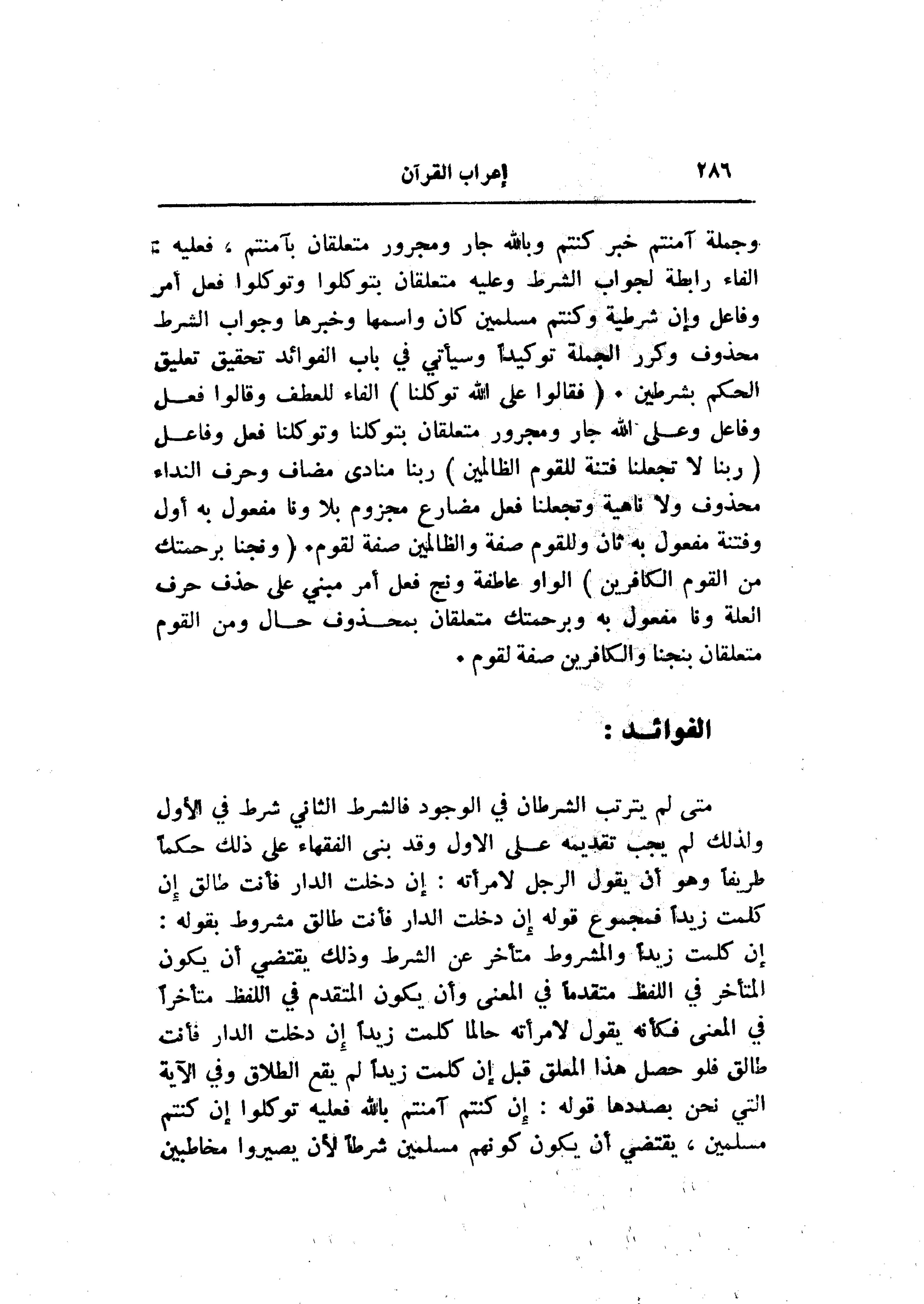 إن كلمت زيدا والمشروط متأخر عن الشرط وذلك يقتضي أن يكون المتأخر في اللفظ متقدما في المعنى وأن يكون المتقدم في اللفظ متأخرا في المعنى فكأنه يقول لامرأته حالما كلمت زيدا إن دخلت الدار فأنت طالق فلو حصل هذا المعلق قبل إن كلمت زيدا لم يقع الطلاق وفي الآية التي نحن بصددها قوله: إن كنتم آمنتم بالله فعليه توكلوا إن كنتم مسلمين، يقتضي أن يكون كونهم مسلمين شرطا لأن يصيروا مخاطبين