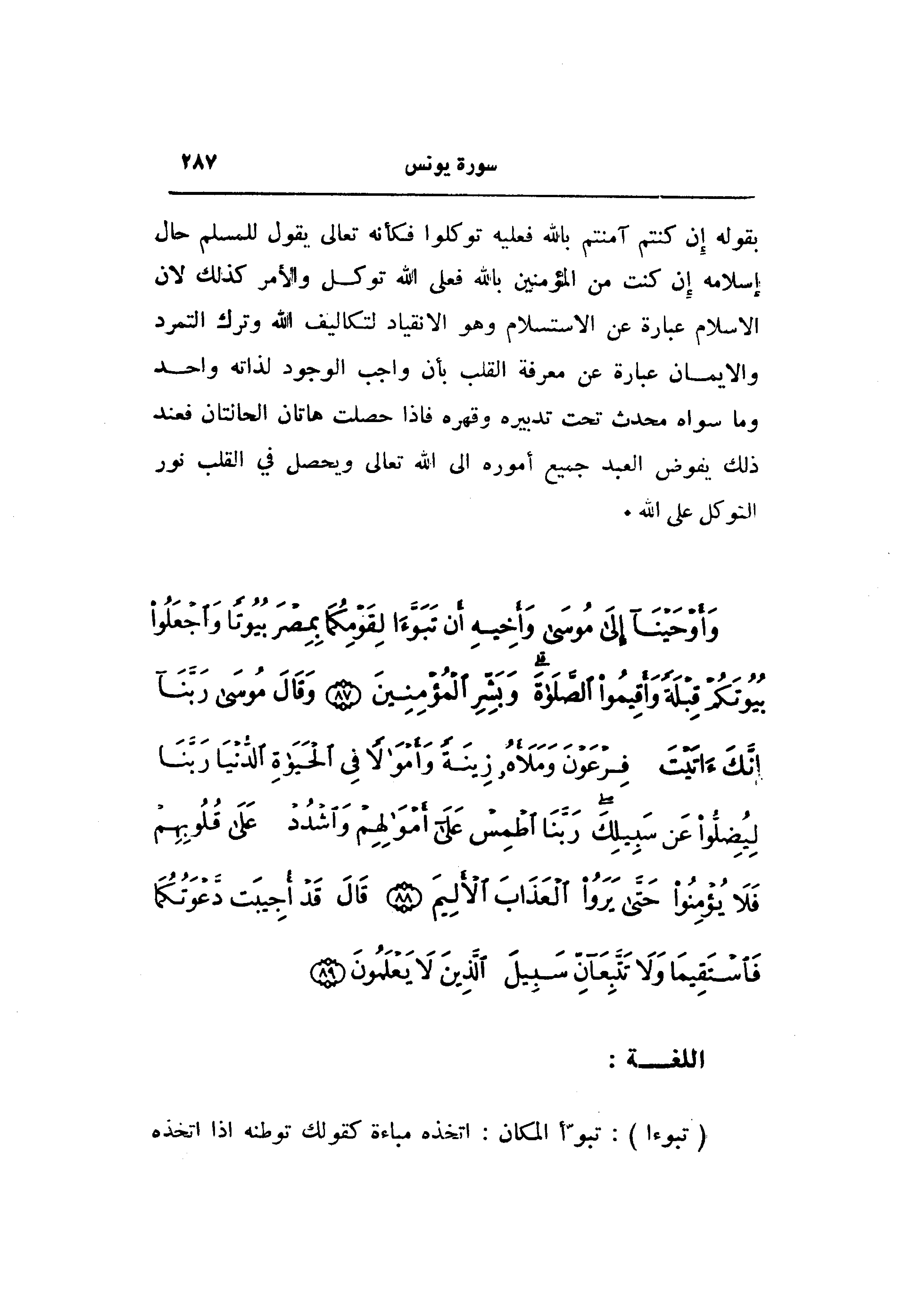 بقوله إن كنتم آمنتم بالله فعليه توكلوا فكأنه تعالى يقول للمسلم حال إسلامه إن كنت من المؤمنين بالله فعلى الله توكل والأمر كذلك لان الإسلام عبارة عن الاستسلام وهو الانقياد لتكاليف الله وترك التمرد والايمان عبارة عن معرفة القلب بأن واجب الوجود لذاته واحد وما سواه محدث تحت تدبيره وقهره فاذا حصلت هاتان الحالتان فعند ذلك يفوض العبد جميع أموره الى الله تعالى ويحصل في القلب نور التوكل على الله.