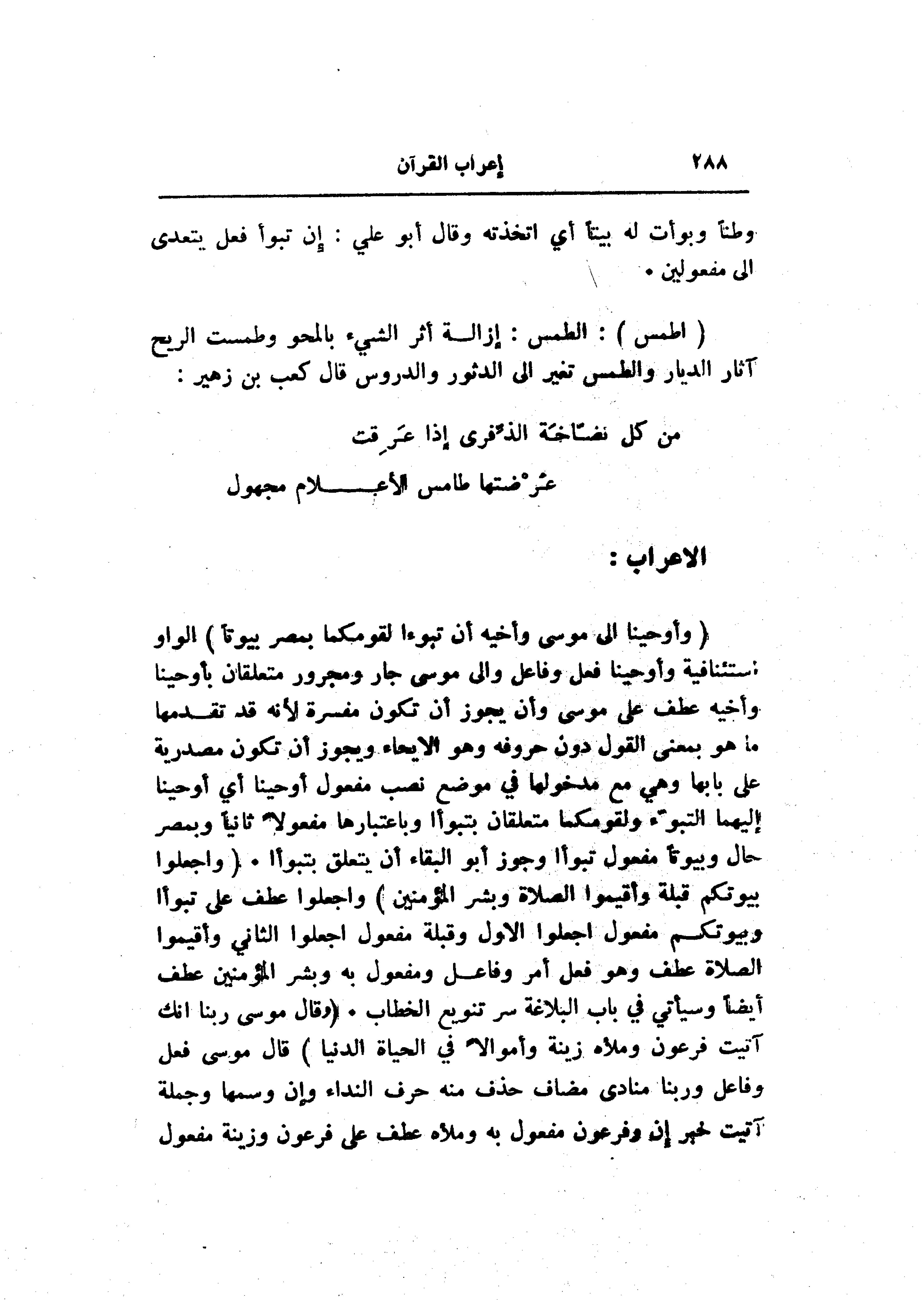 (وَأَوْحَيْنا إِلى مُوسى وَأَخِيهِ أَنْ تَبَوَّءا لِقَوْمِكُما بِمِصْرَ بُيُوتاً) الواو استئنافية وأوحينا فعل وفاعل والى موسى جار ومجرور متعلقان بأوحينا وأخيه عطف على موسى وأن يجوز أن تكون مفسرة لأنه قد تقدمها ما هو بمعنى القول دون حروفه وهو الإيحاء ويجوز أن تكون مصدرية على بابها وهي مع مدخولها في موضع نصب مفعول أوحينا أي أوحينا إليهما التبوّء ولقومكما متعلقان بتبوءا وباعتبارها مفعولا ثانيا وبمصر حال وبيوتا مفعول تبوأا وجوز أبو البقاء أن يتعلق بتبوءا. (وَاجْعَلُوا بُيُوتَكُمْ قِبْلَةً وَأَقِيمُوا الصَّلاةَ وَبَشِّرِ الْمُؤْمِنِينَ) واجعلوا عطف على تبوأا وبيوتكم مفعول اجعلوا الاول وقبلة مفعول اجعلوا الثاني وأقيموا الصلاة عطف وهو فعل أمر وفاعل ومفعول به وبشر المؤمنين عطف أيضا وسيأتي في باب البلاغة سر تنويع الخطاب. (وَقالَ مُوسى رَبَّنا إِنَّكَ آتَيْتَ فِرْعَوْنَ وَمَلَأَهُ زِينَةً وَأَمْوالًا فِي الْحَياةِ الدُّنْيا) قال موسى فعل وفاعل وربنا منادى مضاف حذف منه حرف النداء وإن وسمها وجملة آتيت خبر إن وفرعون مفعول به وملأه عطف على فرعون وزينة مفعول