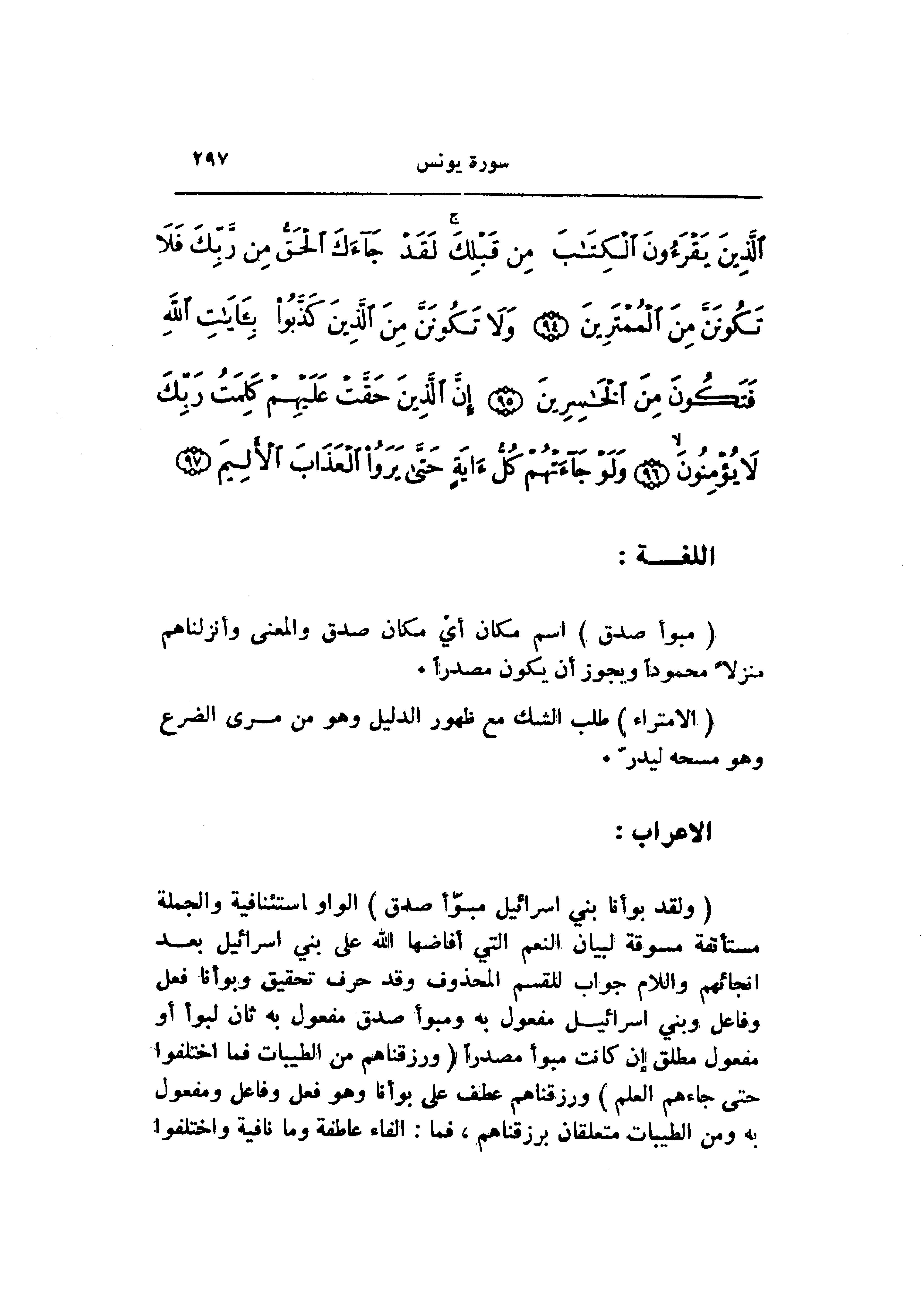 (وَلَقَدْ بَوَّأْنا بَنِي إِسْرائِيلَ مُبَوَّأَ صِدْقٍ) الواو استئنافية والجملة مستأنفة مسوقة لبيان النعم التي أفاضها الله على بني إسرائيل بعد انجائهم واللام جواب للقسم المحذوف وقد حرف تحقيق وبوأنا فعل وفاعل وبني إسرائيل مفعول به ومبوأ صدق مفعول به ثان لبوأ أو مفعول مطلق إن كانت مبوأ مصدرا (وَرَزَقْناهُمْ مِنَ الطَّيِّباتِ فَمَا اخْتَلَفُوا حَتَّى جاءَهُمُ الْعِلْمُ) ورزقناهم عطف على بوأنا وهو فعل وفاعل ومفعول به ومن الطيبات متعلقان برزقناهم، فما: الفاء عاطفة وما نافية واختلفوا
