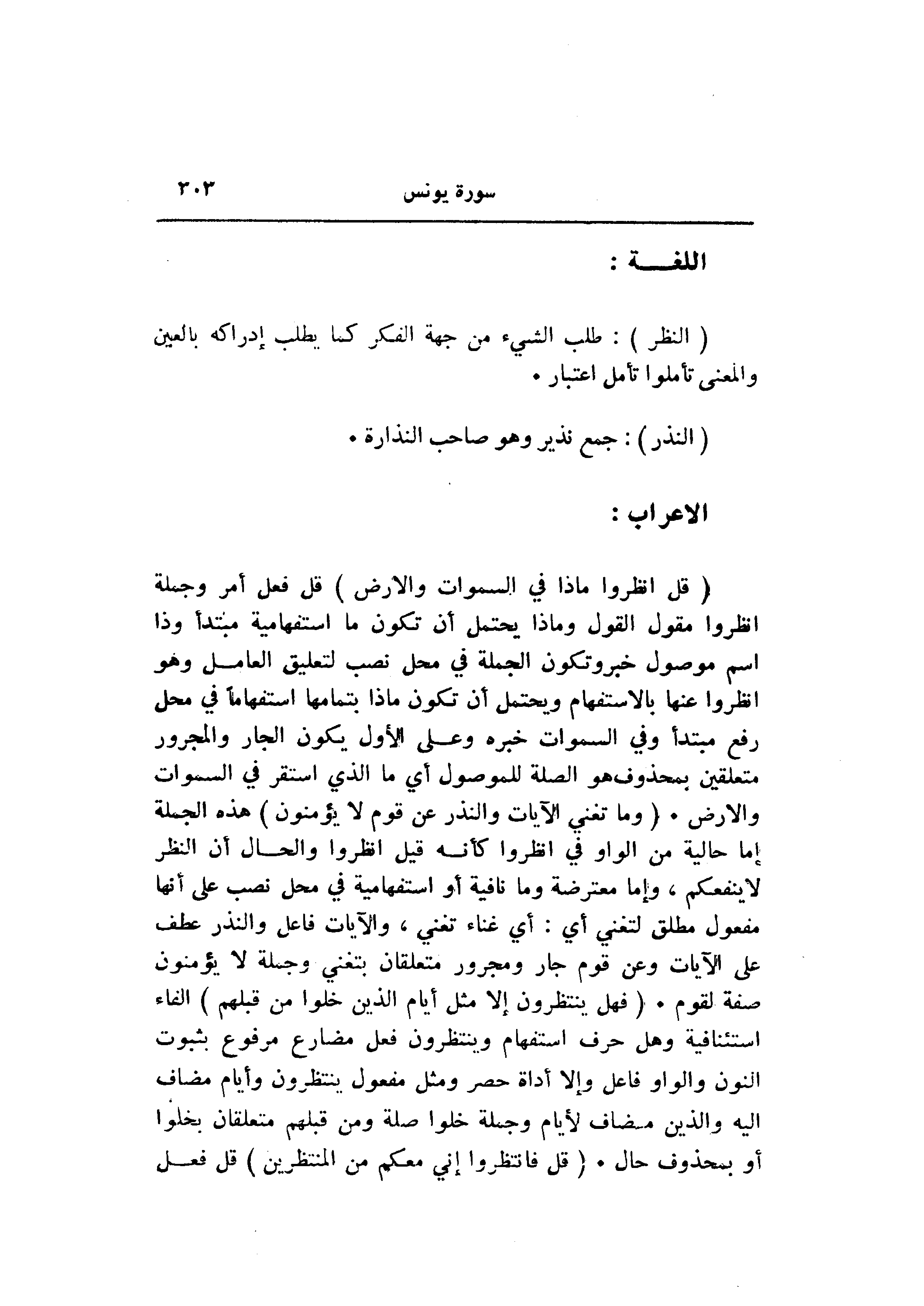 (قُلِ انْظُرُوا ماذا فِي السَّماواتِ وَالْأَرْضِ) قل فعل أمر وجملة انظروا مقول القول وماذا يحتمل أن تكون ما استفهامية مبتدأ وذا اسم موصول خبر وتكون الجملة في محل نصب لتعليق العامل وهو انظروا عنها بالاستفهام ويحتمل أن تكون ماذا بتمامها استفهاما في محل رفع مبتدأ وفي السموات خبره وعلى الأول يكون الجار والمجرور متعلقين بمحذوف هو الصلة للموصول أي ما الذي استقر في السموات والأرض. (وَما تُغْنِي الْآياتُ وَالنُّذُرُ عَنْ قَوْمٍ لا يُؤْمِنُونَ) هذه الجملة إما حالية من الواو في انظروا كأنه قيل انظروا والحال أن النظر لا ينفعكم، وإما معترضة وما نافية أو استفهامية في محل نصب على أنها مفعول مطلق لتغني أي: أي غناء تغني، والآيات فاعل والنذر عطف على الآيات وعن قوم جار ومجرور متعلقان بتغني وجملة لا يؤمنون صفة لقوم. (فَهَلْ يَنْتَظِرُونَ إِلَّا مِثْلَ أَيَّامِ الَّذِينَ خَلَوْا مِنْ قَبْلِهِمْ) الفاء استئنافية وهل حرف استفهام وينتظرون فعل مضارع مرفوع بثبوت النون والواو فاعل وإلا أداة حصر ومثل مفعول ينتظرون وأيام مضاف اليه والذين مضاف لأيام وجملة خلوا صلة ومن قبلهم متعلقان بخلوا أو بمحذوف حال. (قُلْ فَانْتَظِرُوا إِنِّي مَعَكُمْ مِنَ الْمُنْتَظِرِينَ) قل فعل