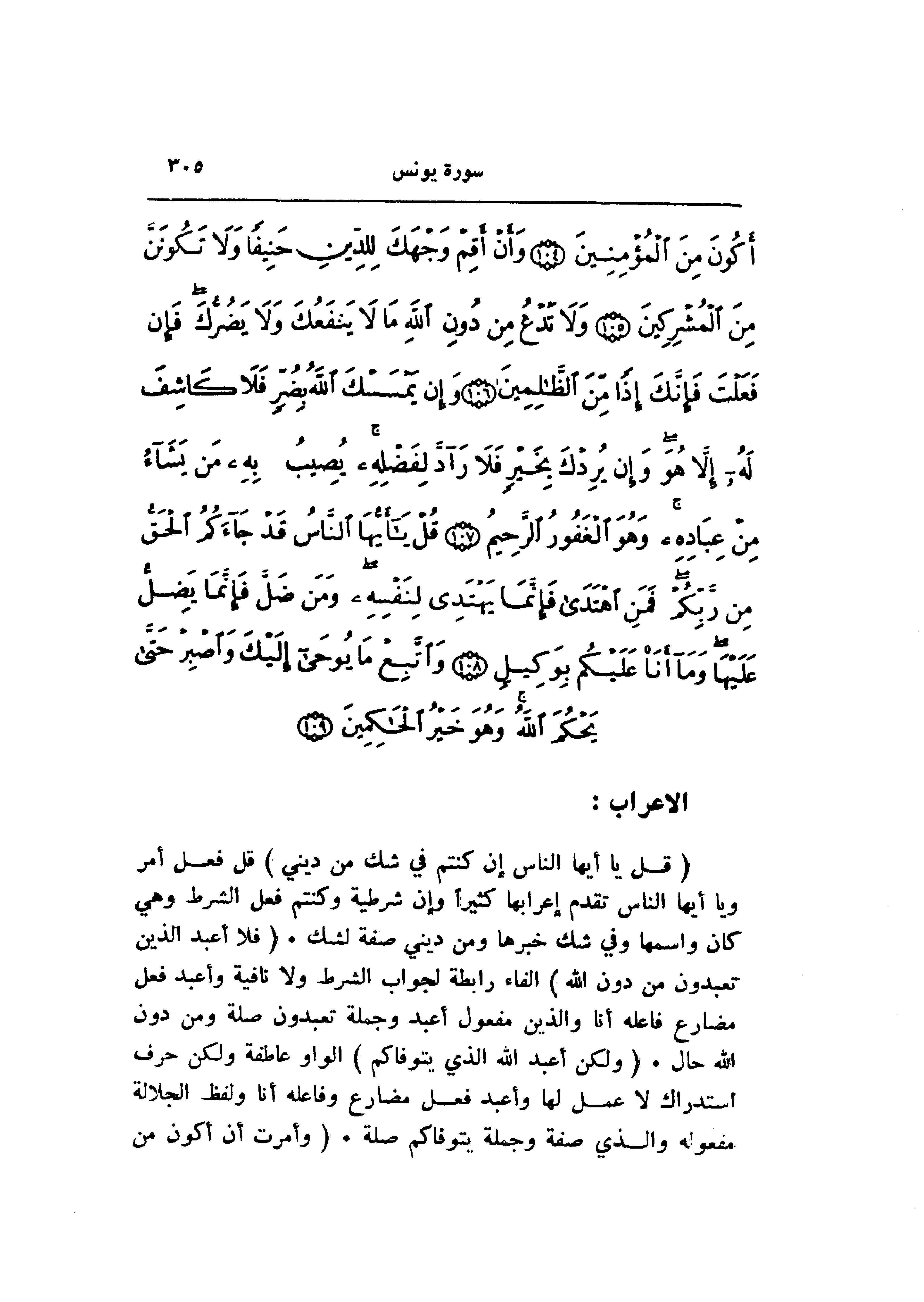 (قُلْ يا أَيُّهَا النَّاسُ إِنْ كُنْتُمْ فِي شَكٍّ مِنْ دِينِي) قل فعل أمر ويا أيها الناس تقدم إعرابها كثيرا وإن شرطية وكنتم فعل الشرط وهي كان واسمها وفي شك خبرها ومن ديني صفة لشك. (فَلا أَعْبُدُ الَّذِينَ تَعْبُدُونَ مِنْ دُونِ اللَّهِ) الفاء رابطة لجواب الشرط ولا نافية وأعبد فعل مضارع فاعله أنا والذين مفعول أعبد وجملة تعبدون صلة ومن دون الله حال. (وَلكِنْ أَعْبُدُ اللَّهَ الَّذِي يَتَوَفَّاكُمْ) الواو عاطفة ولكن حرف استدراك لا عمل لها وأعبد فعل مضارع وفاعله أنا ولفظ الجلالة مفعوله والذي صفة وجملة يتوفاكم صلة. (وَأُمِرْتُ أَنْ أَكُونَ مِنَ الْمُؤْمِنِينَ)