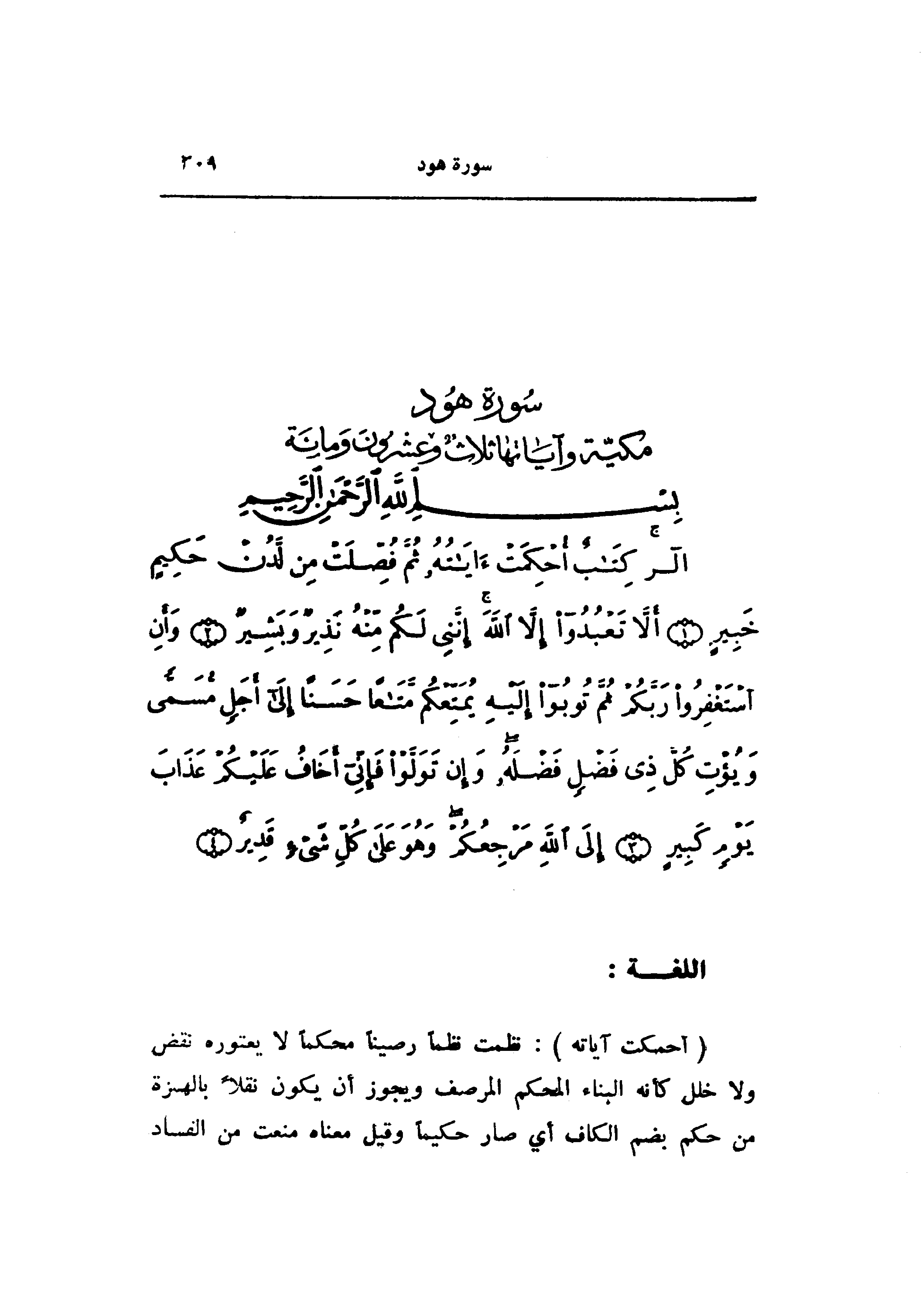 الر كِتابٌ أُحْكِمَتْ آياتُهُ ثُمَّ فُصِّلَتْ مِنْ لَدُنْ حَكِيمٍ خَبِيرٍ (1) أَلاَّ تَعْبُدُوا إِلاَّ اللَّهَ إِنَّنِي لَكُمْ مِنْهُ نَذِيرٌ وَبَشِيرٌ (2) وَأَنِ اسْتَغْفِرُوا رَبَّكُمْ ثُمَّ تُوبُوا إِلَيْهِ يُمَتِّعْكُمْ مَتاعاً حَسَناً إِلى أَجَلٍ مُسَمًّى وَيُؤْتِ كُلَّ ذِي فَضْلٍ فَضْلَهُ وَإِنْ تَوَلَّوْا فَإِنِّي أَخافُ عَلَيْكُمْ عَذابَ يَوْمٍ كَبِيرٍ (3) إِلَى اللَّهِ مَرْجِعُكُمْ وَهُوَ عَلى كُلِّ شَيْءٍ قَدِيرٌ (4)
