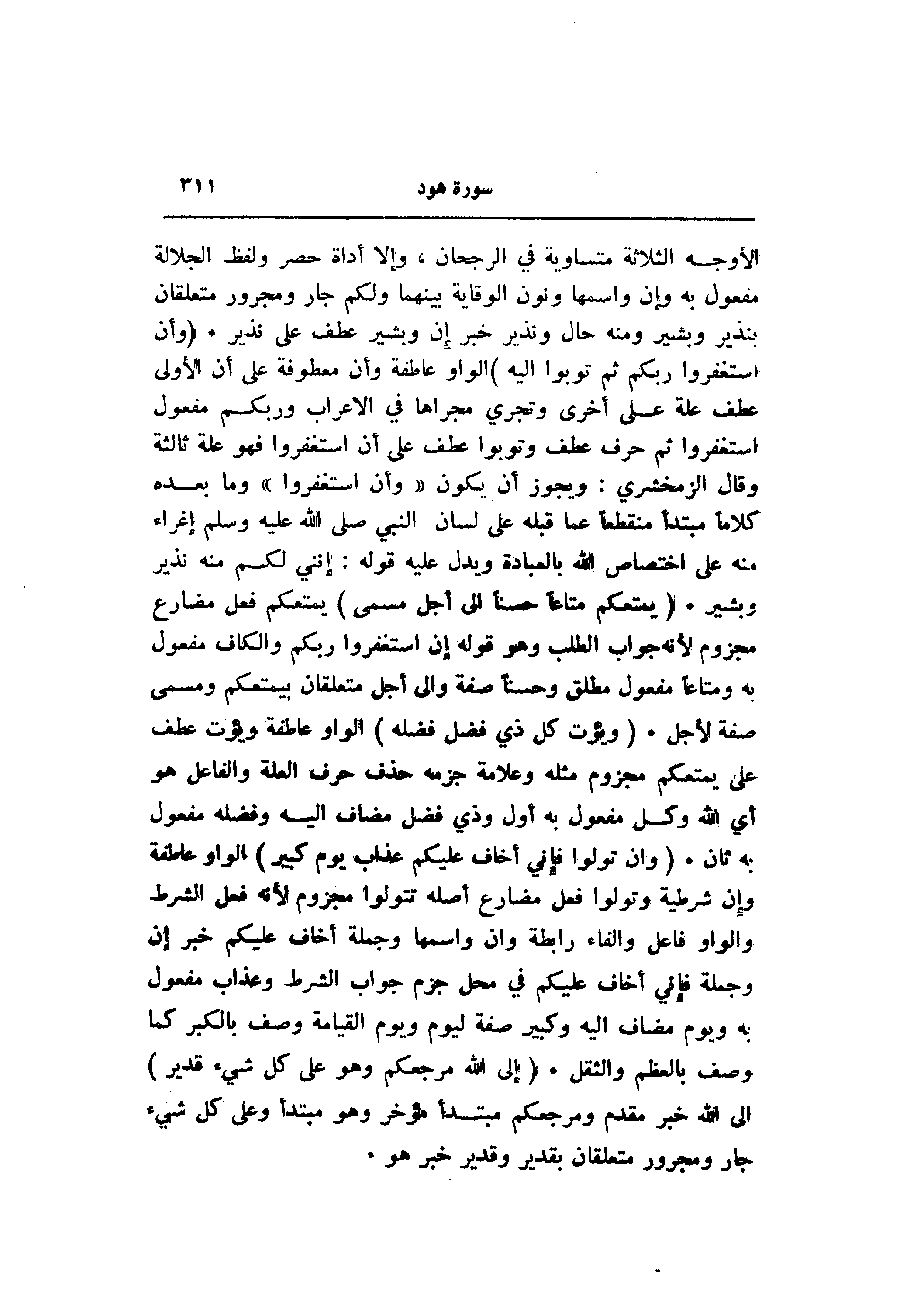 الأوجه الثلاثة متساوية في الرجحان، وإلا أداة حصر ولفظ الجلالة مفعول به وإن واسمها ونون الوقاية بينهما ولكم جار ومجرور متعلقان بنذير وبشير ومنه حال ونذير خبر إن وبشير عطف على نذير. (وَأَنِ اسْتَغْفِرُوا رَبَّكُمْ ثُمَّ تُوبُوا إِلَيْهِ) الواو عاطفة وأن معطوفة على أن الأولى عطف علة على أخرى وتجري مجراها في الاعراب وربكم مفعول استغفروا ثم حرف عطف وتوبوا عطف على أن استغفروا فهو علة ثالثة وقال الزمخشري: ويجوز أن يكون «وأن استغفروا» وما بعده كلاما مبتدأ منقطعا عما قبله على لسان النبي صلى الله عليه وسلم إغراء منه على اختصاص الله بالعبادة ويدل عليه قوله: إنني لكم منه نذير وبشير. (يُمَتِّعْكُمْ مَتاعاً حَسَناً إِلى أَجَلٍ مُسَمًّى) يمتعكم فعل مضارع مجزوم لأنه جواب الطلب وهو قوله إن استغفروا ربكم والكاف مفعول به ومتاعا مفعول مطلق وحسنا صفة والى أجل متعلقان بيمتعكم ومسمى صفة لأجل. (وَيُؤْتِ كُلَّ ذِي فَضْلٍ فَضْلَهُ) الواو عاطفة ويوت عطف على يمتعكم مجزوم مثله وعلامة جزمه حذف حرف العلة والفاعل هو أي الله وكل مفعول به أول وذي فضل مضاف اليه وفضله مفعول به ثان. (وَإِنْ تَوَلَّوْا فَإِنِّي أَخافُ عَلَيْكُمْ عَذابَ يَوْمٍ كَبِيرٍ) الواو عاطفة وإن شرطية وتولوا فعل مضارع أصله تتولوا مجزوم لأنه فعل الشرط والواو فاعل والفاء رابطة وان واسمها وجملة أخاف عليكم خبر إن وجملة فإني أخاف عليكم في محل جزم جواب الشرط وعذاب مفعول به ويوم مضاف اليه وكبير صفة ليوم ويوم القيامة وصف بالكبر كما وصف بالعظم والثقل. (إِلَى اللَّهِ مَرْجِعُكُمْ وَهُوَ عَلى كُلِّ شَيْءٍ قَدِيرٌ) الى الله خبر مقدم ومرجعكم مبتدأ مؤخر وهو مبتدأ وعلى كل شيء جار ومجرور متعلقان بقدير وقدير خبر هو.