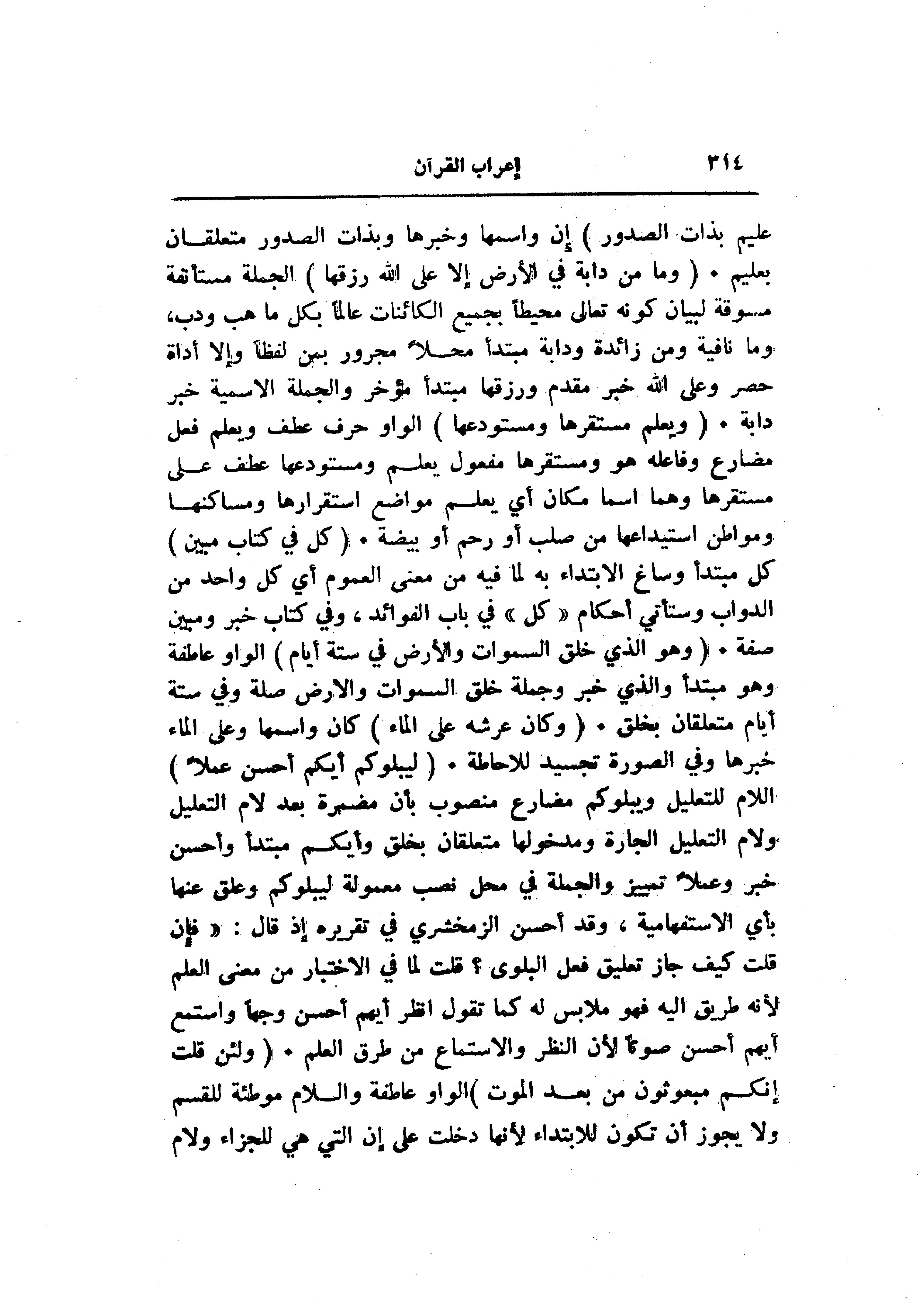 إن واسمها وخبرها وبذات الصدور متعلقان بعليم. (وَما مِنْ دَابَّةٍ فِي الْأَرْضِ إِلَّا عَلَى اللَّهِ رِزْقُها) الجملة مستأنفة مسوقة لبيان كونه تعالى محيطا بجميع الكائنات عالما بكل ما هب ودب، وما نافية ومن زائدة ودابة مبتدأ محلا مجرور بمن لفظا وإلا أداة حصر وعلى الله خبر مقدم ورزقها مبتدأ مؤخر والجملة الاسمية خبر دابة. (وَيَعْلَمُ مُسْتَقَرَّها وَمُسْتَوْدَعَها) الواو حرف عطف ويعلم فعل مضارع وفاعله هو ومستقرها مفعول يعلم ومستودعها عطف على مستقرها وهما اسما مكان أي يعلم مواضع استقرارها ومساكنها ومواطن استيداعها من صلب أو رحم أو بيضة. (كُلٌّ فِي كِتابٍ مُبِينٍ) كل مبتدأ وساغ الابتداء به لما فيه من معنى العموم أي كل واحد من الدواب وستأتي أحكام «كل» في باب الفوائد، وفي كتاب خبر ومبين صفة. (وَهُوَ الَّذِي خَلَقَ السَّماواتِ وَالْأَرْضَ فِي سِتَّةِ أَيَّامٍ) الواو عاطفة وهو مبتدا والذي خبر وجملة خلق السموات والأرض صلة وفي ستة أيام متلقان بخلق. (وَكانَ عَرْشُهُ عَلَى الْماءِ) كان واسمها وعلى الماء خبرها وفي الصورة تجسيد للاحاطة. (لِيَبْلُوَكُمْ أَيُّكُمْ أَحْسَنُ عَمَلًا) اللام للتعليل ويبلوكم مضارع منصوب بأن مضمرة بعد لام التعليل ولام التعليل الجارة ومدخولها متعلقان بخلق وأيكم مبتدأ وأحسن خبر وعملا تمييز والجملة في محل نصب معمولة ليبلوكم وعلق عنها بأي الاستفهامية، وقد أحسن الزمخشري في تقريره إذ قال: «فإن قلت كيف جاز تعليق فعل البلوى؟ قلت لما في الاختبار من معنى العلم لأنه طريق اليه فهو ملابس له كما تقول انظر أيهم أحسن وجها واستمع أيهم أحسن صوتا لأن النظر والاستماع من طرق العلم. (وَلَئِنْ قُلْتَ إِنَّكُمْ مَبْعُوثُونَ مِنْ بَعْدِ الْمَوْتِ) الواو عاطفة واللام موطئة للقسم ولا يجوز أن تكون للابتداء لأنها دخلت على إن التي هي للجزاء ولام