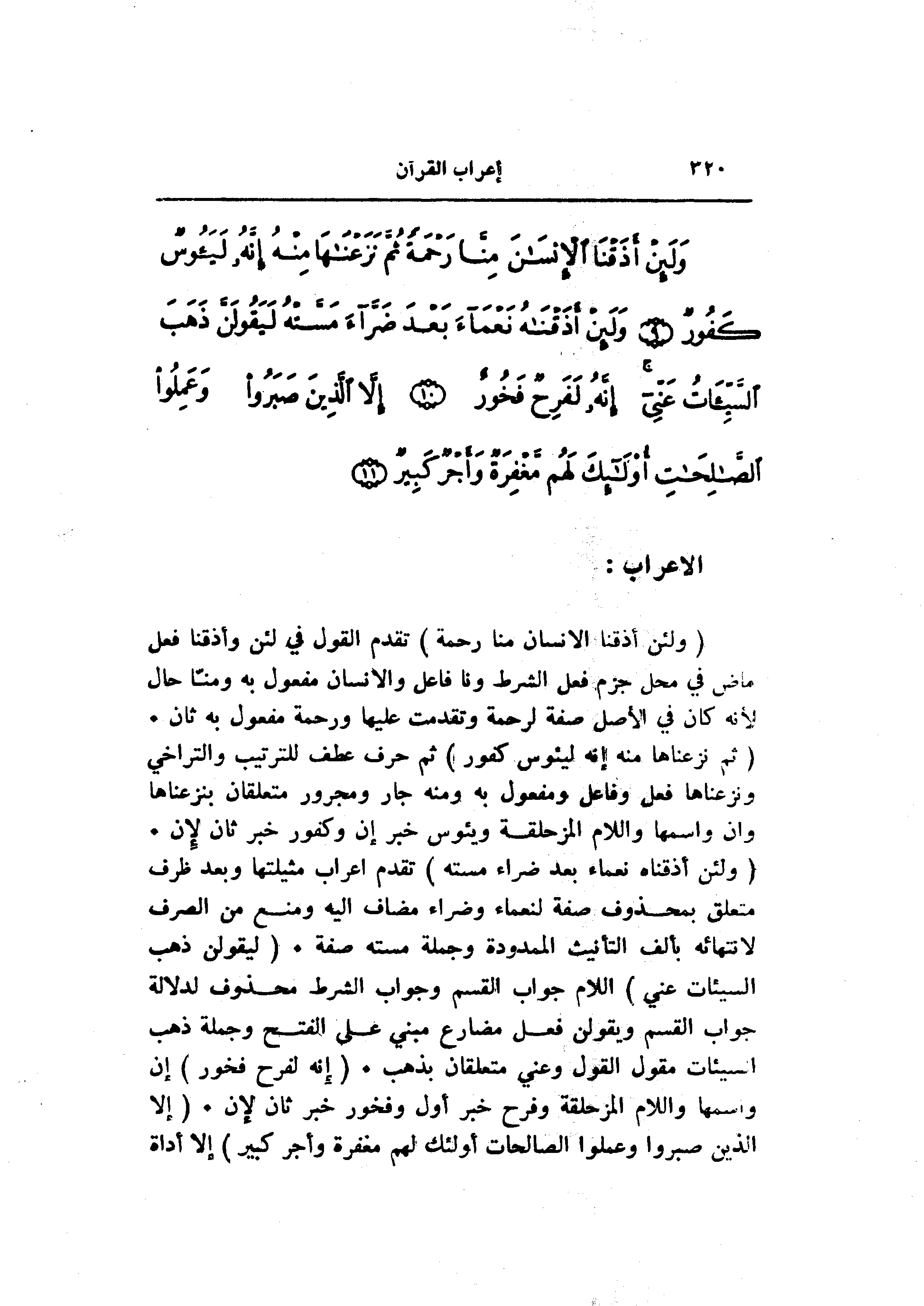 (وَلَئِنْ أَذَقْناهُ نَعْماءَ بَعْدَ ضَرَّاءَ مَسَّتْهُ) تقدم اعراب مثيلتها وبعد ظرف متعلق بمحذوف صفة لنعماء وضراء مضاف اليه ومنع من الصرف لانتهائه بألف التأنيث الممدودة وجملة مسته صفة. (لَيَقُولَنَّ ذَهَبَ السَّيِّئاتُ عَنِّي) اللام جواب القسم وجواب الشرط محذوف لدلالة جواب القسم ويقولن فعل مضارع مبني على الفتح وجملة ذهب السيئات مقول القول وعني متعلقان بذهب. (إِنَّهُ لَفَرِحٌ فَخُورٌ) إن واسمها واللام المزحلقة وفرح خبر أول وفخور خبر ثان لإن. (إِلَّا الَّذِينَ صَبَرُوا وَعَمِلُوا الصَّالِحاتِ أُولئِكَ لَهُمْ مَغْفِرَةٌ وَأَجْرٌ كَبِيرٌ) إلا أداة