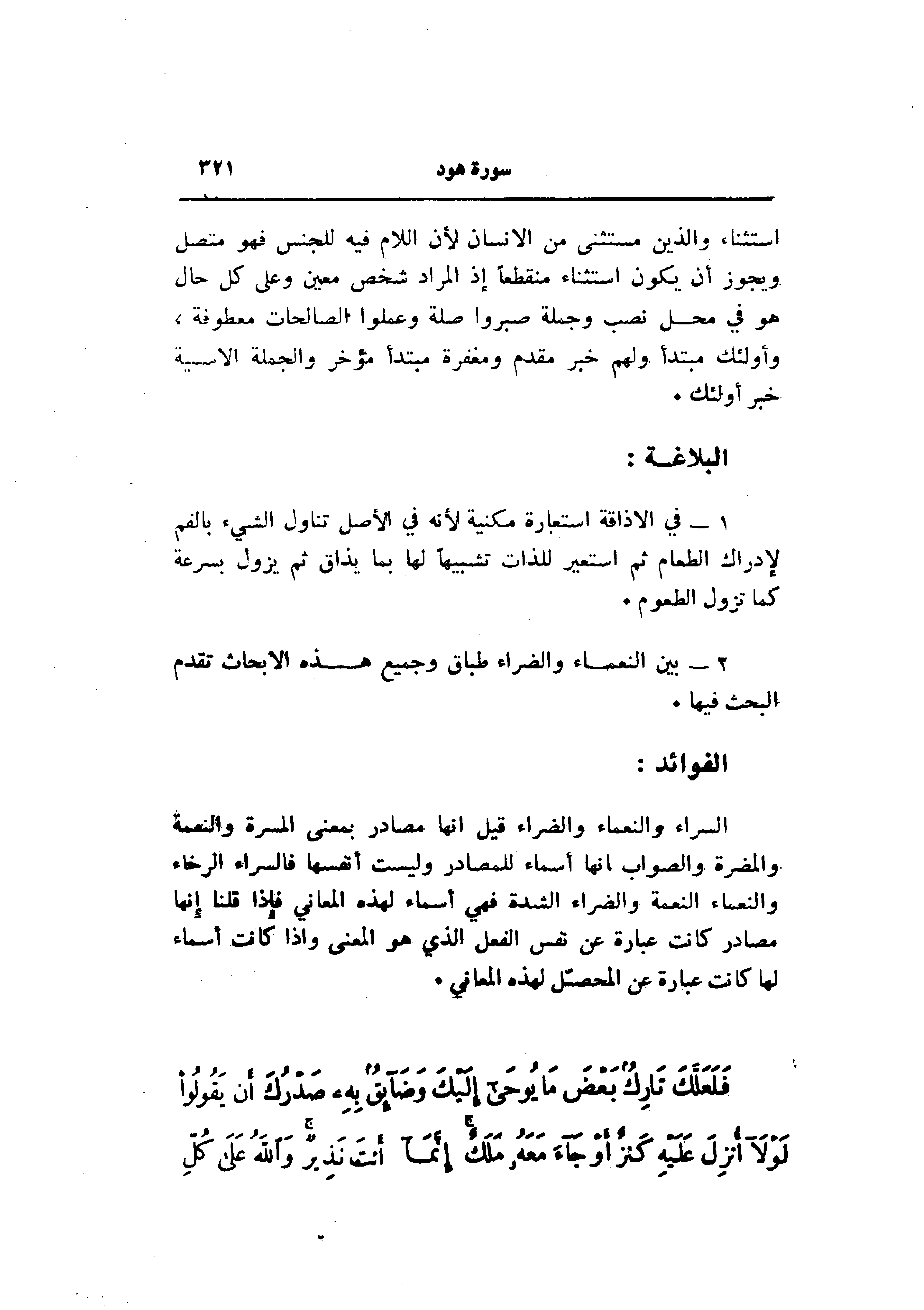 السراء والنعماء والضراء قيل انها مصادر بمعنى المسرة والنعمة والمضرة والصواب انها أسماء للمصادر وليست أنفسها فالسراء الرخاء والنعماء النعمة والضراء الشدة فهي أسماء لهذه المعاني فإذا قلنا إنها مصادر كانت عبارة عن نفس الفعل الذي هو المعنى وإذا كانت أسماء لها كانت عبارة عن المحصّل لهذه المعاني.