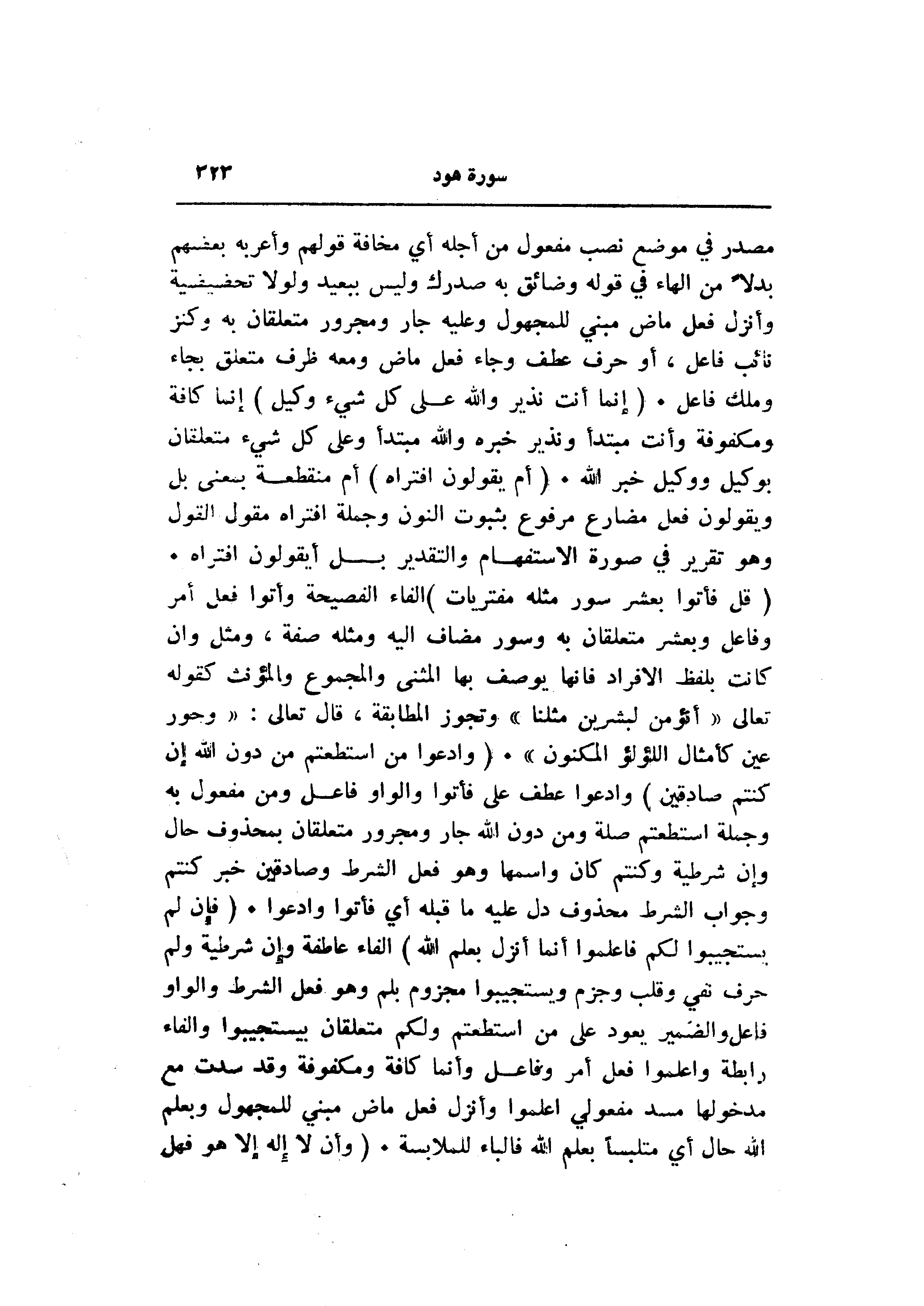 (قُلْ فَأْتُوا بِعَشْرِ سُوَرٍ مِثْلِهِ مُفْتَرَياتٍ) الفاء الفصيحة وأتوا فعل أمر وفاعل وبعشر متعلقان به وسور مضاف اليه ومثله صفة، ومثل وان كانت بلفظ الافراد فانها يوصف بها المثنى والمجموع والمؤنث كقوله تعالى «أنؤمن لبشرين مثلنا» وتجوز المطابقة، قال تعالى: «وحور عين كأمثال اللؤلؤ المكنون» . (وَادْعُوا مَنِ اسْتَطَعْتُمْ مِنْ دُونِ اللَّهِ إِنْ كُنْتُمْ صادِقِينَ) وادعوا عطف على فأتوا والواو فاعل ومن مفعول به وجملة استطعتم صلة ومن دون الله جار ومجرور متعلقان بمحذوف حال وإن شرطية وكنتم كان واسمها وهو فعل الشرط وصادقين خبر كنتم وجواب الشرط محذوف دل عليه ما قبله أي فأتوا وادعوا. (فَإِلَّمْ يَسْتَجِيبُوا لَكُمْ فَاعْلَمُوا أَنَّما أُنْزِلَ بِعِلْمِ اللَّهِ) الفاء عاطفة وإن شرطية ولم حرف نفي وقلب وجزم ويستجيبوا مجزوم بلم وهو فعل الشرط والواو فاعل والضمير يعود على من استطعتم ولكم متعلقان بيستجيبوا والفاء رابطة واعلموا فعل أمر وفاعل وأنما كافة ومكفوفة وقد سدت مع مدخولها مسد مفعولي اعلموا وأنزل فعل ماض مبني للمجهول وبعلم الله حال أي متلبسا بعلم الله فالباء للملابسة. (وَأَنْ لا إِلهَ إِلَّا هُوَ فَهَلْ