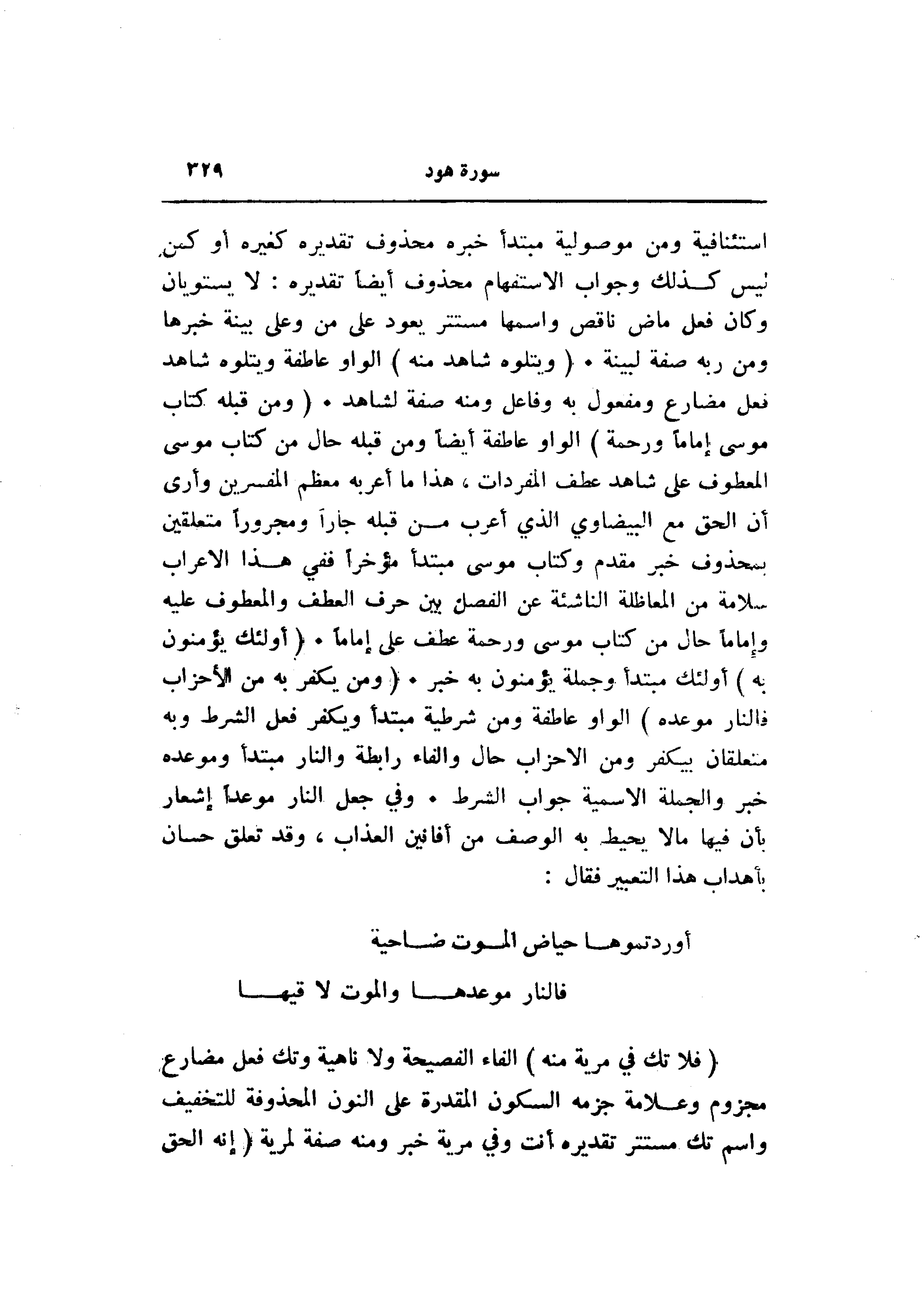 استئنافية ومن موصولية مبتدأ خبره محذوف تقديره كغيره أو كمن ليس كذلك وجواب الاستفهام محذوف أيضا تقديره: لا يستويان وكان فعل ماض ناقص واسمها مستتر يعود على من وعلى بينة خبرها ومن ربه صفة لبينة. (وَيَتْلُوهُ شاهِدٌ مِنْهُ) الواو عاطفة ويتلوه شاهد فعل مضارع ومفعول به وفاعل ومنه صفة لشاهد. (وَمِنْ قَبْلِهِ كِتابُ مُوسى إِماماً وَرَحْمَةً) الواو عاطفة أيضا ومن قبله حال من كتاب موسى المعطوف على شاهد عطف المفردات، هذا ما أعربه معظم المفسرين وأرى أن الحق مع البيضاوي الذي أعرب من قبله جارا ومجرورا متعلقين بمحذوف خبر مقدم وكتاب موسى مبتدأ مؤخرا ففي هذا الإعراب سلامة من المعاظلة الناشئة عن الفصل بين حرف العطف والمعطوف عليه وإماما حال من كتاب موسى ورحمة عطف على إماما. (أُولئِكَ يُؤْمِنُونَ بِهِ) أولئك مبتدأ وجملة يؤمنون به خبر. (وَمَنْ يَكْفُرْ بِهِ مِنَ الْأَحْزابِ فَالنَّارُ مَوْعِدُهُ) الواو عاطفة ومن شرطية مبتدأ ويكفر فعل الشرط وبه متعلقان بيكفر ومن الأحزاب حال والفاء رابطة والنار مبتدأ وموعده خبر والجملة الاسمية جواب الشرط. وفي جعل النار موعدا إشعار بأن فيها ما لا يحيط به الوصف من أفانين العذاب، وقد تعلق حسان بأهداب هذا التعبير فقال: