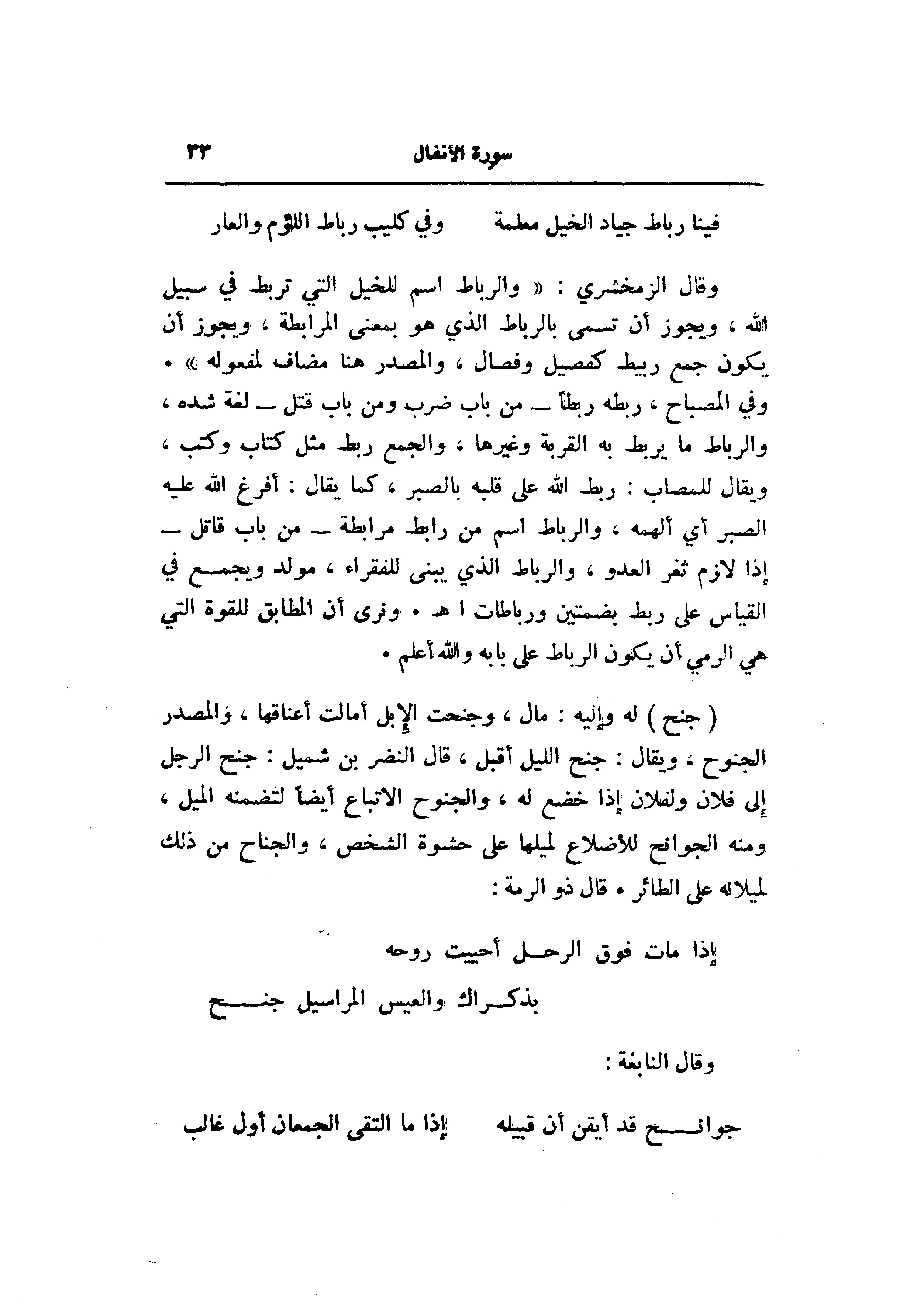 وفي المصباح، ربطه ربطا- من باب ضرب ومن باب قتل- لغة شده، والرباط ما يربط به القربة وغيرها، والجمع ربط مثل كتاب وكتب، ويقال للمصاب: ربط الله على قلبه بالصبر، كما يقال: أفرغ الله عليه الصبر أي ألهمه، والرباط اسم من رابط مرابطة- من باب قاتل- إذا لازم ثغر العدو، والرباط الذي يبنى للفقراء، مولد ويجمع في القياس على ربط بضمتين ورباطات اهـ. ونرى أن المطابق للقوة التي هي الرمي أن يكون الرباط على بابه والله أعلم.