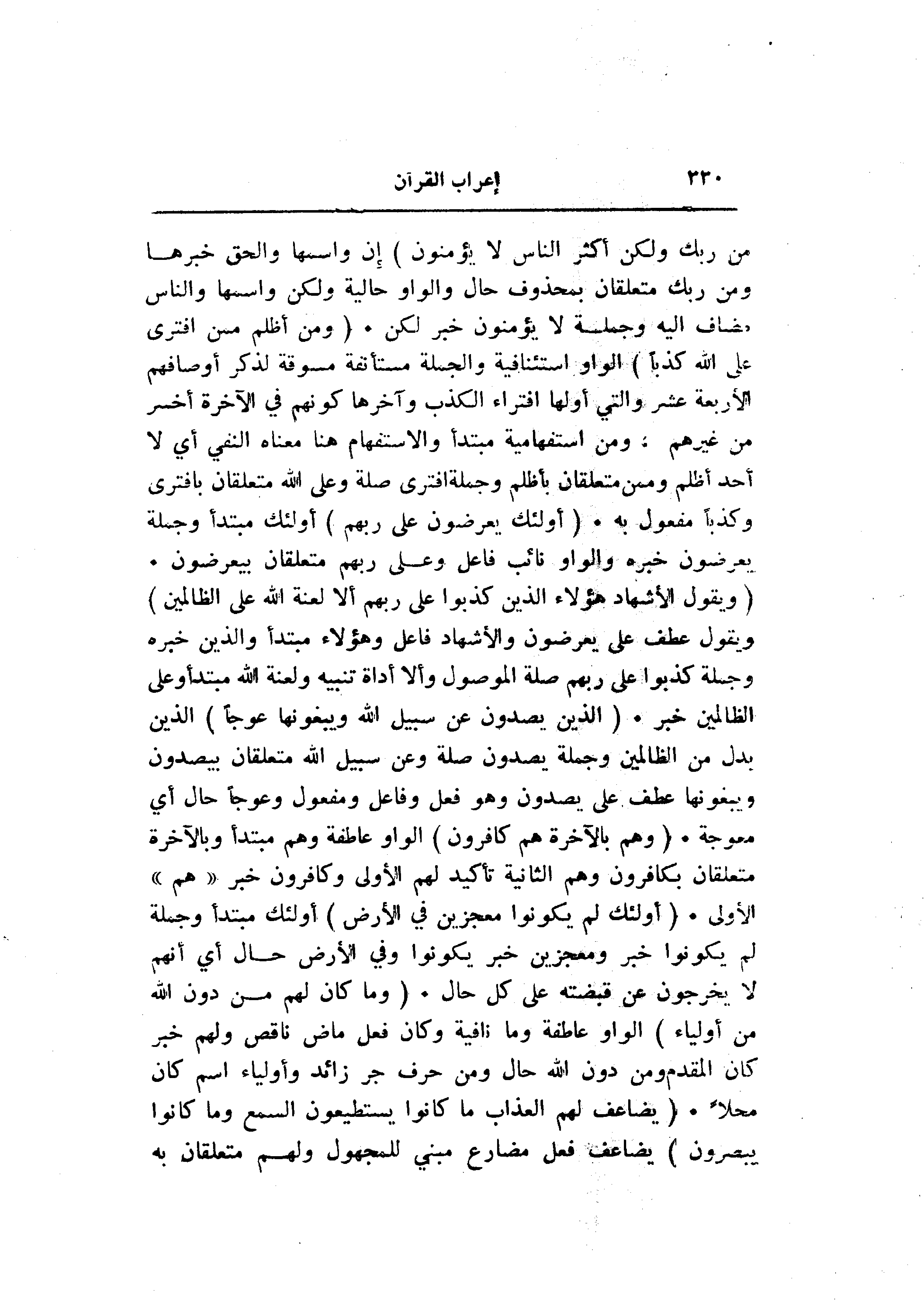 إن واسمها والحق خبرها ومن ربك متعلقان بمحذوف حال والواو حالية ولكن واسمها والناس مضاف اليه وجملة لا يؤمنون خبر لكن. (وَمَنْ أَظْلَمُ مِمَّنِ افْتَرى عَلَى اللَّهِ كَذِباً) الواو استئنافية والجملة مستأنفة مسوقة لذكر أوصافهم الأربعة عشر والتي أولها افتراء الكذب وآخرها كونهم في الآخرة أخسر من غيرهم، ومن استفهامية مبتدأ والاستفهام هنا معناه النفي أي لا أحد أظلم وممن متعلقان بأظلم وجملة افترى صلة وعلى الله متعلقان بافترى وكذبا مفعول به. (أُولئِكَ يُعْرَضُونَ عَلى رَبِّهِمْ) أولئك مبتدأ وجملة يعرضون خبره والواو نائب فاعل وعلى ربهم متعلقان بيعرضون.