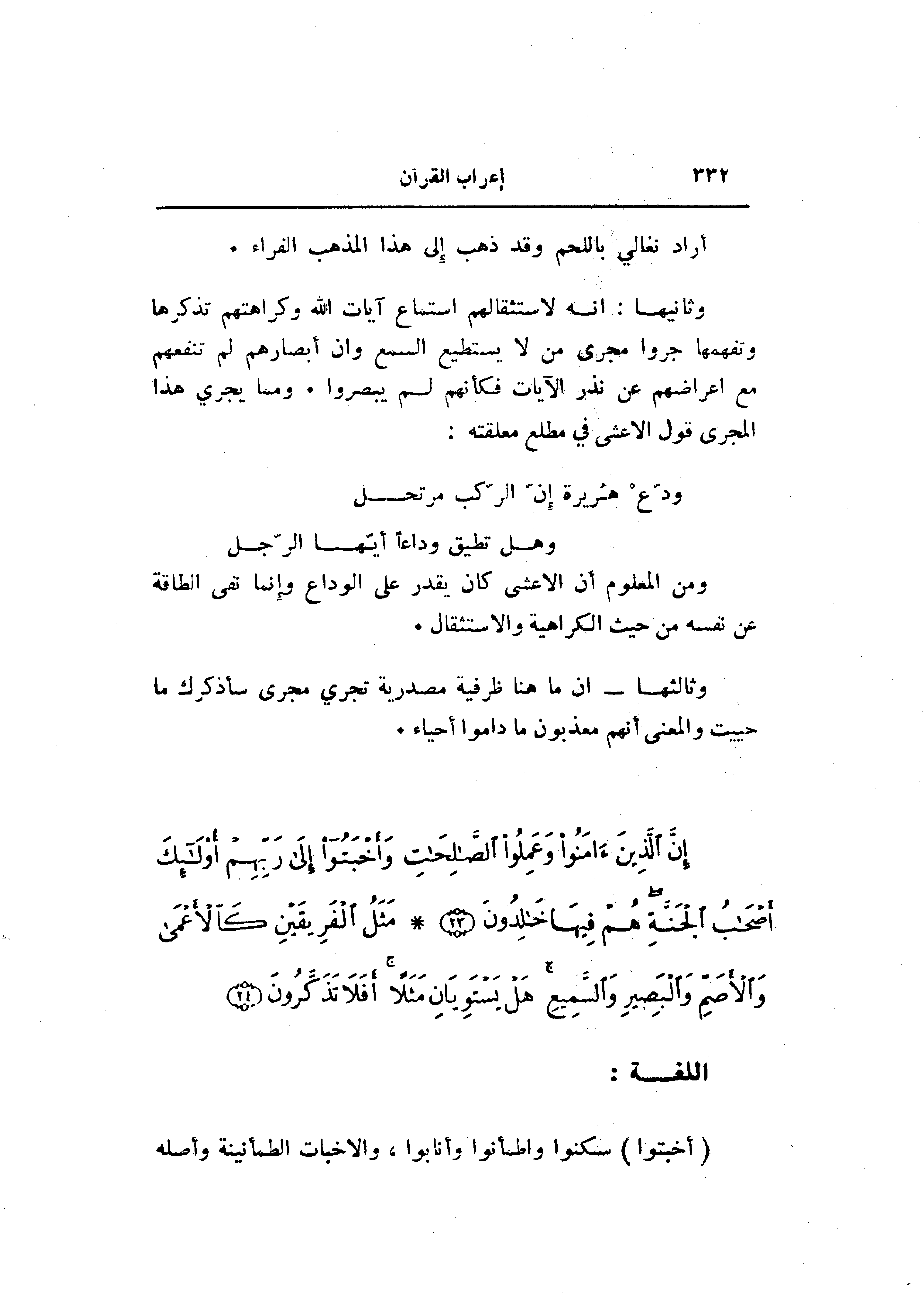 وثانيها: انه لاستثقالهم استماع آيات الله وكراهتهم تذكرها وتفهمها جروا مجرى من لا يستطيع السمع وان أبصارهم لم تنفعهم مع اعراضهم عن نذر الآيات فكأنهم لم يبصروا. ومما يجري هذا المجرى قول الأعشى في مطلع معلقته: