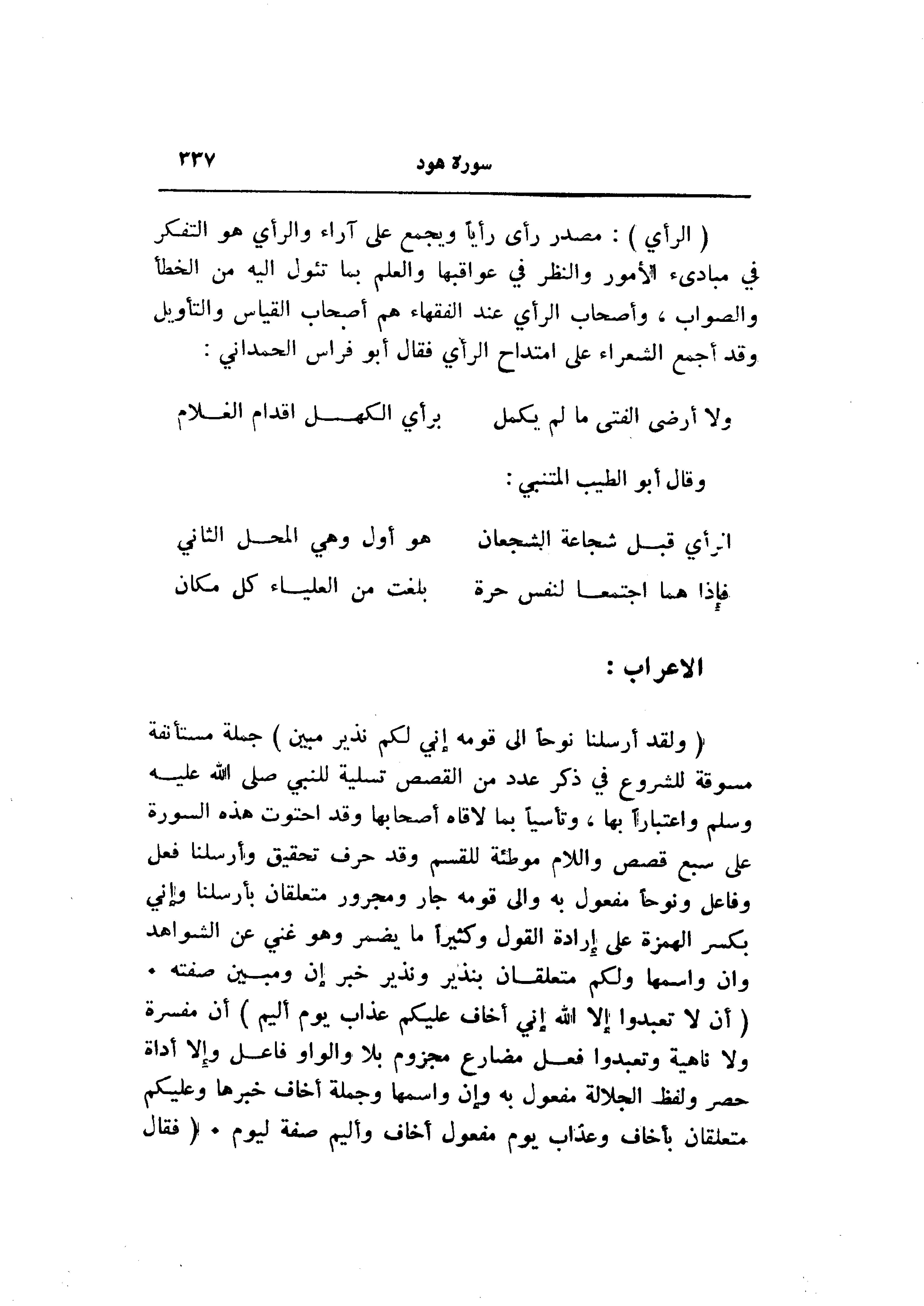 (أَنْ لا تَعْبُدُوا إِلَّا اللَّهَ إِنِّي أَخافُ عَلَيْكُمْ عَذابَ يَوْمٍ أَلِيمٍ) أن مفسرة ولا ناهية وتعبدوا فعل مضارع مجزوم بلا والواو فاعل وإلا أداة حصر ولفظ الجلالة مفعول به وإن واسمها وجملة أخاف خبرها وعليكم متعلقان بأخاف وعذاب يوم مفعول أخاف وأليم صفة ليوم. (فَقالَ